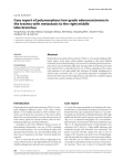 Thoracic Cancer ISSN 1759-7706 CASE REPORT Case report of polymorphous low-grade adenocarcinoma in the trachea with metastasis to the right middle lobe bronchus Yong Zhang1, Chunbao Wang2, Guangjian Zhang1, Zhe Wang1, Xiaopeng Wen1, Xiaomei Yang3, Jiangtao You1 & Junke Fu1 1 Department of Thoracic Surgery, the First Affiliated Hospital of Xi’an Jiaotong University, Xi’an, Shannxi Province, China 2 Department of Pathology, the First Affiliated Hospital of Xi’an Jiaotong University, Xi’an, Shannxi Province, China 3 Hospital 521 of China’s Ordnance Industry Group, Xi’an, Shannxi Province, China Keywords Adenoid cystic carcinoma; bronchus; misdiagnose; polymorphous low-grade adenocarcinoma; trachea. Correspondence Junke Fu, Department of Thoracic Surgery, the First Affiliated Hospital of Xi’an Jiaotong University, Xi’an 710061, Shannxi Province, China. Tel: +86 29 85323864 Fax: +86 29 85323864 Email: fujunk-6612@126.com Abstract Polymorphous low-grade adenocarcinoma (PLGA) is a low-grade malignant infiltrative tumor of the minor salivary glands. According to data from PubMed (National Center for Biotechnology), one case of PLGA involving the left main bronchus and one case involving the right main and upper lobar bronchi have previously been reported. Here, we describe the first case of PLGA originating in the trachea with metastasis to the right middle lobe bronchus, all initially misdiagnosed as adenoid cystic carcinoma (ACC). It is particularly important to distinguish this tumor from other types of salivary gland tumors, especially ACC. Complete surgical excision is the curative treatment of choice for PLGA. Received: 26 June 2014; Accepted: 25 July 2014. doi: 10.1111/1759-7714.12157 Thoracic Cancer 6 (2015) 220–223 Introduction Case report Polymorphous low-grade adenocarcinoma (PLGA) is a lowgrade malignant infiltrative tumor of the minor salivary glands.1 It was initially described in 1983 as lobular carcinoma1 and terminal duct carcinoma2 of the minor salivary gland. The term polymorphous low-grade adenocarcinoma of minor salivary glands was coined in 1984 to reflect its morphological appearance and clinical behavior.3 According to data from PubMed (National Center for Biotechnology Information), one case of PLGA involving the left main bronchus,4 one case involving the right main and upper lobar bronchi,5 one case involving the lungs,6 and three cases of metastases to the lung7–9 have previously been reported. Here, we report the first case of PLGA originating in the trachea with metastasis to the right middle lobe bronchus, all initially misdiagnosed as adenoid cystic carcinoma (ACC). A 53-year-old woman presented to our hospital with a fourmonth history of intermittent hemoptysis and shortness of breath. Bronchoscopic examination revealed a 1.5-cm endobronchial mass that partly occluded the distal part of the right middle lobe bronchus and an operative scar below the glottis (Fig. 1a, b). A computed tomography (CT) scan and threedimensional CT reconstruction of the chest confirmed a mass (Fig. 1c, d). Endobronchial biopsy revealed adenoid cystic carcinoma (ACC) (Fig. 2a). A right middle lobectomy and mediastinal lymph node dissection were performed. The patient recovered well after surgery. The mass to the cut margin of the bronchus measured 0.8 cm. Histopathologically, the bronchial cut margin was free from tumor infiltration, and there was no evidence of tumor invasion to the visceral pleura, the lymphovascular structures or the perineural structures. There were a total of six dissected lymph, 220 Thoracic Cancer 6 (2015) 220–223 © 2014 The Authors. Thoracic Cancer published by Tianjin Lung Cancer Institute and Wiley Publishing Asia Pty Ltd This is an open access article under the terms of the Creative Commons Attribution-NonCommercial License, which permits use, distribution and reproduction in any medium, provided the original work is properly cited and is not used for commercial purposes. Y. Zhang et al. Polymorphous low-grade adenocarcinoma Figure 1 (a) Bronchoscopic examination revealed an operative scar below the glottis (abnormal healing after the tracheal tumorectomy). (b/d) Bronchoscopic examination and three-dimensional computed tomography reconstruction demonstrated a mass in the distal part of the right middle lobe bronchus. (c) A computed tomography CT scan showed atelectasis of the right middle lobe. (e-g) Positron emission tomography (PET)-CT scans (2010, 2012, 2013) demonstrated two masses in the medial segment of the right middle lobe. Figure 2 (a) Endobronchial biopsy of the right middle lobe bronchus. (b–f) Histopathological examination after right middle lobectomy. (b–e) The organizational structure of the tumor cells is diversiform, including solid, complex adenoid, papillary, and sieve-like structure. (f) The transitional region, from the cell enrichment region to the structurally diverse region. (g) Endotracheal biopsy. (h–j) Histopathological examination after tracheal tumorectomy. Thoracic Cancer 6 (2015) 220–223 © 2014 The Authors. Thoracic Cancer published by Tianjin Lung Cancer Institute and Wiley Publishing Asia Pty Ltd 221 Polymorphous low-grade adenocarcinoma Y. Zhang et al. tracheobronchial, and subcarinal nodes, and all were negative for tumor invasion. Postoperative pathology also revealed ACC (Fig. 2b). Positron emission tomography (PET)-CT scans, which were regularly performed and reviewed (2010, 2012, 2013), demonstrated two masses in the medial segment of the right middle lobe (Fig. 1e–g) with no abnormity at other sites. Bronchoscopic examination revealed an operative scar below the glottis as a result of treatment performed 10 years earlier. The patient had been hospitalized with a one-year history of shortness of breath and a two-month history of blood in the sputum. A CT scan demonstrated a 1.7 cm cauliflower-like soft-tissue mass in the trachea at the level of the thyroid gland. An endotracheal biopsy re