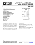 ±15 kV ESD-Protected, 3.3 V,12 Mbps, EIA RS-485/RS-422 Transceiver ADM3485E FEATURES TIA/EIA RS-485/RS-422 compliant ±15 kV ESD protection on RS-485 input/output pins 12 Mbps data rate Half-duplex transceiver Up to 32 nodes on the bus Receiver open-circuit, fail-safe design Low power shutdown current Outputs high-Z when disabled or powered off Common-mode input range: −7 V to +12 V Thermal shutdown and short-circuit protection Industry-standard 75176 pinout 8-lead narrow SOIC package FUNCTIONAL BLOCK DIAGRAM ADM3485E RO R B RE A DE DI D Power/energy metering Telecommunications EMI-sensitive systems Industrial control Local area networks 03338-001 APPLICATIONS Figure 1. GENERAL DESCRIPTION The ADM3485E is a 3.3 V, low power data transceiver with ±15 kV ESD protection, suitable for half-duplex communication on multipoint bus transmission lines. The ADM3485E is designed for balanced data transmission and complies with TIA/EIA standards RS­485 and RS-422. The ADM3485E is a half-duplex transceiver that shares differential lines and has separate enable inputs for the driver and the receiver. The devices have a 12 kΩ receiver input impedance, which allows up to 32 transceivers on a bus. Because only one driver should be enabled at any time, the output of a disabled or powered-down driver is tristated to avoid overloading the bus. The receiver has a fail-safe feature that ensures a logic high output when the inputs are floating. Excessive power dissipation caused by bus contention or by output shorting is prevented with a thermal shutdown circuit. The part is fully specified over the industrial temperature range and is available in an 8-lead narrow SOIC package. Rev. C Information furnished by Analog Devices is believed to be accurate and reliable. However, no responsibility is assumed by Analog Devices for its use, nor for any infringements of patents or other rights of third parties that may result from its use. Specifications subject to change without notice. No license is granted by implication or otherwise under any patent or patent rights of Analog Devices. Trademarks and registered trademarks are the property of their respective owners. One Technology Way, P.O. Box 9106, Norwood, MA 02062-9106, U.S.A. Tel: 781.329.4700 www.analog.com Fax: 781.461.3113 ©2006 Analog Devices, Inc. All rights reserved. ADM3485E TABLE OF CONTENTS Features .............................................................................................. 1 Test Circuits and Switching Characteristics...................................7 Applications....................................................................................... 1 Typical Performance Characteristics ..............................................9 Functional Block Diagram .............................................................. 1 Standards and Testing .................................................................... 11 General Description ......................................................................... 1 ESD Testing ................................................................................. 11 Revision History ............................................................................... 2 Applications Information .............................................................. 12 Specifications..................................................................................... 3 Differential Data Transmission ................................................ 12 Timing Specifications....................................................................... 4 Cable and Data Rate................................................................... 12 Absolute Maximum Ratings............................................................ 5 Receiver Open-Circuit Fail-Safe............................................... 12 Thermal Resistance ...................................................................... 5 Outline Dimensions ....................................................................... 13 ESD Caution.................................................................................. 5 Ordering Guide .......................................................................... 13 Pin Configuration and Pin Function Descriptions...................... 6 REVISION HISTORY 12/06—Rev. B to Rev. C Updated Format..................................................................Universal Removed PDIP Model .......................................................Universal Changes to Features, Applications, and General Description .... 1 Changes to Specifications ................................................................ 3 Changes to Timing Specifications .................................................. 4 Changes to Absolute Maximum Ratings ....................................... 5 Reorganized Test Circuits and Switching Characteristics Section..................................................................... 7 Replaced Figure 3 to Figure 11 ....................................................... 7 Deleted Figure 12 to Figure 14........................................................ 8 Changes to Figure 15 to Figure 20.................................................. 9 Changes to Figure 21 and Figure 22............................................. 10 Changes to Table 9.......................................................................... 11 Deleted Figure 24............................................................................ 11 Removed Fast Transient Burst Immunity (IEC1000-4-4) Section ................................................................... 12 Updated Outline Dimensions ....................................................... 13 Changes to Ordering Guide .......................................................... 13 10/04—Rev. A to Rev. B Updated Format..................................................................Universal Changes to Power-Supply Current, Table 1 ..........................