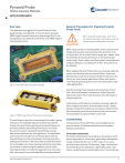 Pyramid Probe Online Cleaning Methods APPLICATION NOTE Overview This application note applies to Pyramid Probes® with a plastic plunger assembly (Fig. 1). To learn about cleaning a P800-S type Pyramid Probe with a steel plunger (Fig. 2), see the application note titled Pyramid Probe Card: P800-S Online Cleaning Instructions. General Precautions for Cleaning Pyramid Probe Cards When cleaning Pyramid Probes, never move the cleaning substrate in the XY-plane when the substrate and the probe tips are in contact. When using a prober or cleaning station, never clean Pyramid Probes by moving the cleaning chuck back-and-forth in the XY-plane when it is in contact with the probe tips. Instead, clean the probe tips by touching them down on the cleaning substrate using a Z-axis motion only. Many probers and probe card analyzers default to a scrubbing X-Y motion. This action must be disabled. Figure 1. Pyramid Probe with a plastic plunger. When stepping Pyramid Probes down on a cleaning substrate, use an overtravel that does not exceed 250 μm. Overtravel between 35 μm and 75 μm has been found to work best in the factory for most cleaning applications. Higher overtravel is more likely to generate particles from the cleaning film, especially lapping films. Step the cleaning chuck at least 2x the tip diameter in the X and Y directions between touchdowns to ensure the probe tips always contact fresh material and an even distribution of abrasive particles. Figure 2. P800-S type Pyramid Probe with a steel plunger. Pyramid Probes may collect contaminants that make cleaning necessary. The cleaning frequency and intensity required to keep a Pyramid Probe operating at its peak efficiency are primarily related to the probing environment. As a result, the exact formula for cleaning Pyramid Probes must be determined individually for each application. This application note starts with some general comments about cleaning Pyramid Probes and the contaminants that may be found in probing environments. It then describes Cascade Microtech’s recommendations for online cleaning methods and describes a procedure for determining the optimum value of online cleaning parameters. Finally, this application note concludes with a discussion of recommended offline cleaning methods. www.cascademicrotech.com Cleaning Pyramid Probes by contacting a cleaning substrate takes multiple touchdowns to achieve good results. Usually, between 10 and 30 touchdowns are necessary. Experiment to find the cleaning count that works best in your environment. Ten touchdowns is a good number to start with. Contaminants Contaminants on Pyramid Probes can be divided into two general classes: Particulate contaminants and resistive buildup contaminants. Particulate contaminants Particulate contamination can build up on the probe face and tips during probing. In some cases, particulate contamination may go unnoticed by the user. In other cases, it can cause persistent open channels. Furthermore, large, hard particles are a leading cause of premature, catastrophic probe-card failure, usually brought on by damaging one or more probe tips. 1 Pyramid Probe: Online Cleaning Methods Figures 3 through 6 present examples of particulate contamination and its effects: Figure 3. Particle on tip, likely open. Figure 4. Repeating particle indent, near miss. Figure 5. Deep particle indent, three open traces. Figure 6. Particle hit, probe tip damaged. Resistive buildup contaminants (organics, oxides) Resistive buildup contaminants accumulate on the probe tips during probing. To maintain high yield, these contaminants must be removed by abrasive cleaning. For best results, this contamination should be removed preventively. Resistive buildup contaminants do not usually damage probe tips directly. However, in response to the increasing contact resistance caused by this buildup, users may choose to increase overtravel — which stresses the probe tips and can cause premature probe failure. Pyramid Probe tips do not typically experience as much resistive contaminant buildup as other probe technologies. The patented MicroScrub® action of Pyramid Probes penetrates the metal oxides and cleans the probe tips with each contact (Fig. 7). Once they have been transferred to the membrane, particles are best removed by offline brush cleaning using the cleaning brush provided by Cascade Microtech. Refer to Cascade Microtech’s application note, Pyramid Probe Core Off-line Cleaning With a Brush. However, the best solution for particulate contamination is to remove the particles at their source. Many simple actions can protect Pyramid Probe cards from particulate damage. Figure 7. Clean probe tip. • DO probe in a cleanroom environment • DO wash wafers immediately before probe (especially after laser-scribe operations) • DO use extreme caution when probing correlation wafers • DO regular preventative maintenance to clean the wafer area of the prober • DO NOT load or unload probe cards with the wafer on the chuck • DO NOT share brushes between Pyramid Probes and other probe card technologies • DO NOT probe wafers that have been stored in a dirty or questionable environment • DO NOT touch the membrane, even with gloved hands www.cascademicrotech.com 2 Pyramid Probe: Online Cleaning Methods Yet, when a buildup does occur, it typically appears as a discoloration on the probe tip (Fig. 8 and Fig. 9). Figure 10. Solder buildup. Figure 8. Aluminum buildup. Recommended Online Cleaning Methods and Materials Abrasive cleaning media Online cleaning by touching down on an abrasive is the most effective way to control contact resistance (Rc) and to clean resistive buildup off Pyramid Probe tips. Abrasive cleaning media can be divided into four categories: 1. Lapping films 2. Abrasive loaded elastomers 3. Coated foams 4. Soft-backed lapping films Cascade Microtech recommends lapping films, abrasive loaded elastomers and coated foams as the cleaning media. Soft-backed lapping fi