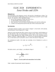 Zener Diodes and LED's Rev. 6/11/09 ELEC 2020 EXPERIMENT 6 Zener Diodes and LED's Objectives: The experiments in this laboratory exercise will provide an introduction to diodes. You will use the Bit Bucket breadboarding system to build and test several DC and AC diode circuits. The objectives of this experiment include: • Review basic principles of diodes from ELEC 2210 • An understanding of diode rectifier circuits • More experience with the Bit Bucket breadboarding system and the oscilloscope • Continue to develop professional lab skills and written communication skills. Introduction A thorough treatment of diodes can be found in Chapter 3 of the ELEC 2210 textbook, Microelectronics Circuit Design by R.C. Jaeger. Diodes are circuit elements that allow current to pass in one direction, while blocking it in the other direction. They are used primarily in rectifier circuits, which convert AC to DC, and in voltage regulation and voltage limiting circuits. They are also sometimes used to produce a fixed DC voltage drop (approx. 0.7 volts for Si p-n junction diodes). In the latter case, several diodes may be connected in series to achieve the desired voltage drop. The mathematical model of the diode (not including reverse breakdown) is given in Equation 1: iD= I S (−1 + e vD nVT ) [1] The diode current iD, and voltage, vD are defined in Figure 1. + vD – cathode anode iD Figure 1. Circuit symbol and nomenclature for the diode. Table 1 explains the parameters found in Equation 1. 1 Zener Diodes and LED's Rev. 6/11/09 Table1. Diode equation parameters. Symbol Name IS Saturation current n Nonideality factor VT Thermal voltage Meaning Typical value(s) PSPICE Default Ideal maximum reverse current. Also the scale factor for forward current. Proportional to junction area. Corrects for manufacturing variations and temperature uncertainty. 10–18 to 10–9 A 10–14A 1.0 to 2.0 1.0 This parameter has units of voltage and is proportional to absolute temperature. 25 mV “at room temp.” 25.86 mV (27 oC) From equation 1, we can see that the diode current increases nearly exponentially as the diode voltage becomes more positive (forward bias), but the current is asymptotically limited to –IS when vD is negative (reverse bias). If the diode is forward biased substantially, Equation 1 can be simplified to a pure exponential, and then near room temperature we can deduce the “60 mV per decade” rule, which says that vD increases approximately 60 mV for every factor of 10 increase in iD. In addition to the behavior described by Equation 1, all diodes have a reverse breakdown voltage, VBR, at which significant reverse current will begin to flow. For many applications, it is desirable to have VBR be as large as possible. Values of VBR = 1000 V are not uncommon for small-signal rectifier diodes. For other applications, such as voltage regulation, we require relatively low reverse breakdown voltages, such as 5 V or 9 V. For these applications, we use Zener diodes. The reverse characteristics of a typical Zener diode are shown in Figure 2. iD VZ VZK vD IZK Slope 1 Slope 2 IZ Figure 2. Piecewise linear approximation of the reverse characteristics of a Zener diode. The Zener knee resistance is R ZK = 1 Slope 1 2 Zener Diodes and LED's Rev. 6/11/09 and the Zener resistance is RZ = 1 Slope 2 Typcial values of RZ are on the order of 10 ohms. Real diodes have series resistance and junction capacitance which affect their behavior in circuits at higher currents and higher frequencies. Furthermore, IS is a strong function of temperature. These effects will not be considered in this lab experiment. An important simple model for the diode is the piecewise linear (PWL) model, illustrated in Figure 3. iD –VZ VON vD Figure 3. Piecewise linear (PWL) diode model. Figure 4 shows a series DC circuit with a diode. +VD I + VR - Figure 4. Series circuit including a diode. When the circuit is connected, the diode will operate at a Q-point (I, VD) determined by the intersection of the diode characteristic curve and the load line. The load line is established by the values of VDC and R. The circuit must satisfy Kirchhoff’s Voltage Law (KVL), such that VD + VR = VDC. If the source is changed to an AC voltage source, current will flow in only the forward direction through the diode, as long as the peak negative value of the voltage does not exceed the reverse breakdown voltage of the diode. In this case, vR(t) will never be negative, thus the AC voltage is said to be rectified. 3 Zener Diodes and LED's Rev. 6/11/09 Pre-Lab: (1) Obtain the data sheet for the 1N4733 Zener diode from the class web site, or from http://www.fairchildsemi.com/pf/1N/1N4733A.html Use this to determine the values of VZ, IZ, IZK, RZ, and RZK. Note that the datasheet uses the letter Z (impedance) instead of R (resistance). (2) Determine an expression for the RMS value of (a) a sine wave with peak value VP, and (b) a half-wave rectified sine wave with peak value VP. You may obtain these either by direct calculation, or by looking them up in any resource you choose. (3) Look up the “turn-on” voltage for red LED’s and green LED’s. Lab Exercise: There are four parts. Have your GTA sign off on each part before proceeding to the next part. (1) Fuse check, current measurement with the DMM, and verifying Ohm's law. In this part, you will learn how to measure current with the digital multimeter (DMM). You will also check to make sure the DMM fuse is not blown. (a) Identify the variable +15 VDC supply on the Bit Bucket. The output terminal is labeled 0~+15 as shown in the photo. Set the knob to Min. (fully CCW). (b) Connect this output to the + input on the Bit Bucket's DVM. Connect the – input on the DVM to ground. Turn the 15V supply knob and verify that the voltage changes as expected. Record the minimum and maximum values. (c) Turn off the Bit Bucket Power, and adjust the variable voltage knob back to Min. (d) Obtain and measure a 100 ohm, 