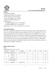 IT138 3-to-8 line decoder/demultiplexer Feature ● Demultiplexing capability Multiple input enable for easy expansion ● Ideal for memory chip select decoding ● Active LOW mutually exclusive outputs ● Complies with JEDEC standard no. 7A ● ESD protection: HBM EIA/JESD22-A114-C exceeds 2000 V MM EIA/JESD22-A115-A exceeds 200 V ● Specified from - 40 °C to +85 °C and from - 40 °C to +125 °C ● General Description The IT138 is a high-speed CMOS device. IT138 decoder accepts three binary weighted address inputs (A0, A1 and A3) and when enabled, provides 8 mutually exclusive active LOW outputs (Y’0 to Y’7). It features three enable inputs: two active LOW (E’1 and E’2) and one active HIGH (E3). Every output will be HIGH unless E’1 and E’2 are LOW and E3 is HIGH. This multiple enable function allows easy parallel expansion of the IT138 to a 1-of-32 (5 lines to 32 lines) decoder with just four IT138 ICs and one inverter. IT138 can be used as an eight output demultiplexer by using one of the active LOW enable inputs as the data input and the remaining enable inputs as strobes. Non-used enable inputs must be tied to appropriate active HIGH- or LOW-state. Quick reference data Table 1: GND=0V, Tamb = 25 °C; tr = tf = 6 ns. Symbol Parameter Conditions tPHL/ tPLH Propagation delay Vcc=5V; CL=15pF Ci Min Typ Max Unit An to Yn 11 ns E3 to Yn 13 ns En to Yn 13 ns Input capacitance 4 pf 65 pf Power dissipation CPD capacitance VI=GND to Vcc 1 2011/3/13 V0.1 IT138 3-to-8 line decoder/demultiplexer Function diagram Fig1. Logic symbol Fig2. Functional diagram Fig3. Logical diagram 2 2011/3/13 V0.1 IT138 3-to-8 line decoder/demultiplexer Pin Assignment Fig4. Pin configuration in SOP-16L Pin Description Table 2: Symbol Pin Description A0 1 Address input 0 A1 2 Address input 1 A2 3 Address input 2 E'1 4 Enable input 1 (active Low) E'2 5 Enable input 2 (active Low) E3 6 Enable input 3 (active High) Y'7 7 Output 7 GND 8 Ground (0 V) Y'6 9 Output 6 Y'5 10 Output 5 Y'4 11 Output 4 Y'3 12 Output 3 Y'2 13 Output 2 Y'1 14 Output 1 Y'0 15 Output 0 Vcc 16 Positive supply voltage 3 2011/3/13 V0.1 IT138 3-to-8 line decoder/demultiplexer Functional Description Table3 H= HIGH voltage level; L= LOW voltage level; X= don't care. Control E'1 E'2 Input E3 A2 H X X X H X X X L L L H Output A1 A0 Y'7 Y'6 Y'5 Y'4 Y'3 Y'2 Y'1 Y'0 X X X H H H H H H H H L L L H H H H H H H L L L H H H H H H H L H L H L H H H H H L H H L H H H H H H L H H H H L L H H H L H H H H H L H H H L H H H H H H H L H L H H H H H H H H H L H H H H H H H Limiting Values Table 4: Voltage are referenced to GND (ground = 0 V) Symbol Parameter Vcc Supply voltage Ilk Input clamping current IOK Conditions Min Max Unit -0.5 7 V VI<-0.5V or VI>Vcc+0.5V - ± 20 mA Output clamping current Vo<-0.5V or Vo>Vcc+0.5V - ± 20 mA Io Output current Vo=-0.5V to (Vcc+0.5V) - ± 25 mA Icc Quiescent supply current - 50 mA IGND Ground current - -50 mA Tstg Storage temperature -65 150 °C Ptot Total power dissipation - 500 mW 4 2011/3/13 V0.1 IT138 3-to-8 line decoder/demultiplexer Recommended operating conditions Table5: Symbol Parameter Vcc Supply voltage Conditions Min Typ Max Unit 2 5 6 V VI Input voltage 0 - Vcc V Vo Output voltage 0 - Vcc V Tamb Ambient temperature -40 25 125 °C tr, tf Input rise and fall time Vcc=2.0V - - 1000 ns Vcc=4.5V - 6 500 ns Vcc=6.0V - - 400 ns Static Characteristics Table6: At recommended operating conditions. Voltage are referenced to GND (ground=0 V) Ta= 25°C Symbol Parameter Conditions Min Typ Max Unit VIH High-state input voltage Vcc=2.0V 1.2 1.5 - V Vcc=4.5V 2.8 3.15 - V Vcc=6.0V 3.6 4.2 - V Vcc=2.0V - 0.5 0.8 V Vcc=4.5V - 1.35 1.8 V Vcc=6.0V - 1.8 2.4 V Io=-20uA;Vcc=2.0V 1.9 2 - V Io=-20uA;Vcc=4.5V 4.4 4.5 - V Io=-20uA;Vcc=6.0V 5.9 6 - V Io=-4mA ;Vcc=4.5V 3.98 4.32 - V Io=-5.2mA;Vcc=6.0V 5.48 5.81 - V Io=20uA;Vcc=2.0V - 0 0.1 V Io=20uA;Vcc=4.5V - 0 0.1 V Io=20uA;Vcc=6.0V - 0 0.1 V Io=4mA ;Vcc=4.5V - 0.15 0.26 V Io=5.2mA;Vcc=6.0V - 0.16 0.26 V VIL VOH VOL LOW-state input voltage High-state output voltage LOW-state output voltage VI=VIH or VIL VI=VIH or VIL 5 2011/3/13 V0.1 IT138 3-to-8 line decoder/demultiplexer ILI input leakage current VI=Vcc or GND ;Vcc=6V - - 2 uA - - 2 uA - - 8 uA - 4 - pF Vcc=2.0V 1.2 1.5 - V Vcc=4.5V 2.8 3.15 - V Vcc=6.0V 3.6 4.2 - V Vcc=2.0V - 0.5 0.8 V Vcc=4.5V - 1.35 1.8 V Vcc=6.0V - 1.8 2.4 V Io=-20uA;Vcc=2.0V 1.9 - - V Io=-20uA;Vcc=4.5V 4.4 - - V Io=-20uA;Vcc=6.0V 5.9 - - V Io=-4mA ;Vcc=4.5V 3.84 - - V Io=-5.2mA;Vcc=6.0V 5.34 - - V Io=20uA;Vcc=2.0V - - 0.1 V Io=20uA;Vcc=4.5V - - 0.1 V Io=20uA;Vcc=6.0V - - 0.1 V Io=4mA ;Vcc=4.5V - - 0.33 V Io=5.2mA;Vcc=6.0V - - 0.33 V VI=Vcc or GND ;Vcc=6V - - 2 uA - - 2 uA - - 80 uA VI=VIH or VIL;Vo=Vcc or GND IOZ OFF-state output current Vcc=6V. Io=0A;VI=Vcc or GND ICC quiescent supply current Ci input capacitance Vcc=6V. Ta= -40°C ~ 85°C VIH VIL VOH VOL ILI High-state input voltage LOW-state input voltage High-state output voltage LOW-state output voltage input leakage current VI=VIH or VIL VI=VIH or VIL VI=VIH or VIL;Vo=Vcc or GND IOZ OFF-state output current Vcc=6V. Io=0A;VI=Vcc or GND ICC quiescent supply current Vcc=6V. Ta= -40°C ~ 125°C 6 2011/3/13 V0.1 IT138 3-to-8 line decoder/demultiplexer VIH VIL VOH VOL ILI High-state input voltage LOW-state input voltage High-state output voltage LOW-state output voltage input leakage current Vcc=2.0V 1.5 1.2 - V Vcc=4.5V 3.15 2.4 - V Vcc=6.0V 4.2 3.2 - V Vcc=2.0V - 0.8 0.5 V Vcc=4.5V - 2.1 1.35 V Vcc=6.0V - 2.8 1.8 V Io=-20uA;Vcc=2.0V 1.9 - - V Io=-20uA;Vcc=4.5V 4.4 - - V Io=-20uA;Vcc=6.0V 5.9 - - V Io=-4mA ;Vcc=4.5V 3.84 - - V Io=-5.2mA;Vcc=6.0V 5.34 - - V Io=20uA;Vcc=2.0V - - 0.1 V Io=20uA;Vcc=4.5V - - 0.1 V Io=20uA;Vcc=6.0V - - 0.1 V Io=4mA ;Vcc=4.5V - - 0.4 V Io=5.2mA;Vcc=6.0V - - 0.4 V 2 uA VI=VIH or VIL VI=VIH or VIL VI=Vcc or GND ;Vcc=6V VI=VIH or VIL;Vo=Vcc or GND IOZ OFF-state output current Vcc=6V. - - 2 uA - - 160 uA Io=0A;VI=Vcc or GND ICC quiescent supply current Vcc=6V. Dynamic Characteristics T