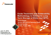 TM Internal Use Only June 13, 2012 Presentation for CTEA Symposium Freescale, the Freescale logo, AltiVec, C-5, CodeTEST, CodeWarrior, ColdFire, C-Ware, the Energy Efficient Solutions logo, mobileGT, PowerQUICC, QorIQ, StarCore and Symphony are trademarks of Freescale Semiconductor, Inc., Reg. U.S. Pat. & Tm. Off. Airfast, BeeKit, BeeStack, ColdFire+, CoreNet, Flexis, Kinetis, MagniV, MXC, Platform in a Package, Processor Expert, QorIQ Qonverge, Qorivva, QUICC Engine, Ready Play, SafeAssure, the SafeAssure logo, SMARTMOS, TurboLink, VortiQa and Xtrinsic are trademarks of Freescale Semiconductor, Inc. All other product or service names are the property of their respective owners. © 2012 Freescale Semiconductor, Inc. . • Background and Motivation • Dry Pack Storage • Sample (BGAs and QFPs) History • Component Aging • Oxide Thickness Measurement • Solderability Methodology • Testing Results • Conclusions • Recommendations Internal Use Only TM 2 Freescale, the Freescale logo, AltiVec, C-5, CodeTEST, CodeWarrior, ColdFire, C-Ware, the Energy Efficient Solutions logo, mobileGT, PowerQUICC, QorIQ, StarCore and Symphony are trademarks of Freescale Semiconductor, Inc., Reg. U.S. Pat. & Tm. Off. Airfast, BeeKit, BeeStack, ColdFire+, CoreNet, Flexis, Kinetis, MagniV, MXC, Platform in a Package, Processor Expert, QorIQ Qonverge, Qorivva, QUICC Engine, Ready Play, SafeAssure, the SafeAssure logo, SMARTMOS, TurboLink, VortiQa and Xtrinsic are trademarks of Freescale Semiconductor, Inc. All other product or service names are the property of their respective owners. © 2012 Freescale Semiconductor, Inc. • Long-term storage of BGA & QFP products may be required due to: − Fab and assembly factory transfers − Product obsolescence requiring customers make lifetime/EOL purchases − Providing extended service (10+ years) on vehicles − Other program needs • Integrity of EOL products in terms of solderability needs to be verified • Per customer queries a study was performed on various packages to assess oxide growth and solderability • To support customers with data on use of EOL products beyond 2 years BGAs QFPs Internal Use Only Leaded (All Wire-Bond) TM 3 Ball Grid Array (Wire-Bond or Flip Chip) Freescale, the Freescale logo, AltiVec, C-5, CodeTEST, CodeWarrior, ColdFire, C-Ware, the Energy Efficient Solutions logo, mobileGT, PowerQUICC, QorIQ, StarCore and Symphony are trademarks of Freescale Semiconductor, Inc., Reg. U.S. Pat. & Tm. Off. Airfast, BeeKit, BeeStack, ColdFire+, CoreNet, Flexis, Kinetis, MagniV, MXC, Platform in a Package, Processor Expert, QorIQ Qonverge, Qorivva, QUICC Engine, Ready Play, SafeAssure, the SafeAssure logo, SMARTMOS, TurboLink, VortiQa and Xtrinsic are trademarks of Freescale Semiconductor, Inc. All other product or service names are the property of their respective owners. © 2012 Freescale Semiconductor, Inc. • As part of the 2006 WEEE Directive, Freescale transitioned most products to Pb-free, Sn-based finishes in 2006 • As of Q3 2011, 70-80% of packages are Pb-free • Pb-containing products shipping to customer with exemptions BGA Units Shipped Plated Units Shipped 100.0% 90.0% 80.0% 70.0% 60.0% 50.0% 40.0% 30.0% 20.0% 10.0% 0.0% 100.0% 90.0% 80.0% 70.0% 60.0% 50.0% 40.0% 30.0% 20.0% 10.0% 0.0% Internal Use Only RoHS PLATE Pb Free PLATE TM Halogen Free PLATE 4 Freescale, the Freescale logo, AltiVec, C-5, CodeTEST, CodeWarrior, ColdFire, C-Ware, the Energy Efficient Solutions logo, mobileGT, PowerQUICC, QorIQ, StarCore and Symphony are trademarks of Freescale Semiconductor, Inc., Reg. U.S. Pat. & Tm. Off. Airfast, BeeKit, BeeStack, ColdFire+, CoreNet, Flexis, Kinetis, MagniV, MXC, Platform in a Package, Processor Expert, QorIQ Qonverge, Qorivva, QUICC Engine, Ready Play, SafeAssure, the SafeAssure logo, SMARTMOS, TurboLink, VortiQa and Xtrinsic are trademarks of Freescale Semiconductor, Inc. All other product or service names are the property of their respective owners. © 2012 Freescale Semiconductor, Inc. RoHS BALL Pb Free BALL Halogen Free BALL • • Freescale products generally shipped in ESD dry pack bags Examples of JEDEC trays and reels in dry pack bags Product Reel with Potentially Compromised Dry Pack JEDEC Trays in Tightly Sealed Dry Pack Internal Use Only TM 5 Freescale, the Freescale logo, AltiVec, C-5, CodeTEST, CodeWarrior, ColdFire, C-Ware, the Energy Efficient Solutions logo, mobileGT, PowerQUICC, QorIQ, StarCore and Symphony are trademarks of Freescale Semiconductor, Inc., Reg. U.S. Pat. & Tm. Off. Airfast, BeeKit, BeeStack, ColdFire+, CoreNet, Flexis, Kinetis, MagniV, MXC, Platform in a Package, Processor Expert, QorIQ Qonverge, Qorivva, QUICC Engine, Ready Play, SafeAssure, the SafeAssure logo, SMARTMOS, TurboLink, VortiQa and Xtrinsic are trademarks of Freescale Semiconductor, Inc. All other product or service names are the property of their respective owners. © 2012 Freescale Semiconductor, Inc. • Samples of multiple package types and lead finishes with history were obtained from various sources and storage conditions − BGAs with SnPb and Pb-free spheres − LQFPs with Pb-free plating − Assembly years ranging from 1996 through 2005 • Samples were still in original packaging in most cases • All samples processed through MSL bake (125°C/16hrs) prior to testing to ensure parts were dry • Additional component aging carried out using: • − Baking => 150ºC/16hrs − Steam Aging => 8hrs (97ºC/100% humidity) Oxide thickness measurements using Auger (AES) and solderability testing were performed on all samples Internal Use Only TM 6 Freescale, the Freescale logo, AltiVec, C-5, CodeTEST, CodeWarrior, ColdFire, C-Ware, the Energy Efficient Solutions logo, mobileGT, PowerQUICC, QorIQ, StarCore and Symphony are trademarks of Freescale Semiconductor, Inc., Reg. U.S. Pat. & Tm. Off. Airfast, BeeKit, BeeStack, ColdFire+, CoreNet, Flexis, Kinetis, MagniV, MXC, Platform in a Package, Processor Expert, QorIQ Qonve
