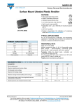 MURS120 www.vishay.com Vishay General Semiconductor Surface Mount Ultrafast Plastic Rectifier FEATURES • Glass passivated chip junction • Ideal for automated placement • Ultrafast reverse recovery time • Low switching losses, high efficiency • High forward surge capability • Meets MSL level 1, per J-STD-020, LF maximum peak of 260 °C • AEC-Q101 qualified DO-214AA (SMB) • Material categorization: For definitions of compliance please see www.vishay.com/doc?99912 TYPICAL APPLICATIONS For use in high frequency rectification and freewheeling application in switching mode converters and inverters for consumer, computer and telecommunication. PRIMARY CHARACTERISTICS IF(AV) 1.0 A VRRM 200 V IFSM 40 A trr 25 ns VF 0.71 V TJ max. 175 °C Package DO-214AA (SMB) Diode variations Single die MECHANICAL DATA Case: DO-214AA (SMB) Molding compound meets UL 94 V-0 flammability rating Base P/N-E3 - RoHS-compliant, commercial grade Base P/NHE3 - RoHS-compliant, AEC-Q101 qualified Terminals: Matte tin plated leads, solderable per J-STD-002 and JESD 22-B102 E3 suffix meets JESD 201 class 2 whisker test, HE3 suffix meets JESD 201 class 2 whisker test Polarity: Color band denotes cathode end MAXIMUM RATINGS (TA = 25 °C unless otherwise noted) SYMBOL PARAMETER VALUE UNIT MD Device marking code Maximum repetitive peak reverse voltage VRRM 200 V Working peak reverse voltage VRWM 200 V VDC 200 V Maximum DC blocking voltage Maximum average forward rectified current at (fig. 1) Peak forward surge current 8.3 ms single half sine-wave superimposed on rated load Operating junction and storage temperature range Revision: 26-Aug-13 TL = 155 °C TL = 145 °C IF(AV) 1.0 2.0 A IFSM 40 A TJ, TSTG - 65 to + 175 °C Document Number: 88687 1 For technical questions within your region: DiodesAmericas@vishay.com, DiodesAsia@vishay.com, DiodesEurope@vishay.com THIS DOCUMENT IS SUBJECT TO CHANGE WITHOUT NOTICE. THE PRODUCTS DESCRIBED HEREIN AND THIS DOCUMENT ARE SUBJECT TO SPECIFIC DISCLAIMERS, SET FORTH AT www.vishay.com/doc?91000 MURS120 www.vishay.com Vishay General Semiconductor ELECTRICAL CHARACTERISTICS (TA = 25 °C unless otherwise noted) TEST CONDITIONS PARAMETER Maximum instantaneous forward voltage IF = 1.0 A SYMBOL TJ = 25 °C 0.875 VF (1) TJ = 150 °C TJ = 25 °C Maximum instantaneous reverse current at rated DC blocking voltage VALUE 0.71 2.0 IR (1) TJ = 150 °C UNIT V μA 50 Maximum reverse recovery time IF = 0.5 A, IR = 1.0 A, Irr = 0.25 A trr 25 ns Maximum reverse recovery time IF = 1.0 A, dI/dt = 50 A/μs, VR = 30 V, Irr = 10 % IRM trr 35 ns Maximum forward recovery time IF = 1.0 A, dI/dt = 100 A/μs, recovery to 1.0 V tfr 25 ns SYMBOL VALUE UNIT RJL 13 °C/W Note (1) Pulse test: t = 300 μs, duty cycle 2 % p THERMAL CHARACTERISTICS (TA = 25 °C unless otherwise noted) PARAMETER Typical thermal resistance, junction to lead ORDERING INFORMATION (Example) PREFERRED P/N UNIT WEIGHT (g) PREFERRED PACKAGE CODE BASE QUANTITY DELIVERY MODE MURS120-E3/52T 0.096 52T 750 7" diameter plastic tape and reel MURS120-E3/5BT 0.096 5BT 3200 13" diameter plastic tape and reel MURS120HE3/52T (1) 0.096 52T 750 7" diameter plastic tape and reel MURS120HE3/5BT (1) 0.096 5BT 3200 13" diameter plastic tape and reel Note (1) AEC-Q101 qualified RATINGS AND CHARACTERISTICS CURVES (TA = 25 C unless otherwise noted) 50 Peak Forward Surge Current (A) Average Forward Rectified Current (A) 6.0 5.0 4.0 3.0 2.0 1.0 0 40 30 20 10 0 0 25 50 75 100 125 150 175 1 10 100 Lead Temperature (°C) Number of Cycles at 60 Hz Fig. 1 - Forward Current Derating Curve Fig. 2 - Maximum Non-Repetitive Peak Forward Surge Current Revision: 26-Aug-13 Document Number: 88687 2 For technical questions within your region: DiodesAmericas@vishay.com, DiodesAsia@vishay.com, DiodesEurope@vishay.com THIS DOCUMENT IS SUBJECT TO CHANGE WITHOUT NOTICE. THE PRODUCTS DESCRIBED HEREIN AND THIS DOCUMENT ARE SUBJECT TO SPECIFIC DISCLAIMERS, SET FORTH AT www.vishay.com/doc?91000 MURS120 www.vishay.com Vishay General Semiconductor 1000 Junction Capacitance (pF) Instantaneous Forward Current (A) 100 10 TJ = 125 °C TJ = 100 °C 1 0.1 TJ = 25 °C 0.01 0.2 TJ = 25 °C f = 1.0 MHz Vsig = 50 mVp-p 100 10 0.4 0.6 0.8 1.0 1.4 1.2 0.1 1.6 1 Instantaneous Forward Voltage (V) Fig. 3 - Typical Instantaneous Forward Characteristics Instantaneous Reverse Leakage Current (µA) 100 TJ = 175 °C 10 1 TJ = 100 °C 0.1 TJ = 25 °C 0.01 0.001 0 20 40 60 80 10 100 Reverse Voltage (V) 100 Percent of Rated Peak Reverse Voltage (%) Fig. 4 - Typical Reverse Leakage Characteristics Fig. 5 - Typical Junction Capacitance PACKAGE OUTLINE DIMENSIONS in inches (millimeters) DO-214AA (SMB) Cathode Band Mounting Pad Layout 0.085 (2.159) MAX. 0.155 (3.94) 0.130 (3.30) 0.086 (2.20) 0.077 (1.95) 0.086 (2.18) MIN. 0.180 (4.57) 0.160 (4.06) 0.060 (1.52) MIN. 0.012 (0.305) 0.006 (0.152) 0.220 (5.59) REF. 0.096 (2.44) 0.084 (2.13) 0.060 (1.52) 0.030 (0.76) 0.008 (0.2) 0 (0) 0.220 (5.59) 0.205 (5.21) Revision: 26-Aug-13 Document Number: 88687 3 For technical questions within your region: DiodesAmericas@vishay.com, DiodesAsia@vishay.com, DiodesEurope@vishay.com THIS DOCUMENT IS SUBJECT TO CHANGE WITHOUT NOTICE. THE PRODUCTS DESCRIBED HEREIN AND THIS DOCUMENT ARE SUBJECT TO SPECIFIC DISCLAIMERS, SET FORTH AT www.vishay.com/doc?91000 Legal Disclaimer Notice www.vishay.com Vishay Disclaimer ALL PRODUCT, PRODUCT SPECIFICATIONS AND DATA ARE SUBJECT TO CHANGE WITHOUT NOTICE TO IMPROVE RELIABILITY, FUNCTION OR DESIGN OR OTHERWISE. Vishay Intertechnology, Inc., its affiliates, agents, and employees, and all persons acting on its or their behalf (collectively, “Vishay”), disclaim any and all liability for any errors, inaccuracies or incompleteness contained in any datasheet or in any other disclosure relating to any product. Vishay makes no warranty, representation or guarantee regarding the suitability of the products for any particular purpose or the continuing production of any product. To the maximum extent per