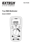 User Guide True RMS Multimeter Extech EX205T Introduction Thank you for selecting the Extech EX205T True RMS Auto-ranging Multimeter. This meter measures AC/DC Voltage, AC/DC Current, Resistance, Diode Test, and Continuity. Proper use and care of this meter will provide many years of reliable service. Please visit the Extech Instruments website (www.extech.com) to check for the latest version of this User Guide. Extech Instruments is an ISO9001 certified company. Safety This symbol adjacent to another symbol, terminal or operating device indicates that the operator must refer to an explanation in the Operating Instructions to avoid personal injury or damage to the meter. WARNING This WARNING symbol indicates a potentially hazardous situation, which if not avoided, could result in death or serious injury. CAUTION This CAUTION symbol indicates a potentially hazardous situation, which if not avoided, may result damage to the product. MAX 600V This symbol advises the user that the terminal(s) so marked must not be connected to a circuit point at which the voltage with respect to earth ground exceeds (in this case) 600 VAC or VDC. This symbol adjacent to one or more terminals identifies them as being associated with ranges that may, in normal use, be subjected to particularly hazardous voltages. For maximum safety, the meter and its test leads should not be handled when these terminals are energized. This symbol indicates that a device is protected throughout by double insulation or reinforced insulation. PER IEC1010 OVERVOLTAGE INSTALLATION CATEGORY OVERVOLTAGE CATEGORY I Equipment of OVERVOLTAGE CATEGORY I is equipment for connection to circuits in which measures are taken to limit the transient overvoltages to an appropriate low level. Note – Examples include protected electronic circuits. OVERVOLTAGE CATEGORY II Equipment of OVERVOLTAGE CATEGORY II is energy-consuming equipment to be supplied from the fixed installation. Note – Examples include household, office, and laboratory appliances. OVERVOLTAGE CATEGORY III Equipment of OVERVOLTAGE CATEGORY III is equipment in fixed installations. Note – Examples include switches in the fixed installation and some equipment for industrial use with permanent connection to the fixed installation. OVERVOLTAGE CATEGORY IV Equipment of OVERVOLTAGE CATEGORY IV is for use at the origin of the installation. Note – Examples include electricity meters and primary over-current protection equipment 2 EX205T-EU-EN V1.0 8/12 CAUTIONS Improper use of this meter can cause damage, shock, injury or death. Read and understand this user manual before operating the meter. Always remove the test leads before replacing the battery or fuses. Inspect the condition of the test leads and the meter itself for any damage before operating the meter. Use great care when making measurements if the voltages are greater than 25 VAC rms or 35 VDC. These voltages are considered a shock hazard. Warning! This is a Class A device. This device can cause interference in residential areas. Always discharge capacitors and remove power from the device under test before performing Diode, Resistance or Continuity tests. Voltage checks on electrical outlets can be difficult and misleading because of the uncertainty of connection to the recessed electrical contacts. Other means should be used to ensure that the terminals are not "live". If the equipment is used in a manner not specified by the manufacturer, the protection provided by the equipment may be impaired. This device must not be used by children. It contains hazardous objects as well as small parts that the children could swallow. Do not leave batteries and packing material lying around unattended; they can be dangerous to children. In the event that this device will be stored for an extended period of time, remove the batteries. Expired or damaged batteries can be hazardous to skin. Use suitable hand gloves in such cases. Do not short-circuit the battery. Never dispose of batteries in a fire. Batteries may explode or leak. Never mix battery types. Always install new batteries of the same type. 3 EX205T-EU-EN V1.0 8/12 SAFETY INSTRUCTIONS This meter has been designed for safe use, but must be operated with caution. The rules listed below must be carefully followed for safe operation. 1. NEVER apply voltage or current to the meter that exceeds the specified maximum: Input Protection Limits Function Maximum Input V AC/DC, Resistance, Diode Test, Continuity 600 VDC/AC rms μA or mA AC/DC 200mA fused A AC/DC 10A fused 2. USE EXTREME CAUTION when working with high voltages. 3. DO NOT measure voltage if the voltage on the "COM" input jack exceeds 600V above earth ground. 4. NEVER connect the meter leads across a voltage source while the function switch is in the current, resistance, or diode mode. Doing so can damage the meter. 5. ALWAYS discharge filter capacitors in power supplies and disconnect the power when making resistance or diode tests. 6. ALWAYS turn off the power and disconnect the test leads before opening the covers to replace the fuse or batteries. 7. NEVER operate the meter unless the back cover and the battery and fuse covers are in place and fastened securely. 8. If the equipment is used in a manner not specified by the manufacturer, the protection provided by the equipment may be impaired. 4 EX205T-EU-EN V1.0 8/12 Controls and Jacks 1. 2000 count LCD 2. MAX button 3. MODE button 4. FUNCTION switch 5. mA, µA and 10A input jacks 6. Backlight button 7. HOLD button 8. RANGE button 9. Positive input jack 10. COM input jack Note: Tilt stand, test lead holders, and battery compartment are on rear of unit. Symbols and Enunciators Continuity Diode test -6 µ micro (10 ) (amps) m milli (10 ) (volts, amps) A Amps k kilo (10 ) (ohms) M mega (10 ) (ohms) Ohms V Volts AC Alternating current DC Direct current -3 3 6 MAX Maximum AUTO Auto-ranging HOLD Display hold 5 EX205T-EU-EN V1.0 8/12 Operating Instructions WARNING: Risk of ele