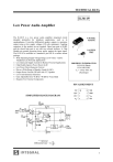 TECHNICAL DATA IL34119 Low Power Audio Amplifier The IL34119 is a low power audio amplifier integrated circuit intended (primarily) for telephone applications, such as in speakerphones. It provides differential speaker outputs to maximize output swing at low supply voltages (2.0 volts minimum). Coupling capacitors to the speaker are not required. Open loop gain is 80 dB, and the closed loop gain is set with two external resistors. A Chip Disable pin permits powering down and/or muting the input signal. The IL34119 is available in a standard 8 pin DIP or a surface mount package. • Wide Operating Supply Voltage Range (2-16 Volts) - Allows Telephone Line Powered Applications • Low Quiescent Supply Current for Battery Powered Applications • Chip Disable Input to Power Down the IC • Low Power Down Quiescent Current • Drives a Wide Range of Speaker Loads (8-100Ω) • Output Power Exceeds 250 mW with 32Ω Speaker • Low Total Harmonic Distortion • Gain Adjustable from <0 dB to >46 dB for Voice Band • Requires Few External Components ORDERING INFORMATION IL34119N Plastic IL34119D SOIC TA = -10° to 70° C for all packages PIN ASSIGNMENT SIMPLIFIED BLOCK DIAGRAM * = Optional R Differential Gain = 2 x f Ri 1 IL34119 PIN DESCRIPTION Pin Symbol Description 1 CD Chip Disable - Digital input. A Logic “0” (<0.8 V) sets normal operation. A Logic “1” (≥2.0 V) sets the power down mode. Input impedance is nominally 90 KΩ. 2 FC2 A capacitor at this pin increases power supply rejection, and affects turn-on time. This pin can be left open if the capacitor at FC1 is sufficient. 3 FC1 Analog Ground for the amplifiers. A 1.0 µF capacitor at this pin (with a 5.0 µF capacitor at Pin 2) provides 52 dB of power supply rejection. Turn-on time of the circuit is affected by the capacitor on this pin. This pin can be used as an alternate input. 4 VIN Amplifier input. The input capacitor and resistor set low frequency rolloff and input impedance. The feedback resistor is connected to this pin and VO1. 5 VO1 Amplifier Output #1. The dc level is ≈ (VCC - 0.7 V)/2. 6 VCC DC supply voltage (+2.0 to +16 Volts) is applied to this pin. 7 GND Ground pin for the entire circuit. 8 VO2 Amplifier Output #2. This signal is equal in amplitude, but 180° out of phase with that at VO1. The dc level is ≈ (VCC - 0.7 V)/2. DESIGN GUIDELINES GENERAL The IL34119 is a low power audio amplifier capable of low voltage operation (VCC = 2.0 V minimum) such as that encountered in line-powered speakerphones. The circuit provides a differential output (VO1-VO2) to the speaker to maximize the available voltage swing at low voltages. The differential gain is set by two external resistors. Pins FC1 and FC2 allow controlling the amount of power supply and noise rejection, as well as providing alternate inputs to the amplifiers. The CD pin permits powering down the IC for muting purposes and to conserve power. AMPLIFIERS Referring to the block diagram, the internal configuration consists of two identical operational amplifiers. Amplifier #1 has an open-loop gain of ≥80 dB (at f ≤ 100 Hz), and the closed loop gain is set by external resistors Rf and Ri. The amplifier is unity gain stable, and has a unity gain frequency of approximately 1.5 MHz. In order to adequately cover the telephone voice band (300-340 Hz), a maximum closed loop gain of 46 dB is recommended. Amplifier #2 is internally set to a gain of -1.0 (0 dB). The outputs of both amplifiers are capable of 2 sourcing and sinking a peak current of 200 mA. The outputs can typically swing to within ≈0.4 volts above ground, and to within ≈1.3 volts below VCC, at the maximum current. The output dc offset voltage (VO1-VO2) is primarily a function of the feedback resistor (Rf), and secondarily due to the amplifiers’ input offset voltages. The input offset voltage of the two amplifiers will generally be similar for a particular IC, and therefore nearly cancel each other at the outputs. Amplifier #1’s bias current, however, flows out of VIN (Pin 4) and through Rf, forcing VO1 to shift negative by an amount equal to [Rf x IIB]. VO2 is shifted positive an equal amount. The output offset voltage specified in the Electrical Characteristics is measured with the feedback resistor shown in the Simplified Block Diagram, and therefore takes into account the bias current as well as internal offset voltages of the amplifiers. The bias current is constant with respect to VCC. FC1 and FC2 Power supply rejection is provided by the capacitors (C1 and C2 in the Simplified Block Diagram) at FC1 and FC2. C2 is somewhat dominant at low frequencies, while C1 is dominant at high frequencies. The reguired values of C1 and C2 depend on the conditions of each application. A IL34119 line powered speakerphone, for example, will require more filtering than a circuit powered by a well requlated power supply. The amount of rejection is a function of the capacitors, and the equivalent impedance looking into FC1 and FC2 (listed in the Electrical Characteristics as RFC1 and RFC2). In addition to providing filtering, C1 and C2 also affect the turn-on time of the circuit at power-up, since the two capacitors must change up through the internal 50 KΩ and 125 KΩ resistors. CHIP DISABLE The Chip Disable (Pin 1) can be used to power down the IC to conserve power, or for muting, or both. When at a Logic “0” (0 to 0.8 Volts), the IL34119 is enabled for normal operation. When Pin 1 is at a Logic “1” (2.0 to VCC Volts), the IC is disabled. If Pin 1 is open, that is equivalent to a Logic “0”, although good design practice dictates that an input should never be left open. Input impedance at Pin 1 is a nominal 90 KΩ. The power supply current (when disabled) is shown in Figure 1. Muting, defined as the change in differential gain from normal operation to muted operation, is in excess of 70 dB. The turn-off time of the audio output, from the application of the CD signal, is <2.0 µs, and turn o
