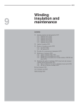9/255 9 Winding insulation and maintenance Contents 9.1 Insulating materials and their properties 9/257 9.1.1 Insulation class A 9/257 9.1.2 Insulation class E 9/257 9.1.3 Insulation class B 9/257 9.1.4 Insulation class F 9/258 9.1.5 Insulation class H 9/258 9.2 Ageing of insulation 9/258 9.3 Practices of insulation systems 9/258 9.3.1 LV motors 9/258 9.3.2 MV motors 9/259 9.4 Procedure for vacuum pressure impregnation 9/259 9.5 Maintenance of insulation 9/260 9.5.1 Against insulation failure 9/260 9.5.2 Making-up of the insulation level 9/261 9.5.3 Making-up of the insulation level in large machines (1000 kW and above) 9/261 9.6 Monitoring the quality of insulation of MV formed coils and resin-poor windings during manufacturing 9/263 9.6.1 Theory of dielectric loss factor or dissipation factor (tan d) 9/263 9.6.2 Wet test of resin-poor windings 9/264 Relevant Standards 9/265 List of formulae used 9/265 Further Reading 9/265 Winding insulation and maintenance 9/257 9.1 Insulating materials and their properties The insulating materials form the heart of an electrical machine. During operation these materials may be subject to electrical, thermal and mechanical stresses and must be capable to endure the same and possess the following, Electrical stresses ∑ ∑ ∑ high breakdown voltage good long time performance low partial discharges (minimum voids within insulation or on interface between insulation systems) ∑ very small leakage or creepage currents. Thermal stresses ∑ ∑ ∑ high long time performance small deformation after temperature cycles least delamination within insulation material Mechanical stresses ∑ high mechanical strength to sustain forces due to handling and mechanical forces under operation. ∑ least reduction of mechanical strength within specified operating temperature and voltage. To achieve the above one may improvise the impregnation process to minimize voids within insulating materials. Also improvise hot iron press to minimize minute voids created inadvertently due to the process followed to wrap the insulating tapes in many layers on the coils. Following are some insulating and binding materials that have traversed since time immemorial and may continue in times ahead, – wood, gutta-percha, textile and mica as insulating materials. – shellac or bitumen as binding material – synthetic resigns like polyester and epoxy resin. – silicon rubber as high temperature material. The common types of insulating materials in use for electric motors are E and B for small motors and F for medium sized and large ones. General industrial practice, however, is to limit the temperature to class B limits, even if class F insulation is used. Insulation class A, previously in use, has been discontinued in view of its low working temperature. Motor frames have also been standardized with class E insulation only by IEC recommendations, as in Table 1.2, to harmonize the interchangeability of electric motors. This decision was taken because class E insulation offers a higher working temperature and a longer working life. These frames also ensure optimum utilization of active materials such as copper and steel in a particular frame size. The classification of insulating materials is based on their maximum continuous working temperature, established for 20 years of working life. The recommended temperature according to IEC 60034-1 is, however, less than this, as shown in Table 9.1, to ensure an even longer life. Where the ambient temperature is likely to be high, of the order of 60∞C or so during operation, such as close to a furnace, class F and H insulations are normally used, as they have higher working temperatures and thermal resistivity. A brief description of the insulating materials in use for different classes of insulation is given below to provide an introduction to the types of materials being used in the preparation of a particular class of insulation. The actual ingredients may be an improvised version of these materials, in view of continuous researches and development in this field, to search out for still better and more suitable materials. 9.1.1 Insulation class A This includes organic fibrous materials on a cellulose base such as paper, pressboard, cotton, cotton cloth and natural silk etc., impregnated with lacquers or immersed in an insulating liquid. The impregnation or immersion ensures that the oxygen content of the air does not affect the insulating properties or enhance the thermal ageing of the insulating material. Typical materials in this class are varnished cloth and oil-impregnated paper. 9.1.2 Insulation class E This includes wire enamels on a base of polyvinyl formal, polyurethane or epoxy resins as well as moulding powder plastics on phenol-formaldehyde and similar binders, with cellulose fillers, laminated plastics on paper and cotton cloth base, triacetate cellulose films, films and fibres of polyethylene terephthalate. 9.1.3 Insulation class B This includes inorganic materials such as mica, glass fibre and asbestos etc., impregnated or glued together with varnishes or compositions comprising ordinary organic substances for heat resistance such as oil-modified synthetic resins, bitumen, shellac and Bakelite. Table 9.1 Maximum/permissible working temperatures for different insulating materials Class of insulation Ab Eb B F H a Maximum attainable temperature as in IEC 60085 Permissible operating temperature as in IEC 60034-1 by the resistance methoda ∞C Up to 5000 kW ∞C Above 5000 kW ∞C 105 120 130 155 180 100 115 120 145 165 100 110 120 145 165 Using the thermometer method this temperature will be less by 10∞C. b These insulations are generally not used, for large motors, due to their low operating temperature. 9/258 Electrical Power Engineering Reference & Applications Handbook (ii) For larger ratings: by phenol or synthetic resin insulation on one or both sides. Although insulation on one side is common, by ensuring that the l