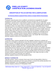 PINELLAS COUNTY CONSTRUCTION LICENSING BOARD DESCRIPTION OF PCCLB CONTRACTOR CLASSIFICATIONS The Following definitions adopted 6/17/04 by reference to Chapter 489.105, Florida Statutes: CONTRACTOR "Contractor" means the person who is qualified for, and shall only be responsible for, the project contracted for and means, except as exempted in this part, the person who, for compensation, undertakes to, submits a bid to, or does himself or herself or by others construct, repair, alter, remodel, add to, demolish, subtract from, or improve any building or structure, including related improvements to real estate, for others or for resale to others; and whose job scope is substantially similar to the job scope described in one of the subsequent paragraphs of this subsection. For the purposes of regulation under this part, "demolish" applies only to demolition of steel tanks over 50 feet in height; towers over 50 feet in height; other structures over 50 feet in height, other than buildings or residences over three stories tall; and buildings or residences over three stories tall. Contractors are subdivided into two divisions, Division I, consisting of those contractors defined in paragraphs (a)-(c), and Division II, consisting of those contractors defined in paragraphs (d)-(q): (see Chapter 489, Florida statutes). (Definition adopted by reference 6/17/04)(Updated 5/15/07) CONTRACTING "Contracting" means, except as exempted in this part, engaging in business as a contractor and includes, but is not limited to, performance of any of the acts as set forth in subsection (3) which defines types of contractors. The attempted sale of contracting services and the negotiation or bid for a contract on these services also constitutes contracting. If the services offered require licensure or agent qualification, the offering, negotiation for a bid, or attempted sale of these services requires the corresponding licensure. However, the term "contracting" shall not extend to an individual, partnership, corporation, trust, or other legal entity that offers to sell or sells completed residences on property on which the individual or business entity has any legal or equitable interest, if the services of a qualified contractor certified or registered pursuant to the requirements of this chapter have been or will be retained for the purpose of constructing such residences. (Definition adopted by reference 6/17/04) (Updated 5/15/07) SPECIALTY CONTRACTOR "Specialty contractor" means a contractor whose scope of work and responsibility is limited to a particular phase of construction and whose scope is limited to a subset of the activities described in the categories established in one of the paragraphs of this subsection. (Definition adopted by reference 6/17/04)(Updated 5/15/07) 12600 Belcher Road, Suite 102 Largo, Florida 33773 Phone 727-536-4720 Fax 727-538-4797 Website: www.pcclb.com 1 GENERAL CONTRACTOR "General contractor" means a contractor whose services are unlimited as to the type of work which he or she may do, who may contract for any activity requiring licensure under this part, and who may perform any work requiring licensure under this part, except as otherwise expressly provided in s. 489.113. (Established 6/28/73) (Definition amended 6/17/04) (Updated 5/15/07) BUILDING CONTRACTOR "Building contractor" means a contractor whose services are limited to construction of commercial buildings and single-dwelling or multiple-dwelling residential buildings, which commercial or residential buildings do not exceed three stories in height, and accessory use structures in connection therewith or a contractor whose services are limited to remodeling, repair, or improvement of any size building if the services do not affect the structural members of the building. (Established 6/28/73) (Definition amended 6/17/04) (Updated 5/15/07) RESIDENTIAL CONTRACTOR "Residential contractor" means a contractor whose services are limited to construction, remodeling, repair, or improvement of one-family, two-family, or three-family residences not exceeding two habitable stories above no more than one uninhabitable story and accessory use structures in connection therewith. (Established 6/28/73) (Definition amended 6/17/04) (Updated 5/15/07) PLUMBING CONTRACTOR "Plumbing contractor" means a contractor whose contracting business consists of the execution of contracts requiring the experience, financial means, knowledge, and skill to install, maintain, repair, alter, extend, or, when not prohibited by law, design plumbing. A plumbing contractor may install, maintain, repair, alter, extend, or, when not prohibited by law, design the following without obtaining any additional local regulatory license, certificate, or registration: sanitary drainage or storm drainage facilities; venting systems; public or private water supply systems; septic tanks; drainage and supply wells; swimming pool piping; irrigation systems; or solar heating water systems and all appurtenances, apparatus, or equipment used in connection therewith, including boilers and pressure process piping and including the installation of water, natural gas, liquefied petroleum gas and related venting, and storm and sanitary sewer lines; and water and sewer plants and substations. The scope of work of the plumbing contractor also includes the design, when not prohibited by law, and installation, maintenance, repair, alteration, or extension of air-piping, vacuum line piping, oxygen line piping, nitrous oxide piping, and all related medical gas systems; fire line standpipes and fire sprinklers to the extent authorized by law; ink and chemical lines; fuel oil and gasoline piping and tank and pump installation, except bulk storage plants; and pneumatic control piping systems, all in such a manner as to comply with all plans, specifications, codes, laws, and regulations applicable. The scope of work of the plumbing contractor shall apply to private property and public property, 