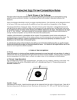 Trebuchet Egg Throw Competition Rules 1. Quick Glimpse of the Challenge The object of the Trebuchet competition is to promote engineering and science as an exciting field for young people, to provide a service to society, to encourage teamwork, and to assist in education outside of the classroom. Teams must design trebuchets to launch raw eggs a specified distance. The trebuchets will be designed and built by the teams. Each team must provide all materials and use their creativity and imagination in their designs. The playing field will be a rectangular shape. The teams will set up their trebuchet in a designated launch area and will launch the eggs at a bull’s eye target on the opposite end of the playing field. The trebuchet range must be adjustable because each team will be shooting from different distances to the target. The distance to the target will be 75, 100, 125 feet. . Each team will get four shots at each distance with the two best shots counted for scoring. This field competition will count for 60 of the total 100 possible points. In addition to the trebuchet, a presentation will be required. The presentation should include calculations of predicted distances, documentation of the design process, and a list of materials used, among other things. The presentation will be judged by a panel of engineers from the Quad City Engineering and Science Council (QCESC) and will have a total of 40 possible points. An optional stand-alone contest and team prize will be given for the trebuchet that launches an egg the longest distance with additional two eggs and launches allowed per team. The results for the longest distance will not be scored so won’t impact the overall competition. 2. Rules of the Competition 2.1 Teams Teams will consist of a minimum of three students (recommend no more than eight) and one advisor. A student is someone who has not yet graduated from high school. An advisor may be a teacher, principal, parent, or guardian (anyone designated by the school that is an adult and willing to take on the challenge and responsibility). 2.2 Field and Target Description o The competition field will be a level, rectangular field. The target is an 8’x 8’ platform inclined at a 45 angle. The bull’s eye will be in the center of the platform and be 4’ in diameter (see Figure 1). The launching areas are described in section 2.4. FIGURE 1 Target The distance to the center of each launching area will be measured from the center of the bull’s eye. There will be three launching areas for the teams to throw. Each team will throw from: 75’, 100’, and 125’ feet from the target. P age |1 Last Updated: March 28, 2011 2.3 Launching Site The launching sites will be rectangular areas that measure ten feet long by twenty feet wide. All teams will launch from all three sites. Teams will start out at 75ft., progress to 100 ft, and finish throwing at 125ft. Teams will get four eggs at each site. The two best launches out of the four will count in points. The catapult’s datum will be the most forward ground brace (see Section 3.8). 2.4 Eggs The Quad City Engineering and Science Council will supply all eggs used in the competition. They will be Grade “A” large eggs. 2.5 Scoring Shots Each team will have six scored shots. Points will be awarded for eggs that hit the 4’ diameter bull’s eye as well as shots that strike the 8’ x 8’ target platform outside the bull’s eye or land within one of the three circles surrounding the target. The landing point of the egg will determine the score (i.e. rolling the egg onto the target does not count). Scoring 75’ 100’ 125’ Bull’s-eye 10 10 10 White Platform 8 8 8 Inside 10’ Circle 6 6 6 Inside 20’ Circle 4 4 4 Inside 30’ Circle 3 3 3 0 0 0 Miss 2.6 Time Constraint P age |2 Last Updated: March 28, 2011 Each team will only be allowed thirty minutes to place their trebuchet, launch all shots from all three different sites, and remove the trebuchet from the field. Trebuchets may be assembled before the thirty-minute countdown begins. 3. Construction Constraints 3.1 Initial Size The size of the trebuchet must be no greater than 4’x 6’x 3’ when disassembled; in other words, it should fit inside a box of these dimensions. Judges will measure this on competition day! On competition day, a team may bring its trebuchet disassembled for size testing and then put it together to form a final unit larger than the stated dimensions. The maximum amount of free/extra weight that can used with the Trebuchet is 80 pounds. The trebuchet should not be so massive that it requires a truck to move it even short distances. Teams should be able to move their trebuchet easily under their own power. 3.2 Energy The only allowed means of providing energy to the trebuchet will be that of a falling mass. No springs may be used in the construction of the launching mechanism. Bettendorf Science Club would like to see creative designs resembling trebuchets rather than slingshots. 3.3 Materials Materials that may be used are any items that may be found at a typical lumberyard or hardware store. 3.4 Remote Triggering Device & safety Each trebuchet MUST be equipped with a remote triggering device and firing safety. (See Section 4.2) 3.5 Cost Constraint The total cost for the construction of the trebuchet must be no greater than $200.00 (see Section 5.6). 3.6 Broken Parts During the competition there might be times when parts will break. These parts may be replaced as long as the replacement materials were included in the initial measurement box. Tools do not have to be placed in the box. All repairs must be done within the thirty-minute time constraint. 3.7 Adjustability Teams will be allowed to make minor modifications and adjustments to their trebuchets with materials that were included in the initial measurement box. An important aspect of the trebuchet design is its ability to be adjusted in response to variable launch factors such as wind and dis