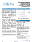 Enpirion® Power Datasheet EN5394QI 9A PowerSoC Voltage Mode Synchronous Buck PWM DC-DC Converter With Integrated Inductor Description Typical Application Circuit The EN5394QI is a Power Supply on a Chip (PwrSoC) DC to DC converter with integrated inductor, PWM controller, MOSFETS, and compensation providing the smallest possible solution size in a 68 pin QFN module. The switching frequency can be synchronized to an external clock or other EN5394QIs with the added capability of phasing multiple EN5394QIs as desired. Other features include precision ENABLE threshold, pre-bias monotonic start-up, margining, and parallel operation. EN5394QI is specifically designed to meet the precise voltage and fast transient requirements of present and future high-performance applications such as set-top boxes/HD DVRs, LAN/SAN adapter cards, audio/video equipment, optical networking, multi-function printers, test and measurement, embedded computing, storage, and servers. Advanced circuit techniques, ultra high switching frequency, and very advanced, high-density, integrated circuit and proprietary inductor technology deliver highquality, ultra compact, non-isolated DC-DC conversion. Operating this converter requires very few external components. The Altera Enpirion integrated inductor solution significantly helps to reduce noise. The complete power converter solution enhances productivity by offering greatly simplified board design, layout and manufacturing requirements. All Altera Enpirion products are RoHS compliant and lead-free manufacturing environment compatible. VIN 47µF VOUT VOUT AVIN 2x47µF ENABLE VFB PGND SS 15nF OCP_ADJ PGND AGND Figure 1: Typical Application Schematic Features • • • • • • • • • • • • • • Integrated Inductor, MOSFETS, Controller in a 8 x 11 x 1.85mm package Wide input voltage range of 2.375V to 6.6V. > 30W continuous output power. High efficiency, up to 93%. Output voltage margining Monotonic output voltage ramp during startup with pre-biased loads. Precision Enable pin for accurate sequencing of power converters and Power OK signal. Programmable soft-start time. Soft Shutdown. 4 MHz operating frequency with ability to synchronize to an external system clock or other EN5394’s. Programmable phase delays between synchronized units to allow reduction of input ripple. Master/slave configuration for paralleling multiple EN5394’s for greater power output. Under Voltage Lockout, Over-current, Short Circuit, and Thermal Protection RoHS compliant, MSL level 3, 260C reflow. 1 03738 PVIN October 11, 2013 www.altera.com/enpirion Rev E EN5394QI Applications • • • • • Point of load regulation for low-power processors, network processors, DSPs, FPGAs, and ASICs Low voltage, distributed power architectures with 2.5V, 3.3V or 5V, 6V rails Computing, broadband, networking, LAN/WAN, optical, test & measurement A/V, high density cards, storage, DSL, STB, DVR, DTV, Industrial PC Beat frequency sensitive applications • Applications requiring monotonic start-up with pre-bias Ripple voltage sensitive applications Noise sensitive applications • • Ordering Information Part Number EN5394QI EVB-EN5394QI Temp Rating (°C) Package -40 to +85 68-pin QFN T&R QFN Evaluation Board S_DELAY SS OCP_ADJ EAOUT VFB AGND POK AVIN ENABLE EN_PB M/S 58 57 56 55 54 53 52 51 50 MAR2 59 VSENSE 62 MAR1 PGND 64 63 61 PGND 60 PGND 65 PGND 67 66 PGND 68 Pin Configuration 49 S_IN 48 S_OUT 47 NC 4 46 NC VOUT 5 45 NC VOUT 6 44 NC VOUT 7 43 PVIN VOUT 8 42 PVIN PGND 1 PGND 2 PGND 3 PGND Thermal Pads 70 PGND 69 PGND EN5394QI 29 30 31 32 PGND PGND PGND PGND PGND 34 28 PGND PVIN 27 NC(SW) 33 26 PGND 25 NC(SW) PVIN 24 35 NC 15 NC PVIN NC 23 36 22 14 NC PVIN NC 21 37 NC PVIN 13 NC 38 VOUT 20 12 19 PVIN VOUT NC 39 18 11 NC PVIN VOUT NC PVIN 40 17 41 10 16 9 VOUT NC VOUT Figure 2: Pinout Diagram (Top View). All perimeter pins must be soldered to PCB. 2 03738 October 11, 2013 www.altera.com/enpirion Rev E EN5394QI Pin Descriptions PIN 1-4, 27-33, 64-68 5-13 14-24, 44-47 25-26 34-43 48 49 50 51 52 53 54 55 56 57 58 59 60 61-62 63 69, 70 NAME PGND FUNCTION Input/Output power ground. Connect these pins to the ground electrode of the input and output filter capacitors. See VOUT and PVIN descriptions for more details. Regulated converter output. Connect to the load, and place output filter capacitor(s) between these pins and PGND pins 1-4 and 64-68. NO CONNECT: These pins must be soldered to PCB but not be electrically connected to each other or to any external signal, voltage, or ground. These pins may be NC connected internally. Failure to follow this guideline may result in device damage. NO CONNECT: These pins are internally connected to the common switching node of the internal MOSFETs. They must be soldered to PCB but not be electrically NC(SW) connected to any external signal, ground, or voltage. Failure to follow this guideline may result in device damage. Input power supply. Connect to input power supply, place input filter capacitor(s) PVIN between these pins and PGND pins 27-33. Clock Output. Depending on the mode, either a clock signal or the PWM signal is S_OUT output on this pin. These signals are delayed by a time that is related to the resistor connected between S_DELAY and AGND. Leave this pin floating if not needed. Clock Input. Depending on the mode, this pin accepts either an input clock to S_IN synchronize the internal switching frequency or the S_OUT signal from another EN5394QI. Leave this pin floating if it is not used. This is a Ternary Input. Floating the pin disables parallel operation. A low level M/S configures the device as Master and a High level configures the device as a slave. This is the Enable Pre-Bias Input. When this pin is pulled high, the Device will support EN_PB monotonic start-up under a pre-biased load. There is a 150kΩ pull-down on this pin. This is the Device Enable pin. A high level enables the device while a low level ENABLE disables the device. A