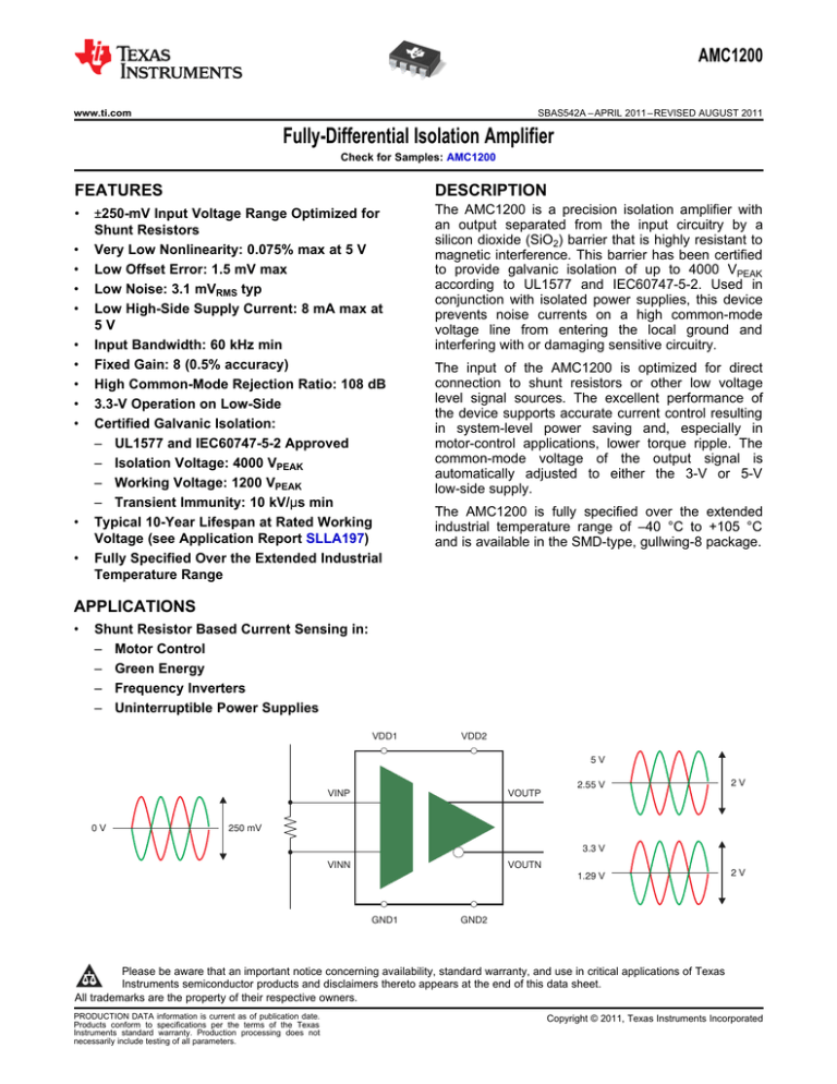 AMC1200 SBAS542A – APRIL 2011 – REVISED AUGUST 2011 www.ti.com Fully-Differential Isolation Amplifier Check for Samples: AMC1200 FEATURES DESCRIPTION • The AMC1200 is a precision isolation amplifier with an output separated from the input circuitry by a silicon dioxide (SiO2) barrier that is highly resistant to magnetic interference. This barrier has been certified to provide galvanic isolation of up to 4000 VPEAK according to UL1577 and IEC60747-5-2. Used in conjunction with isolated power supplies, this device prevents noise currents on a high common-mode voltage line from entering the local ground and interfering with or damaging sensitive circuitry. 1 2 • • • • • • • • • • • ±250-mV Input Voltage Range Optimized for Shunt Resistors Very Low Nonlinearity: 0.075% max at 5 V Low Offset Error: 1.5 mV max Low Noise: 3.1 mVRMS typ Low High-Side Supply Current: 8 mA max at 5V Input Bandwidth: 60 kHz min Fixed Gain: 8 (0.5% accuracy) High Common-Mode Rejection Ratio: 108 dB 3.3-V Operation on Low-Side Certified Galvanic Isolation: – UL1577 and IEC60747-5-2 Approved – Isolation Voltage: 4000 VPEAK – Working Voltage: 1200 VPEAK – Transient Immunity: 10 kV/µs min Typical 10-Year Lifespan at Rated Working Voltage (see Application Report SLLA197) Fully Specified Over the Extended Industrial Temperature Range The input of the AMC1200 is optimized for direct connection to shunt resistors or other low voltage level signal sources. The excellent performance of the device supports accurate current control resulting in system-level power saving and, especially in motor-control applications, lower torque ripple. The common-mode voltage of the output signal is automatically adjusted to either the 3-V or 5-V low-side supply. The AMC1200 is fully specified over the extended industrial temperature range of –40 °C to +105 °C and is available in the SMD-type, gullwing-8 package. APPLICATIONS • Shunt Resistor Based Current Sensing in: – Motor Control – Green Energy – Frequency Inverters – Uninterruptible Power Supplies VDD1 VDD2 5V 2.55 V 0V VINP VOUTP VINN VOUTN 2V 250 mV 3.3 V 1.29 V GND1 2V GND2 1 2 Please be aware that an important notice concerning availability, standard warranty, and use in critical applications of Texas Instruments semiconductor products and disclaimers thereto appears at the end of this data sheet. All trademarks are the property of their respective owners. PRODUCTION DATA information is current as of publication date. Products conform to specifications per the terms of the Texas Instruments standard warranty. Production processing does not necessarily include testing of all parameters. Copyright © 2011, Texas Instruments Incorporated AMC1200 SBAS542A – APRIL 2011 – REVISED AUGUST 2011 www.ti.com This integrated circuit can be damaged by ESD. Texas Instruments recommends that all integrated circuits be handled with appropriate precautions. Failure to observe proper handling and installation procedures can cause damage. ESD damage can range from subtle performance degradation to complete device failure. Precision integrated circuits may be more susceptible to damage because very small parametric changes could cause the device not to meet its published specifications. PACKAGE/ORDERING INFORMATION For the most current package and ordering information see the Package Option Addendum at the end of this document, or visit the device product folder on www.ti.com. ABSOLUTE MAXIMUM RATINGS (1) Over the operating ambient temperature range, unless otherwise noted. Supply voltage, VDD1 to GND1 or VDD2 to GND2 Analog input voltage at VINP, VINN Input current to any pin except supply pins (1) UNIT –0.5 to 6 V GND1 – 0.5 to VDD1 + 0.5 V ±10 mA +150 °C Human body model (HBM) JEDEC standard 22, test method A114-C.01 ±2500 V Charged device model (CDM) JEDEC standard 22, test method C101 ±1000 V Maximum junction temperature, TJ Max Electrostatic discharge (ESD) ratings, all pins AMC1200 Stresses beyond those listed under Absolute Maximum Ratings may cause permanent damage to the device. These are stress ratings only, and functional operation of the device at these or any other conditions beyond those indicated is not implied. Exposure to absolute maximum rated conditions for extended periods may affect device reliability. THERMAL INFORMATION AMC1200 THERMAL METRIC (1) DUB (SOP) UNITS 8 PINS θJA Junction-to-ambient thermal resistance 75.1 θJCtop Junction-to-case (top) thermal resistance 61.6 θJB Junction-to-board thermal resistance 39.8 ψJT Junction-to-top characterization parameter 27.2 ψJB Junction-to-board characterization parameter 39.4 θJCbot Junction-to-case (bottom) thermal resistance N/A (1) °C/W For more information about traditional and new thermal metrics, see the IC Package Thermal Metrics application report, SPRA953. REGULATORY INFORMATION 2 VDE/IEC UL Certified according to IEC 60747-5-2 Recognized under 1577 component recognition program File number: 40016131 File number: E181974 Copyright © 2011, Texas Instruments Incorporated AMC1200 SBAS542A – APRIL 2011 – REVISED AUGUST 2011 www.ti.com IEC 60747-5-2 INSULATION CHARACTERISTICS Over operating free-air temperature range (unless otherwise noted). PARAMETER VIORM VPR VALUE UNIT Maximum working insulation voltage Input to output test voltage VIOTM TEST CONDITIONS Transient overvoltage VISO Insulation voltage per UL RS Insulation resistance PD Pollution degree 1200 VPEAK Qualification test: after Input/Output Safety Test Subgroup 2/3 VPR = VIORM x 1.2, t = 10 s, partial discharge < 5 pC 1140 VPEAK Qualification test: method a, after environmental tests subgroup 1, VPR = VIORM x 1.6, t = 10 s, partial discharge < 5 pC 1920 VPEAK 100% production test: method b1, VPR = VIORM x 1.875, t = 1 s, partial discharge < 5 pC 2250 VPEAK Qualification test: t = 60 s 4000 VPEAK Qualification test: VTEST = VISO , t = 60 s 4000 VPEAK 100% production test: VTEST = 1.2 x VISO , t = 1 s