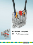 CLIPLINE complete PT – Push-in connection PHOENIX CONTACT – worldwide in dialog with customers and partners Phoenix Contact is a global market leader in the field of electrical engineering, electronics, and automation. Founded in 1923, the family-owned company now employs around 12,800 people worldwide. A sales network with over 50 sales subsidiaries and more than 30 additional sales partners guarantees customer proximity directly on site, anywhere in the world. Our range of services consists of products surrounding various different electrotechnical applications. This includes numerous connection technologies for device manufacturers and machine building, components for modern control cabinets, and tailor-made solutions for many applications and industries, such as automobile production, wind energy, photovoltaics, the process industry or applications in the field of water supply, power distribution, and transportation infrastructure. 22 PHOENIXCONTACT CONTACT PHOENIX Global player with personal customer contact Company independence is an integral part of our corporate policy. Phoenix Contact therefore relies on in-house competence and expertise in many respects: the design and development departments constantly come up with innovative product ideas, developing special solutions to meet customer requirements. Numerous patents emphasize the fact that many of Phoenix Contact's products have been developed in-house. Push-in connection technology PT push-in connection terminal blocks have been developed for direct conductor connection. This means that solid conductors or conductors with ferrules can be inserted directly into the terminal block without tools. The special spring profile enables the easy insertion of conductors with ferrules from 0.25 mm2. The contact spring is opened automatically when the conductor is pushed in and thereby provides the required pressure force against the current bar. Both for releasing conductors and connecting small cross sections from 0.14 mm2, the spring is opened by means of the actuation lever – easily and without direct contact with live parts. The actuation lever can be operated with all standard screwdrivers. The PT connection terminal blocks are subjected to tests which go beyond the basic terminal block standard, enabling them to be used in all sectors of industry, such as energy supply, transportation technology, process engineering, in particular the chemical and petrochemical industry or shipbuilding. Table of contents Push-in connection technology – Easy to use, high-performance connection 4 Simply consistent – PT terminal blocks 6 Quick, easy and reliable – PTPOWER high-current terminal blocks 16 Compact and flexible – PTIO sensor/actuator terminal blocks 20 Compact and functional – PT disconnect and knife disconnect terminal blocks 22 Three-dimensional marshalling – PT four-level terminal blocks 28 Simple, reliable and intuitive marshalling – PTRV marshalling terminals PTMC marshalling patchboards Flexible for all transformer test wiring – PTME test disconnect terminal blocks FAME plug-in test system 30 34 40 46 Modular connection solutions – PT plug-in terminal blocks 48 CLIP PROJECT – Planning and marking software 66 Push-in connection technology – Consistent from the field to the controller 68 Push-in connection technology – Reliable and can be used worldwide 70 PHOENIX CONTACT 3 Push-in connection technology Easy to use – high-performance connection Easy and tool-free direct plug-in The reduction in insertion forces of up to 50% permits easy and direct insertion of solid and stranded conductors with ferrules of cross section 0.25 mm2 or greater. Easily released using any tool The integrated lever enables you to release connected conductors using any type of tool – easily and without direct contact with live parts. Stranded conductors of cross section 0.14 mm2 and above can be connected without ferrules using the actuation lever. Reliable contact High-quality hard-faced copper alloys ensure the lowest contact resistances and, as a result, maximum current transfer. Maximum forces The special contact spring is manufactured from highquality spring steel, which ensures maximum contact and conductor pull-out forces with a vibration-resistant and gastight connection. 4 PHOENIX CONTACT Vibration-resistant contacting The push-in connection technology is tested for maximum vibration and shock resistance. The test runs through a frequency range of 5 Hz to 150 Hz at a speed of up to 5.72 m/s2. The test objects are tested on each of the three axes (x, y, z). No contact interruptions > 1 μs are permitted during the test. Push-in connection technology meets these high requirements in terms of vibration and shock loads up to 350 g. C u J l x m Safe in all applications Push-in connection technology is subjected to tests which go beyond the basic standard, enabling them to be used in all sectors of industry, such as supplying power, traffic technology, process engineering, and the chemical, petrochemical, and shipbuilding industries in particular. X Maximum conductor pull-out forces Correctly wired modular conductor contact points must offer a high degree of mechanical safety. The new push-in connection technology, requiring up to 50% lower conductor insertion forces, achieves 180 N in the conductor pull-out test of a 2.5 mm2 terminal block with a 1.0 mm2 conductor, for example, where only 35 N is required according to the standard. Gas-tight contacting The key role of the metal parts of electrical connections becomes particularly apparent in aggressive environments. A test method describes a corrosion test in condensation climates with an atmosphere containing sulfur dioxide and salt mist. The push-in connection technology creates high-grade, gas-tight connections that cannot be impaired even by aggressive substances. High-performance contacting Conductor contact points must, in practice, also be capable of resisting sho