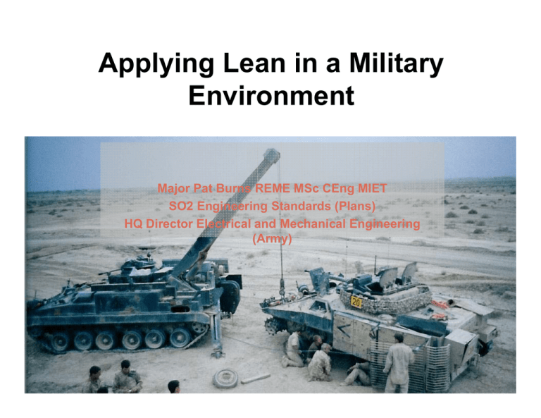 Applying Lean in a Military Environment Major Pat Burns REME MSc CEng MIET SO2 Engineering Standards (Plans) HQ Director Electrical and Mechanical Engineering (Army) Agenda • • • • • • Background Lean in REME Examples Achievements Challenges Next steps HQ DEME(A) Supporting Equipment Capability in the Army REME’s Mission “To Keep Operationally Fit Equipment in the hands of the User” “Keeping the punch in the Army’s Fist” FM The Viscount Montgomery of Alamein On Operations In Barracks REME Deployed (As at 1 Feb 08) Germany Balkans Georgia NI Afghanistan Nepal Gibraltar Cyprus Iraq Kuwait Oman Brunei SierraLeone Congo Falklands Garrisons Military Assistance Operations Background - E2E Lean Pilots DMB Jul 03: “The tools and techniques of lean process design are to be applied to the End-to-End logistics support chain” • • • • • Rotary Depth Pilot Study – Lynx Depth Lean depth support for Rotary Wing on-aircraft support at 7 Bn REME Effect Demonstrated potential to reduce manhours required by 21-39% 16 aircraft liberated for front line • • • • • • Land Depth Pilot Study - Warrior Lean Warrior Depth Maintenance at ABRO Effect 45 Warriors returned to the Field Army £1.5m saved on Materiel 15-20% savings on labour demonstrated Land Rebalancing Objective • Reconfigure logistic support to meet better the needs of expeditionary operations Activities • Introduction of PEPs • Rebalance unit and formation ES and supply assets • Apply Lean techniques to 1st/ 2nd Line ES processes Areas Where Lean can be Applied to Equipment Support Lean Characteristics LONG TERM SUSTAINMENT 10 – 15 Years (4 – 6 months) (1 – 4 months) Modification & Upgrade Programmes √ MEDIUM TERM SUSTAINMENT BATUS Winter Refurb Programme √ Operational Roulemont 2 – 3 days Highly Unpredictable – one off repair 6 – 8 Hours (2 Hours) INTER-MISSION EFFECT Pause Between Tactical Engagements √ IN-MISSION EFFECT During Tactical Engagements √ Military (12 – 24 Hrs) Civ/Mil Annual Base Overhaul √ Civilian Input, Output & Processes Predictable & Standardised Freq/(Depth) Why Implement Lean? • DEME(A) Development Agenda • Force Multiplier – Proven Effectiveness – Applicable at all levels • Training – Focused Training Opportunities – Known work content linked to competence – Real engineering opportunities for problem solving • Efficiency – – – – – Improved processes = Increased Productivity Reduced throughput time Improved quality Spares (less usage, better forecasting, link to PEPS) Reduced inventory levels (eventually) } Lean Implementation in REME End state: Lean thinking is used routinely throughout REME to maximise operational effect and improve the performance and quality of life of REME people • • • • • Year 1 - Experimentation Year 2 - Implementation Year 3 - Consolidation Year 4 - Adjust Year 5 - Sustainment Current Position Lean Implementation Plan HQ DEME(A)’s Implementation Plan enables a small team to deliver lean against 4 key lines of development. Lean Implementation Team Policy HQ DEME(A): SO2 Eng Stds - Maj Pat Burns (94251 2622) Training REME Arms School: SO2 Lean - Maj Dave Burgess WO Lean – WO2 (AQMS) Proctor (94251 2519) Lean Activities Information Implementation …. The Challenge L E A N Lean Principles Lean Techniques: • Flow Lines • Pit-stop Lean Tools: • Waste Awareness Tools • Workplace Organisation • Visual Management Flow Lines From this (spec repair): •Inspection intensive •Unknown resource bill •Inefficient •Frustrating 3 Stores 2 Demand 4 1 Inspection Repair Work Element 2 Repair 5 To this (continuous flow): Work Element 1 Inspect Work Element 3 •Demand driven •More efficient •Known repair depth •Training •Known resource requirements •No in inspection Dispatch Men & Stores Men & Stores Men & Stores Example 1 - BATUS Wksp CRARRV Refurb VSA Visible Senior Commitment - brief to Command Team SO1 G1/G4 QM Tech OC Wksp OC 105 Sqn RLC Example 2 - Preparing DROPS for WFM Storage Task: Prepare 101 Log Bde’s DROPS vehicles (91) for storage in TFSU Ashchurch by 4 Aug 06 and the remainder of 3 Div’s DROPS by 24 Sep 06. Solution: 4 Bays x 4hr Takt = 16 hrs TRT 2 lines, 14 men per line, 8 hrs prod per day = 4 vehs per day Preparing DROPS for WFM Storage …. Automatic replen of lineside spares buffer Lineside spares buffer & STTE Example 3 - WR Inter-Mission Rehab Using Pit Stop • • • • • Think World Rally Car Highly trained people Specified tasks Right tools Right spares ALL IN ONE PLACE …. CONCURRENT ACTIVITY Analysis Trade Task •Rarden Armourer •Gunners seat 1 30 •Commanders seat 1 30 •Hatches 1 30 •Turret external 1 30 •Firing circuit 1 15 45 2 15 •Commanders Raven sight 1 •Turret periscope No. 30 1 •Drivers ay Peri AV No.44 1 15 •Drivers Night Peri II L7AI 1 15 •Gunners Raven sight 1 •Drivers hatch 1 •Section periscope No. 30 1 •Rear door vision block 1 30 30 15 30 15 60 2 •Front of vehicle VM 45 2 •Traverse Tech Elec Estimated repair time (mins) Manpower requirement •Sides of vehicle 75 3 •Rear of vehicles internal 45 2 45 •Drivers compartment 1 •Top of vehicles 1 30 •Front of vehicle •Rear of vehicle external 1 30 1 30 Work Balancing – Bay 1 Ser Time mins (a) (b) 1 CREW 2 VM 3 4 VM VM 1515 (c) 30 (d) 45 (e) Running Gear / Towing Bollards/ Track Guards Check Comd Emergency Stop Operation then Remove Pack / SG Check/Hull Compartment check Running Gear incl Top Rollers/ Towing Bollards 60 (f) 75 (g) 90 (h) Remove Drivers seat Top up eng/fan/trans oil Drain Eng / Trans Oil Change Oil / Fuel / Trans Filters Check Mortar Hatch Seal and hold open device Renew in line fuel filter 105 (i) 120 (j) 135 (k) 150 (l) 165 (m) Clean / renew fuel sock / Battery tray lanyards & pins Service driveline 180 (n) Repla ce Driver s Seat Run up pack to working temp & check for leaks and gear operation Change Fan Filter Clean all qu