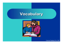 Vocabulary Colorado Reading First, 2005 Reading Component: Vocabulary Content Standards z z Colorado Reading First, 2005 Recognize – The three types of word knowledge – The three tiers of vocabulary words Recognize effective ways to teach vocabulary through – Indirect instruction/Strategies – Direct instruction/Specific Words 2 Reading Component: Vocabulary Oral vocabulary is key when a beginning reader makes the transition from oral to written forms ... McCardle and Chhabra, 2004 Colorado Reading First, 2005 3 Reading Component: Vocabulary New Words Per Grade Level Middle Class Disadvantaged Grade 1 Grade 2 Grade 3 Baker, Simmons, & Kame'enui, 1997 Colorado Reading First, 2005 4 Reading Component: Vocabulary How Many Words Do People Know? z z z There are roughly 88,700 word families used in books up to 12th grade. The average child by the end of high school, may know about half or 45,000 different words. If a child enters 1st grade knowing about 6,000 words, then he must learn about 3,000 new words per year. Stahl, 2003 Colorado Reading First, 2005 5 Reading Component: Vocabulary How Many Words Do You Know? Colorado Reading First, 2005 6 Reading Component: Vocabulary …word knowledge is strongly related to reading proficiency in particular and school achievement in general. Adapted from Beck, McKeown, and Kucan, 2002 Colorado Reading First, 2005 7 Reading Component: Vocabulary Types of Word Knowledge z Terry Gerber Unknown z Tom Cruise Known Your mother/father Your husband/wife Own z Colorado Reading First, 2005 8 Reading Component: Vocabulary Activity: Word Classification z Unknown: Haven’t seen or heard this word or you’ve seen or heard it but can’t define it. z Known: You can define this word. z Owned: You can define this word and you can relate it to other words and terms. Colorado Reading First, 2005 9 Activity: Word Classification 1. Get a set of cards and work on your own. 2. Sort the cards into 3 columns. 3. In the column on the left, place the words that are unknown to you. 4. In the middle column, place the words that you know, but do not own. 5. In the column on your right, place the words that you own. unknown unknown known known own own 10 Reading Component: Vocabulary Activity: Word Classification z z z z z Cherimoya Deadeye Loupe Mantic Rancor Colorado Reading First, 2005 z z z z Tricotine Ruthful Wall Rue Feet of Clay 11 Reading Component: Vocabulary ... in teaching vocabulary the intent is for the child to regard any new word as more than just a label but as a fully formed idea. Shaywitz, 2004 Colorado Reading First, 2005 12 Reading Component: Vocabulary What words should we teach? Colorado Reading First, 2005 13 Reading Component: Vocabulary Choosing Words to Teach Beck, McKeown, Kucan, 2002 z Tier 1: Everyday Words z Tier 2: Extended Words z Tier 3: Expert Words So many words, so little time. Colorado Reading First, 2005 14 Reading Component: Vocabulary Tier 1: Everyday Words z Basic words that rarely require instruction z Examples: clock, baby, happy, walk Colorado Reading First, 2005 15 Reading Component: Vocabulary Tier 3: Expert Words z Words that are low in frequency of use z They are often limited to a specific domain z Examples: stethoscope, barometer, sauté, eviscerated Colorado Reading First, 2005 16 Reading Component: Vocabulary Tier 2: Extended Words z z z Words that are of high frequency for mature language users Words that extend and enrich students’ reading and writing vocabularies Examples: ridiculous, fortunate, grateful, coincidence, curious Colorado Reading First, 2005 17 Introducing Tier 2 Words in a Story Nan and the Ant a poem Nan saw an ant Creeping, crawling up her knee. She gave it a crumb And said , “Come and play with me.” Together they sat Beneath a shady tree, Nan and the ant, Just as happy as can be! McGraw-Hill, grade K, 2001 ed. 18 Introducing Tier 2 Words in a Story Nan and the Ant a poem Nan saw an ant Creeping, crawling up her knee. She gave it a crumb And said , “Come and play with me.” Together they sat Beneath a shady tree, Nan and the ant, Just as happy as can be! McGraw-Hill, grade K, 2001 ed. 19 Reading Component: Vocabulary Two Types of Vocabulary Learning Indirect Vocabulary Learning Colorado Reading First, 2005 Direct Vocabulary Learning 20 Reading Component: Vocabulary Effective Ways to Promote Vocabulary Learning Indirect Vocabulary Learning z Colorado Reading First, 2005 Read alouds 21 Reading Component: Vocabulary Effective Ways to Promote Vocabulary Learning Indirect Vocabulary Learning z Colorado Reading First, 2005 Word rich environment 22 Reading Component: Vocabulary Two Types of Vocabulary Learning Indirect Vocabulary Learning Colorado Reading First, 2005 Direct Vocabulary Learning 23 Reading Component: Vocabulary Effective Ways to Promote Vocabulary Learning Direct Vocabulary Learning z Colorado Reading First, 2005 Specific word instruction 24 Reading Component: Vocabulary Common Methods of Teaching Specific Words z z z z z z Colorado Reading First, 2005 Direct definitions Analogies Categorizing and classifying Antonyms, synonyms, homonyms Semantic mapping Feature analysis 25 Reading Component: Vocabulary Critical Features of Specific Word Instruction 1. Multiple exposures 2. Use synonyms and antonyms 3. Make up novel sentence 4. Classify with other words 5. Direct definitions 6. Relate the definition to one’s own experiences Colorado Reading First, 2005 26 Reading Component: Vocabulary Activity: Coding the Text 1. Find the article “Taking Delight in Words,” and the card that lists “The Critical Features of Specific Word instruction.” 2. Form into groups of four. 3. Your job will be to review the article and find examples of where the authors have embedded critical features of word instruction into their activities. 4. Each time you find an example of a critical feature, write the number of that feature on your article next to the corresponding text. Colorado Reading First, 2005 