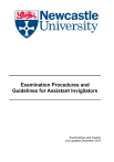 Examination Procedures and Guidelines for Assistant Invigilators Examinations and Awards Last updated December 2015 Contact Details Examination Office Contact Numbers Please ring the following immediately if you experience a problem regarding: (If outside the University or using a mobile, prefix number with 0191 20…) Examination paper or venue Invigilation Students with alternative arrangements 86149 or 86225 or 86084 86926 85261 Other emergency or query Examinations and Awards Manager Examinations and Awards Officer Senior Examinations and Awards Assistant Examinations and Awards Assistants 86084 86225 86149 86926 or 85261 Email address: All examinations related matters exams@ncl.ac.uk 2 GUIDELINES FOR ASSISTANT INVIGILATORS CONTENTS Page A. Introduction .......................................................................................... 4 B. Responsibilities .................................................................................... 4 1. 2. C. Senior Invigilators .......................................................................... 4 Assistant Invigilators ...................................................................... 5 Examination Procedure ....................................................................... 5 3. 4. 5. 6. 7. 8. 9. 10. 11. 12. 13. 14. 15. 16. 17. 18. 19. 20. Venue Set-up ................................................................................. 5 Admitting the Candidates ............................................................... 6 Starting the Examination ................................................................ 6 Conduct of Invigilators ................................................................... 7 Authorised Material ........................................................................ 7 ID Checks ...................................................................................... 7 Entry and Exit from the Examination Room ................................... 8 Confirming ID and Attendance ....................................................... 8 Security Check ............................................................................... 8 Irregularity or Misconduct ............................................................... 8 Examination Queries...................................................................... 9 Supplementary Paper .................................................................... 9 Disturbances .................................................................................. 9 Illness ............................................................................................. 9 Toilet Arrangements ...................................................................... 9 Ending the Examination ................................................................. 10 Administration of Completed Scripts ............................................ 10 Leaving the Hall ............................................................................. 10 Appendix 1 Exam Rules and Related Policies Appendix 2 Senior Invigilator Announcements 3 Student Progress Service Examinations and Awards A. INTRODUCTION The assessment of students and the integrity of our examination process is of paramount importance to the University. Examination Invigilators play a central role in helping us to ensure that security is maintained and examinations are conducted in a fair and appropriate manner and all students are able to sit examinations in a suitable environment. With this in mind, invigilators should not cause any unnecessary disturbance in the examination hall. Soft soled shoes should be worn and any discussions between invigilators or invigilators and students should be conducted in a whisper and kept to a minimum. Invigilators should not read (other than if directly related to the examination), smoke, eat (other than sweets) or otherwise engage in activities which may distract them from carrying out their duties or disturb candidates. Following each examination, Senior Invigilators will be asked to report on the invigilation arrangements and any concerns of this nature will lead to Assistant Invigilators being removed from the pool. Invigilators should bear in mind that examinations can be very stressful for students and can occasionally provoke unreasonable or extreme behaviour. Situations should be dealt with in a sympathetic and supportive manner which minimises any adverse effect on other candidates and maintains security of the examination. All Invigilators are required to familiarise themselves with the University’s Exam Rules and Related Policies (see Appendix 1) before the commencement of the examination. B. RESPONSIBILITIES OF INVIGILATORS 1. Senior Invigilators i. To collect examination papers from the Examinations Office, Level 1, King’s Gate, Barras Bridge. ii. Instruct the Assistant Invigilators which area(s) of the room they should cover during the examination and ensure that candidates are constantly and appropriately supervised. iii. Ensure papers and material are distributed appropriately (according to the seating plan if more than one examination is taking place). iv. Conduct invigilation and administration of the examination process in such a way as to cause minimum disruption to candidates v. Make announcements to candidates as necessary. vi. Ensure conduct in the appointed examination room adheres to the following procedures and the University’s Examination Policies. 4 Student Progress Service Examinations and Awards 2. C. vii. Responsibility for following the correct procedure should a candidate become ill, distressed or behave in a way perceived to be misconduct and liaison with the Examinations and Awards Manager as necessary. viii. Ensure that all invigilators are familiar with the fire exits in the room in which you are invigilating - this information is displayed on a poster in every examination room entitled ‘Useful Information Sheet’. ix. Collect, package and 