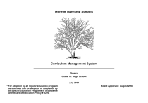 Monroe Township Schools Curriculum Management System Physics Grade 11: High School July 2004 * For adoption by all regular education programs as specified and for adoption or adaptation by all Special Education Programs in accordance with Board of Education Policy # 2220. Board Approved: August 2005 Table of Contents Monroe Township Schools Administration and Board of Education Members Page 3 Acknowledgments Page 4 District Mission Statement and Goals Page 5 Introduction/Philosophy/Educational Goals Page 6 - 8 National and State Standards Pages 9 - 14 Goals/Objectives/Instructional Tools/Activities Pages 15 - 42 Benchmarks Pages 43 2 MONROE TOWNSHIP BOARD OF EDUCATION MONROE TOWNSHIP ADMINISTRATION Dr. Ralph P. Ferrie, Superintendent Dr. Christopher H. Tienken, Assistant Superintendent BOARD OF EDUCATION Ms. Kathy Kolupanowich, President Mr. Lew Kaufman, Vice President Mr. Marvin Braverman Ms. Carol Haring Mr. Joseph Homoki Mr. John Leary Ms. Kathy Leonard Mr. Harold Pollack Ms. Amy Speizer JAMESBURG REPRESENTATIVE Ms. Patrice Faraone Student Board Members Mr. Darren Goldberg Mr. Brian Hackett Mr. George Leonard 3 The following individuals are acknowledged for their assistance in the preparation of this Curriculum Management System: Writers Names: Deborah A. Donzelli Supervisor Name: Dr. John T. Roberts, Supervisor of Physical and Biological Science Technology Staff: Al Pulsinelli Reggie Washington Bill Wetherill Secretarial Staff: Debby Gialanella Geri Manfre Gail Nemeth 4 Monroe Township Schools Mission and Goals Mission The mission of the Monroe Township School District, a unique multi-generational community, is to collaboratively develop and facilitate programs that pursue educational excellence and foster character, responsibility, and life-long learning in a safe, stimulating, and challenging environment to empower all individuals to become productive citizens of a dynamic, global society. Goals To have an environment that is conducive to learning for all individuals. To have learning opportunities that are challenging and comprehensive in order to stimulate the intellectual, physical, social and emotional development of the learner. To procure and manage a variety of resources to meet the needs of all learners. To have inviting up-to-date, multifunctional facilities that both accommodate the community and are utilized to maximum potential. To have a system of communication that will effectively connect all facets of the community with the Monroe Township School District. To have a staff that is highly qualified, motivated, and stable and that is held accountable to deliver a safe, outstanding, and superior education to all individuals. 5 INTRODUCTION, PHILOSOPHY OF EDUCATION, AND EDUCATIONAL GOALS Philosophy The effective district K-12 Science Education program will provide students with inquiry- based skills and an understanding of the scientific process, which will enable them to be successful in their exploration and investigation of our ever-changing technological world. Students will develop higher - level critical thinking and problem - solving skills that will allow them to explore their scientific environment in a multi-sensory “hands-on” and “minds-on” manner. Students’ inquiry-oriented experiences will allow them to construct their own understanding of science and technology and provide opportunities for modeling true scientific practices. Students will use the Scientific Method as an approach to inquiry-based investigations. Other approaches, such as “ACACC” (developed at Monroe), the “5 E’s” used by McGraw Hill or the Frisch model, may be used. Students will be able to recognize the contributions, as well as, the diverse, cultural, and social backgrounds of scientists. Students will be exposed to and use scientific tools and apparatus, scientific nomenclature and SI (metric) measurement. Students will learn and understand the underlying safety principles during their practice of Science. Workplace Readiness and Process skills will be embedded in the Program. The use of technology is infused throughout the curriculum. As the Science program becomes more inquiry-based, the program will also become more interdisciplinary. The students will be exposed to opportunities to develop their skills and knowledge in Mathematics and Language Arts as they practice Science. The primary beliefs of this philosophy are: to provide experiences that will foster and develop scientific inquiry, to allow students to construct their own understanding of science, to understand and utilize the scientific process, to promote an awareness of the availability and diversity of the scientific profession, to apply safety practices in scientific exploration, to integrate technology and other tools throughout the scientific process. Each of the Science Curriculum Writing Teams, K-2, 3-5, 6-8 and the High School courses, selected topics that would address the New Jersey Core Content Standards. Additionally, these topics address some of the National Science Standards that are covered by the TerraNova Assessment. Most of the activities are based on an inquiry approach to Science and address this process standard. Additionally, Work Readiness Standards and other interdisciplinary standards, in particular Math and Language Arts, are embedded in the curriculum. 6 The curriculum was recently correlated with the revised Science Standards, which were adopted by the State BoE in July 2002. Our program is consistent with these standards even though some of the CPI’s are in a different order. The new standards now contain four process standards and six content areas: Life Science (LS), Chemistry C, PS), Physics (P, PS), Earth Science (ES), Space Science (SS) and Environmental Science (EnS). The K-2 program is very cursory and provides a brief glimpse into the 6 content areas and 1 of the process standards, Scientific Processes, 5.1. The grades 3-5 Science curriculum was written as a continuat