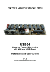 DOEPFER MUSIKELEKTRONIK GMBH USB64 Universal Control Electronics with Midi and USB Output Installation and User's Guide V1.3 © 2009 by Doepfer Musikelektronik GmbH, Germany Table of contents Table of contents.................................................................................................................................... 2 Electrical safety / EMC compatibility ....................................................................................................... 3 Warranty ................................................................................................................................................ 4 Introduction ............................................................................................................................................ 5 Connection and Installation .................................................................................................................... 6 Midi In Socket (1)................................................................................................................................ 6 Midi Out Socket (2) ............................................................................................................................. 6 Power Supply (3) ................................................................................................................................ 6 USB connector (4) .............................................................................................................................. 7 USB connector (4) .............................................................................................................................. 8 Connectors for the 64 controls (5) ...................................................................................................... 8 (6) Pin header JP9............................................................................................................................ 11 (7) Pin headers JP10, JP11, JP14, JP12, JP15 ................................................................................ 13 JP10 / 14....................................................................................................................................... 13 JP12 / JP15................................................................................................................................... 14 JP11.............................................................................................................................................. 14 (8) Pin header JP13.......................................................................................................................... 15 (9) Control LED................................................................................................................................. 15 Mounting .............................................................................................................................................. 16 Dimensions .......................................................................................................................................... 17 Check list.............................................................................................................................................. 18 Extent of delivery.................................................................................................................................. 19 Electrical safety / EMC compatibility USB64 is a so-called OEM product (OEM original equipment manufacturer) that cannot be used independently but has to be combined with additional electrical or electronical equipment to become a working device (e.g. potentiometers, switches, power supply, case/housing). The manufacturer of USB64 does not know the final assembly of the complete device in which the USB64 is used as a part of the complete device. The final responsibility with regard to electrical safety and electromagnetic compatibility is up to the user who is assembling the complete device. Electronic basic knowledge is required to install USB64 and to connect the controls resp. control voltages. If you are not sure whether your knowledge is sufficient please consult an expert. We cannot take back modules that became defective because of wrong installation or wrong connection of the controls or voltages. Please pay attention to the following items: The power supply used in combination with the USB64 has to be a closed type (in Germany a power supply with VDE approval is required). Normally an AC adapter with plastic case is used. It is not allowed to use open power supplies whith open mains voltage access (e.g. via mains lead, pcb tracks, electronic parts). On the USB64 preventing measures against electromagnetic radiation are taken (e.g. an RF filter at the power supply input). But it is impossible to estimate to what extend the components added by the user affect the EMC properties of the complete assembly. Therefore the complete device has to be shielded against electromagnetic radiation (incoming and outgoing). These demands are normally met by a closed metal case that covers the complete assembly. The metal case should be connected to GND of the USB64. USB64 User's Guide V1.3 Page 3 Warranty • • • • • • • • • • • Applying any negative voltage (< 0V) or positive voltage above +5V (> +5V) to one of the 64 analog inputs (JP1 – JP8 ) will destroy the circuit ! If potentiometers and/or switches are connected between GND and +5V of USB64 as described in this manual no problems will occur. When external control voltages are connected to USB64 the user has to pay attention that the voltages applied are strictly within GND and +5V referenced to GND of USB64 ! Do not solder directly to any of the pin headers but use female connectors to make the connections between USB64 and the potentiometers, switches or voltages. A cable set that contains all required connectors and cables is in