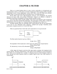 CHAPTER 4: FILTERS Filters are essential building blocks in many systems, particularly in communication and instrumentation systems. A filter passes one band of frequencies while rejecting another. Typically implemented in one of three technologies: passive RLC filters, active RC filters and switchedcapacitor filters. Crystal and SAW filters are normally used at very high frequencies. Passive filters work well at high frequencies, however, at low frequencies the required inductors are larges, bulky and non-ideal. Furthermore, inductors are difficult to fabricate in monolithic from and are incompatible with many modern assembly systems. Active RC filters utilize op-amps together with resistors and capacitors and are fabricated using discrete, thick film and thin-film technologies. The performance of these filters is limited by the performance of the op-amps (e.g., frequency response, bandwidth, noise, offsets, etc.). Switched-capacitor filters are monolithic filters which typically offer the best performance in the term of cost. Fabricated using capacitors, switched and op-amps. Generally poorer performance compared to passive LC or active RC filters. Filters are generally linear circuits that can be represented as a two-port network: + Vi(s) - + Vo(s) Filter circuit - The filter transfer function is given as follows: V (s) T( jω) = T(s) = o Vi (s) The magnitude of the transmission is often expressed in dB in terms of gain function: G(ω)dB=20log(|T(jω)| Or, alternatively, in terms of the attenuation function: A(ω)dB=-20log(|T(jω)| A filter shapes the frequency spectrum of the input signal, according to the magnitude of the transfer function. The phase characteristics of the signal are also modified as it passes through the filter. Filters can be classified into a number of categories based on which frequency bands are passes through and which frequency bands are stopped. Figures below show ideal responses of various filters. A A Stopband Stopband Passband fc f LOW-PASS FILTER RESPONSE EE 323 - Filters Passband fc f HIGH-PASS FILTER RESPONSE 68 A A BW BW Passband f1 Stopband f2 Stopband f BANDPASS FILTER RESPONSE f1 Passband f2 f BANDSTOP FILTER RESPONSE Center frequency Quality factor Q (how fast the roll-off is) f 0 = f1f 2 Q= f0 BW Wideband filter: Q < 1 Narrowband filter: Q > 1 A f ALLPASS FILTER RESPONSE Ideal filters could not be realized using electrical circuits, therefore the actual response of the filter is not a brick wall response as shown above but increases or decreases with a roll-off factor. Realistic transmission characteristics for a low pass filter are shown below. EE 323 - Filters 69 Transmission of a low pass filter is specified by four parameters: - Passband edge, ωp - Maximum allowed variation in passband transmission, Amax - Stopband edge, ωs - Minimum required stopband attenuation, Amin The ratio ωs/ωp is usually used to measure the sharpness of the filter response and is called the selectivity factor. The more tightly one specifies a filter (i.e., lower Amax, higher Amin, ωs/ωp closer to unity) the resulting filter must be of higher order and thus more complex and expensive. Amax is commonly referred as the passband ripple. The process of obtaining a transfer function that meets given specifications is known as filter approximation. Filter approximation is usually performed using computer programs or filter design tables. In simple cases, filter approximation can be performed using closed form expressions. Figure below shows transmission specifications for a bandpass filter. General notes: - - EE 323 - Filters Each capacitive/inductive element adds a pole or zero to the frequency response. By adding additional poles/zeroes we can increase the roll-off of the filter response (e.g., two-pole lowpass filter would have a –40dB/decade roll-off at high frequency). In adding poles, we must take into account the loading of successive stages as shown 70 - - Additional of buffer removes impedance matching effects. When capacitors are combined with inductors, it is possible to make circuits with very sharp response. Example of a 2nd order LC filter: R j2πfL=sL Vin Vout 1/j2πfC=1/sC T (s ) = o = - - EE 323 - Filters 1 sC R + sL + 1 LC 1 sC = 1 s 2 LC + sRC + 1 0 = R Q L Q= L R = 0 = 2 o s2 + o s+ Q 2 1 L R C Q of the circuit affects response. When Q=0.5, response is equivalent to 2 pole RC filter. High Q pumps up gain below cutoff and increases slope after cut off. Single RC filter has large passband ripple and shallow rolloff. Addition of RC stages increase rolloff, however, passband flatness not affected and using a large number of stages does not give sharp cutoff of first 50dB. Eight-section LC is better than 32-section RC. 71 - - By adjusting the Q of each section of a filter, it is possible to achieve better response. For a two-section filter, we can increase the Q of the second stage so that the peak fills in the rounded area just beyond cutoff of the first section. The scheme improves the passband flatness just short of cutoff and allows us to reach ultimate slope just after cutoff. There are Q’s which give optimum performance of the filter. How to select the Q to give optimum performance and what is the optimum response? Butterworth response: For a Butterworth filter, the optimum is flat response in the passband and steep slope soon after cutoff (maximum flat filter). This is done by combining low Q section and high Q section. The problem is similar to finding Fourier series of a square wave. The solution lies in the use of the Butterworth polynomial. Four and eight-pole Butterworth filters are common. Standard table can be used to find component values. Butterworth filters are also called maximum flat filter. Chebyshev response: In some applications, the sharpness of the cutoff response is more important than the passband flatness. By adding higher resonant peaks, it is possible to obtain sharper cutoff at the expense of peaks in the passband. The s