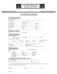 Ace Pilot Training, Inc. Flight Instruction / Aircraft Rentals 600 Hayden Circle Allentown, PA 18109 Phone (610) 264-1105 Fax (610) 264-1106 Aircraft Rental Agreement Personal Information Name (Last, First MI.): ___________________________________________________________ Home Address: _________________________________________________________________ Home Phone: __________________ Business Phone: ___________ E-mail Address ________________ Cellular No. : _____________ Pager No : ________ Height (inches)_________________ Weight___________________ Sex______________ Date Of Birth__________________ Eye Color_________________ Hair______________ Place Of Birth__________________ SSN _____________________ Phone____________ DL # _________________________ State______________________ Expire ____________ Emergency Contact_ Name : _____________________ Phone Number : _____________ Airman Information Pilot Certificate Type: __Student __Private __Commercial __ ATP __ CFI __CFII __MEI Category / Class / Ratings: __SEL __MEL __Instrument __ Gyroplane __ SES __Helicopter Cert No._________________________ Medical Class: ____________________ Date_______________________________ Medical Expiration Date: ______________ Last BFR Date: ___________________ Checked Out By : __MES __ Glider __ Center Line Thrust __Seaplane ____________________ Flight Experience Previous Flight Credit________________________ Previous Flight School ______________ Hours Total Hours______ PIC _____________ Past 90 days ______ SE Fixed ________ PA-28-140 _______ ( Cherokee ) SE Complex ______ M20C ___________ ( Mooney ) Multi Engine _____ PA-34-200 _______ ( Seneca ) Instrument _______ Ace Pilot Training Information ( optional ) Course Enrolled In ________________________________ Date_________________ Checklist completed by ____________________________ Date_________________ I (“Renter”) have read and fully understand the terms and conditions for the rental of aircraft from Ace Pilot Training, Inc. (“Operator”) ________________________ Signature 04-05-05 ______________________ Print ________________ Date Aircraft Rental Agreement ( cont’d ) Do you have any physical conditions, limitations, or impairments that require a waiver or special condition to be attached or indicated on your medical certificate? __ yes __no Explain: ________________________________________________________________________ _______________________________________________________________________________ Has your FAA or DOT Military pilot certificate ever been suspended or revoked? __ yes___no Explain: ________________________________________________________________________ _______________________________________________________________________________ Have you ever been cited for any violations of Federal or Canadian Air regulations or have any limitations ever been placed on your pilot certificate? __ yes___no Explain: _______________________________________________________________________ ______________________________________________________________________________ Have you ever been convicted of or pleaded guilty to a charge of reckless driving or driving under the influence of alcohol or drugs during the last five years? __ yes___no Explain: _______________________________________________________________________ ______________________________________________________________________________ Have you ever had any Aircraft accidents or incidents while acting as the pilot within the previous five years? __ yes __no Dates, places, make and model, details: ________________________________________________ ________________________________________________________________________________ ________________________ Signature 04-05-05 ______________________ Print ________________ Date Aircraft Rental Agreement ( cont’d ) 1. Rental Period: The rental period shall be in one tenth (0.10) hour increments as determined by the "Hobbs" meter. 2. Aircraft Care All club aircraft are owned by Ace Pilot Training, Incorporated. Each renter is responsible for the aircraft in his or her possession at all times and is expected to treat the aircraft with the utmost care. The renter is required to report all known trouble, malfunctions, or damage to an aircraft notifying the office immediately upon detection and in cases that deem the aircraft unairworthy, record the discrepancy in the discrepancy log on board the aircraft. Renters will be charged for any damage or abuse not previously squawked. Any aircraft damage found must be entered on the discrepancy sheet and reported to office personnel prior to operating the aircraft. Failure to identify and report previously unsquawked damage (such as bald spots on tires) may result in the renter being charged for the damage. Without notifying Ace Pilot Training staff before using the aircraft, the renter may be held responsible for the damage. Expendable items such as batteries, tires, etc. will be charged on a prorated basis. Renters are expected to conduct their flight operations in a manner that will allow normal climbs, cruises and descents consistent with careful and considerate operation of the aircraft. In particular, descents from altitude shall be planned in a manner to prevent shock cooling of the aircraft engine due to rapid power reduction. No renter may knowingly exceed the operating limitations of the aircraft except during an emergency. Off-taxiway operations are prohibited for any reason. Aircraft operations on gravel or non-paved areas are prohibited. Renters will be held accountable for the total cost of any damage caused by off-pavement operations. Renters may be held liable for damage or injury resulting from an occurrence which is determined to be the fault of said renter. At the conclusion of the flight, the aircraft is to be returned to Hangar 7 and Lehigh Valley International Airport and properly secured with tie down ropes and chalks, as appropriate. The aircraft interior is to be left neat and clean with all perso