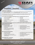 Oi l a &G s Exceptional ... Everytime! Oil & Gas Industry With each Team Leader possessing 10 – 20 Years experience, BAR Engineering not only contributes high level engineering expertise, but also the practical know-how to get your job done right. BAR Engineering’s Oil & Gas Team is comprised of 35 professionals and support staff. They are recognized for their leadership in the Heavy Oil and Natural Gas industry and now bring this experience to the Conventional Light Oil market as well. From complex to basic engineering, BAR Engineering has completed facility projects for: • Light Oil Well Site Batteries • Oil Treating • Heavy Oil Well Sites • Raw Water • Thermal Well Sites • Produced Water Disposal Systems • Pipelines and Gathering Systems • Waste Handling • Midstream • Electrical & Instrumentation • Natural Gas Compression • Flare & Solution Gas Capture Our Oil & Gas clients have unique needs. This is why BAR Engineering offers unique engineering services specific to this industry: Mechanical & Process • • • • • • Concept Development Studies Economic Feasibility Studies Utility Review Design & Documentation Services Materials Research & Specification P & I D Development • • • • • Electrical & Instrumentation • • • • Specification & Design Programming Review Switchgear & Motor Control Centers Adjustable Speed Drives, Phase Converters and Soft Starters Equipment Procurement Engineering Discipline Coordination Pipeline Route Selection Regulatory Applications & Approvals Crossing Agreements • Area Classification & Fugitive Emissions Studies Power System Analysis Control Systems & Instrumentation PLC and MMI Programming HAZOP Analysis • Tank Bases – Granular & Structural Steel • • • • Civil Engineering – Structural • Pipe Racks & Building Skids Lloydminster, AB • t: (780) 875-1683 • f: (780) 875-2728 Weyburn, SK • t: (306) 842-4300 • f: (306) 842-4404 e: info@bareng.ca • w: bareng.ca Oil & Gas Industry Our clients benefit from our team’s wealth of knowledge in the following areas: Design & Drafting • 2D & 3D Applications Design & Layout o Piping o Plant o Electrical & Instrumentation o Civil Site Work o Structural Preliminary Engineering & Regulatory • • • • • Life Cycle Cost Analysis Energy Studies Economic Feasibility Studies Site Analysis Existing Facility Surveys & As-Builts • Regulatory Assistance • By-Law Compliance Review • Public Participation • Crossing Agreements • Project Management • • • • • • • Project Administration Engineering Discipline Coordination Material Specification Equipment Procurement Project Scheduling Project Budgets & Cost Estimates Analysis of Alternatives & Substitutes Design & Drafting Software o CADWorx ♦♦ 3D Civil & Structural ♦♦ Automated Isometric Generation ♦♦ Plant Professional & Equipment o CAD Pipe ♦♦ 3D Design ♦♦ ISO & ORTHO o ProCAD ♦♦ AutoFLOW ♦♦ Auto ISO ♦♦ Auto ELECTRIC o AutoCAD ♦♦ Raster Design ♦♦ Civil 3D ♦♦ Navisworks ♦♦ Inventor ♦♦ Revit MEP, Structural, Architectural o Bentley MicroStation o ETAP (Electrical Modeling & Analysis) o Allen Bradley Rockwell Software • • • • • • Contract Tender Administration Progress Cost & Schedule Monitoring & Reporting Commissioning Start Ups Review Operations & Maintenance Manuals As-Built Drawings Lloydminster, AB • t: (780) 875-1683 • f: (780) 875-2728 Weyburn, SK • t: (306) 842-4300 • f: (306) 842-4404 e: info@bareng.ca • w: bareng.ca Mu n al p i ic Exceptional ... Everytime! Municipal Industry Our experienced team is routinely recognized for outstanding performance. BAR Engineering’s municipal team of 10 professionals and support staff are steeped in municipal and property development engineering experience. Our Municipal clients have unique needs. This is why BAR Engineering offers unique engineering services specific to this industry: Civil Engineering – Municipal Industrial & Residential Subdivision Design o Conceptual Lot & Road Layout o Grading & Drainage Design o Lot Servicing • Water Distribution o Water Mains & Services o Improvement Analysis & Programs • Topographical Surveys • Sanitary Sewer Collection & Treatment o Sewer Mains & Services o Sewage Lagoons o Improvement Analysis • Storm Sewer Collection & Surface Water Management o Sewer Mains & Services o Retention & Detention Ponds • Streets & Roads o Drainage Design o Geometrics • Civil Engineering – Structural • • • Pumping & Lift Station Facilities Water Treatment Facilities Bridges Mechanical • Pumping & Lift Station Facilities Electrical & Instrumentation • • • Street & Parking Lot Lighting Electrical Utility Services Interface Pumping & Lift Station Facilities Lloydminster, AB • t: (780) 875-1683 • f: (780) 875-2728 Weyburn, SK • t: (306) 842-4300 • f: (306) 842-4404 e: info@bareng.ca • w: bareng.ca Municipal Industry Our clients also benefit from our team’s wealth of knowledge in the following areas: Design & Drafting • 2D & 3D Applications o Piping Layout & Design o Road Layout & Design o Detail Drawings • Design & Drafting Software o AutoCAD ♦♦ Civil 3D Preliminary Engineering & Regulatory Life Cycle Cost Analysis • Energy Studies • Economic Feasibility Studies • Site Analysis • Existing Facility Surveys & As-Built Reviews • Regulatory Assistance • Project Management • • • • • • • • • Project Administration • Material Specification • Equipment Procurement • Project Scheduling • Project Budgets & Cost Estimates • Analysis of Alternatives & Substitutes • Contract/Tender Administration Progress Cost & Schedule Monitoring & Reporting Change Order Management Commissioning Start Ups Project Close Outs As-Built Drawings Inspections – Including Warranty Inspections Maintenance Manuals Lloydminster, AB • t: (780) 875-1683 • f: (780) 875-2728 Weyburn, 