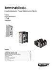 Terminal Blocks Fuseholders and Power Distribution Blocks Catalog 9080CT9603R03/15 2016 Class 9080 CONTENTS Description . . . . . . . . . . . . . . . . . . . . . . . . . . . . . . . . . . . . . . . . . . . . . Page Enclosed Power Distribution Blocks. . . . . . . . . . . . . . . . . . . . . . . . . . . . . . .4 9080LBA Power Distribution Blocks. . . . . . . . . . . . . . . . . . . . . . . . . . . . . 10 9080LBA and LBC Power Distribution Blocks . . . . . . . . . . . . . . . . . . . . . .14 9080FB Fuseholders . . . . . . . . . . . . . . . . . . . . . . . . . . . . . . . . . . . . . . . . .16 Dimensions. . . . . . . . . . . . . . . . . . . . . . . . . . . . . . . . . . . . . . . . . . . . . . . . .20 Short-Circuit Current Ratings . . . . . . . . . . . . . . . . . . . . . . . . . . . . . . . . . . .28 Stranded Wire Applications . . . . . . . . . . . . . . . . . . . . . . . . . . . . . . . . . . . .36 Wire Classes . . . . . . . . . . . . . . . . . . . . . . . . . . . . . . . . . . . . . . . . . . . . . . .37 Index of Catalog Numbers . . . . . . . . . . . . . . . . . . . . . . . . . . . . . . . . . . . . .46 Terminal Blocks Family Description Schneider Electric NSYEB Enclosed Power Distribution Blocks NSYEB power distribution blocks are enclosed IEC versions of our NEMA 9080 power distribution blocks, which are finger safe from the front according to IP20, and available with copper or aluminum lugs. They have Short-Circuit Current Ratings (SCCR) up to 100 kA with fuses. They are one-pole modular units with an interlocking dovetail feature that enables ganging of the blocks to create multi-pole configurations according to application requirements. Most are UL Listed (some are UL component recognized), CSA approved, and RoHS compliant. CE marking ensures acceptance throughout the European community. The UL Listed blocks meet feeder circuit spacing requirements. Square D 9080 Open Power Distribution Blocks Available in a wide variety of sizes, these NEMA open power distribution blocks are available in one, two, and three pole versions with either aluminum or copper lugs. Many blocks have been tested to achieve SCCR up to 100 kA. They are UL component recognized, CSA approved, RoHS compliant, and CE marked. A selection of covers completes this family. Class 9080 Type LB Square D 9080 FB Fuse Holders This family of NEMA fuse holders will accept types H, R, CC, M, and J fuses up to 200 amperes. Both 250 V and 600 V versions are available. Types H, R, J, and CC are UL Listed. Type M fuse holders are UL component recognized. They are all CSA approved, CE marked, and RoHS compliant. Class 9080 Type FB NOTE: The product lines listed below are not shown in this catalog. Please refer to the referenced catalog included with each family. Family Description Schneider Electric Linergy Terminal Blocks Depending on the application, there are several types of IEC terminal blocks: • • • • Screw technology terminal blocks are suitable for the majority of connection applications due to their wide range of functions and connection possibilities. Spring technology requires no maintenance and helps provide a separation of mechanical and electrical functions. Push-in terminal blocks reduce wiring time and eliminate the need for regular re-tightening. The hybrid offer is a combination of screw terminal and Insulation Displacement Connection (IDC). These blocks are UL component recognized, CSA approved, CE marked, and RoHS compliant. Refer to catalog 9080CT1301 Square D 9080 Terminal Blocks This family of NEMA blocks and accessories offers features such as a large variety of colors, high density to save space in applications, multiple mounting methods such as 35 mm DIN rail, 9080GH (3/4") track, or direct panel mounting. They are UL component recognized, CSA approved, RoHS compliant, and CE marked. Refer to Catalog 9080CT9601. Class 9080 Type G Circuit Protectors There are two families of circuit protectors. The Square D 9080 Type GCB thermal magnetic product line is available from 0.1–15 A. The Schneider Electric GB2 IEC thermal magnetic products are available from 0.5–12 A. Both product lines are UL component recognized, CSA approved, RoHS compliant, and CE marked. Refer to Catalog 9080CT9601 or Catalog 9080CT9602. 3 © 1993–2016 Schneider Electric All Rights Reserved 04/2016 ™ Terminal Blocks Enclosed Power Distribution Blocks Without the use of additional shields, these Schneider Electric™ IEC power distribution blocks are designed to prevent contact with live connectors from the front according to IP20. The blocks are available with aluminum or copper terminals and have high fault SCCR up to 100 kA with an assortment of fuses. They are designed to meet a variety of load distribution or splicing applications. Specifications: • • • Up to 760 A • 35 mm DIN rail or panel mounting options 600 V AC/DC Multiple wire ratings Maximum Voltage Rating 600 600 Standards: Current Rating, Cu Wire 115 115 • Current Rating, Al Wire N/A N/A Mounting 35 mm DIN Rail or Panel 35 mm DIN Rail or Panel SCCR with Fuses Up to 100 kA, see page 28. Up to 65 kA, see page 28. Line Line Cu: (1) 14–2 AWG (2.5–35 mm2) Cu: (1) 14–2 AWG (2.5–35 mm2) Load Load Cu: (1) 14–2 AWG (2.5–35 mm2) Cu: (4) 14–10 AWG (2.5–6 mm2) 75 °C Conductors 75 °C Conductors Line Line Cu: 3–2 AWG (35 mm2): 50 (5.6) Cu: 6–4 AWG (16–25 mm2): 45 (5.1) Cu: 8 AWG (10 mm2): 40 (4.5) Cu: 14–10 AWG (2.5–6 mm2): 35 (4.0) Cu: 3–2 AWG (35 mm2): 50 (5.6) Cu: 6–4 AWG (16–25 mm2): 45 (5.1) Cu: 8 AWG (10 mm2): 40 (4.5) Cu: 14–10 AWG (2.5–6 mm2): 35 (4.0) Load Load Cu: 3–2 AWG (35 mm2): 50 (5.6) Cu: 6–4 AWG (16–25 mm2): 45 (5.1) Cu: 8 AWG (10 mm2): 40 (4.5) Cu: 14–10 AWG (2.5–6 mm2): 35 (4.0) Cu: 14–10 AWG (2.5–6 mm2): 35 (4.0) Terminal Screw Drive, Line Side 5/32 Hex 5/32 Hex Terminal Screw Drive, Load Side 5/32 Hex 5/64 Hex Lug Material Tin Plated Aluminum Tin Plated Aluminum Base Material Thermoplastic Therm