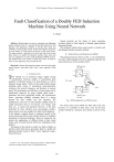 World Academy of Science, Engineering and Technology 30 2009 Fault Classification of a Doubly FED Induction Machine Using Neural Network A. Ourici Abstract—Rapid progress in process automation and tightening quality standards result in a growing demand being placed on fault detection and diagnostics methods to provide both speed and reliability of motor quality testing. Doubly fed induction generators are used mainly for wind energy conversion in MW power plants. This paper presents a detection of an inter turn stator and an open phase faults, in a doubly fed induction machine whose stator and rotor are supplied by two pulse width modulation (PWM) inverters. The method used in this article to detect these faults, is based on Park’s Vector Approach, using a neural network. Neural networks are the object of many researches nowadays thanks to their capacity of training, approximation and generalization. The proposed method shows good results to classify safe and damaged machine using this method. II. DESCRIPTION AND MODELING OF DFIM The proposed system is shown on Fig. 1, it is constituted by two pulse width modulation inverters supplying separately the stator and the rotor of the machine [1] [2]. Keywords—Doubly fed induction machine, inter turn stator fault, neural network, open phase fault, Park's vector approach, PWM inverter. PWM inverter for stator I. INTRODUCTION T HE rational use of electrical energy implies having transportation networks capable of transmitting large quantities of electrical energy over long distances as well as adequate storage plants. Nearly all the pump turbine groups operating today consist of synchronous motor-generators working at the network frequency and therefore at constant speed. The performance and efficiency of such groups can be significantly improved by using variable speed motor – generators and more specifically doubly fed asynchronous motor –generators (DFIM); nowadays there is a strong demand for their reliable and safe operation. The manufacturers and users of such machines initially relied on simple protections such as over-current, over-voltage, earth fault, etc.., to ensure safe operation. However, as the tasks performed by these machines grew increasingly complex, improvements were also sought in the field of fault diagnosis. In the industry, methods based on analytical models of the motor systems are still the most common choices for condition monitoring of electrical machinery. However, during the last decade also applications of different kinds of data- based modes such as Neural Network (NN) have established a firm position. We propose in this article to classify two kinds of faults: an interturn stator fault and an open phase fault in a doubly fed induction machine, based on Park’s Vector Approach, using a Neural Network. D C source Load PWM inverter for rotor Fig. 1 DFIM supplied by two PWM inverters We choose three levels PWM for both stator and rotor inverters, it is constitute of three arms, every one has four switches formed by a transistor and a diode as shown in Fig. 2. A.Ourici is now with Electrical Engineering Institute of Badji Mokhtar University of Annaba, Algeria (e-mail: a_ourici@hotmail.com). 1011 World Academy of Science, Engineering and Technology 30 2009 T12 D12 T22 D22 D11 T21 D21 T32 D32 E /2 T11 T13 T23 D13 T31 D31 time[s] T33 D23 D33 E/2 T14 D14 T24 D24 Va T34 Vb time[s] D34 Vc time[s] Fig. 2 General diagram of a three level PWM inverter Fig. 3 Carrying voltage, simple voltage and phase voltage The simple voltages are obtained starting from the following conditions: Stator and rotor voltages of the machine after Park transformation are given by [3]: If (V réf = V p) and (V réf > 0) = > V K = + E/2 If (V réf = V p) and (V réf < 0) =>VK =-E/2 If V réf = V p = > V K = 0 With V réf: reference voltage standard; V p: carrying; V K: potential of the node K. ⎧Vds = RsIds + d ψds − dθsψqs ⎪ dt dt ⎨ ⎪Vqs = RsIqs + d ψqs + dθsψds dt dt ⎩ (1) ⎧Vdr = RrIdr + d ψdr − dθrψqr ⎪ dt dt ⎨ ⎪Vqr = RrIqr + d ψqr + dθrψdr dt dt ⎩ (2) Stator and rotor fluxes are given by: ⎧ψds = LsIds = MIdr ⎪ ⎪ψqs = LsIqs + MIqr ⎪ ⎨ψdr = LrIdr + MIds ⎪ ⎪ψqr = LrIqr + MIqs ⎪ ⎩ (3) Mechanic equation is given by: Cem =Cr + J dΩ + fΩ dt 1012 (4) World Academy of Science, Engineering and Technology 30 2009 The Vector’s Park Approach is a relatively new diagnostic technique, which has been successfully applied in the diagnosis of rotor faults, inter turn stator faults and unbalanced supply voltage [4] [5]. The instantaneous line currents of the stator are transformed into Park’s vector using (5). An undamaged machine theoretically shows a perfect circle as shown in Fig. 4. An unbalance due to turn faults results in an elliptic representation of the Park’s vector as shown in Fig. 5. ⎡ 2 ⎤ ia −1 ib −1 ic ⎥ ⎢ 3 ⎡ids ⎤ 6 6 ⎥ ⎢ ⎥=⎢ ⎢ 1 ib −1 ic ⎥ ⎢⎣iqs ⎥⎦ ⎢ 0 ⎥ 2 2 ⎥⎦ ⎢⎣ [A] [A] Fig. 4 Park's vector of healthy machine [A] [A] Fig. 6 Park’s vector of faulty machine (Open phase) (5) We choose to use a neural network to classify the state of the machine (safe or faulty). We attribute for every shape of the Park’s vector a label describing the operating state of the machine: -The state “Safe machine” is classified by a label “0” at the neural network output. -The state “machine with an open phase fault” is classified by a label “1” at the neural network output. -The state “machine with an inter turn stator fault” is classified by a label “2” at the neural network output. For the construction of the multiple coatings network [6] we adopt the error retro propagation method which is based on the gradient descent algorithm. The calculation stages of the neural network can be resumed like this: a- The output of the latent layer n yi = f jc (∑ wcji xi +b cj ) (6) i =1 [A] b- The outputs of the output layer m ok = 
