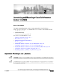 CH A P T E R 2 Assembling and Mounting a Cisco TelePresence System TX1310 65 February 17, 2014, OL-26384-01 This chapter contains the procedure you use to mount and assemble a Cisco TelePresence System TX1310 65 (TX1310 65). You can mount the TX1310 65 to any of the following wall types: • A wall with wooden studs • A wall with steel studs • A concrete, concrete block, or brick wall This chapter includes the following sections: • Important Warnings and Cautions, page 2-1 • Preinstallation Checks, page 2-3 • Required Tools and Accessories, page 2-10 • Parts List, page 2-11 • Attaching the Mounting Bracket to a Wall With Wooden Studs, page 2-14 • Attaching the Mounting Bracket to a Wall With Steel Studs, page 2-20 • Attaching the Mounting Bracket to a Concrete, Concrete Block, or Brick Wall, page 2-27 • Attaching the Light Reflector, Display, and Cabinet, page 2-32 • Completing Installation and Cabling of the TX1310 65, page 2-52 Important Warnings and Cautions Warning Caution A WARNING alerts you to the possibility of serious injury or death if you do not follow the instructions. A CAUTION alerts you to the possibility of damage or destruction of equipment if you do not follow the corresponding instructions. Cisco TelePresence System TX1310 65 Assembly, First-Time Setup, and Field Replaceable Unit Guide OL-26384-01 2-1 Chapter 2 Assembling and Mounting a Cisco TelePresence System TX1310 65 Important Warnings and Cautions Warning Failure to read, thoroughly understand, and follow all instructions can result in serious personal injury, damage to equipment, or voiding of factory warranty! It is the installer’s responsibility to make sure all components are properly assembled and installed using the instructions provided. Warning Failure to provide adequate structural strength for the installation of this kit can result in serious personal injury or damage to equipment! It is the installer’s responsibility to make sure the structure to which this kit is attached can support five times the combined weight of all equipment. Warning Exceeding the weight capacity can result in serious personal injury or damage to equipment! It is the installer’s responsibility to make sure the combined weight of all components attached to this accessory does not exceed 275 lbs (125 kg). Caution Some TX1310 65 elements are heavy, and metal edges can be very sharp. Protect your hands and eyes from injury by wearing safety gloves and glasses. Warning WARNING: IMPROPER INSTALLATION CAN LEAD TO EQUIPMENT FALLING CAUSING SERIOUS PERSONAL INJURY OR DAMAGE TO EQUIPMENT! Figure 2-1 identifies the minimum requirements for installation of display mounts onto a steel stud structure. If the structure or its components do not meet these requirements contact the mount manufacturer for specific instructions before attempting installation. It should also be noted that no other equipment should be mounted to the same stud. Warning You must check the wall for the presence of electrical wires, conduit, or plumbing pipes before drilling. Failure to do so can cause serious personal injury or damage to equipment or property. Cisco TelePresence System TX1310 65 Assembly, First-Time Setup, and Field Replaceable Unit Guide 2-2 OL-26384-01 Chapter 2 Assembling and Mounting a Cisco TelePresence System TX1310 65 Preinstallation Checks Figure 2-1 TX1310 65 Wall Requirements If back side of wall is unfinished, drywall must be installed to a minimum of one stud left and right of the stud(s) being used to install the mount. Drywall must be secured to studs with screws 12" on center There must be a minimum of 2 1/4 inches (57mm) clearance inside wall 16" or 24" (on center) Studs Display Mount Installation Location (Must be centered on stud) Front Drywall 1/2" minimum Drywall Thickness (Both Sides of Stud) 206222 Steel Stud (2 x 4 / 25ga minimum) Stud type and structural strength must conform to the North American Specification for the Design of Cold-Formed Steel Structural Members. [362 S 125 18, C-Shaped, S-Stud Section] Preinstallation Checks Before you install the system, you must check the display function before you fully unpack the display from the system. See the next section for more information. Checking the Function of the 65-Inch Display Prior to Installation Reports from installers in the field have indicated that some displays are not functional after they are shipped to the installation site. To avoid installing a non-functional display, perform a pre-installation check on the displays after you remove the cardboard overpack, but before you completely remove the display from its packaging. Cisco TelePresence System TX1310 65 Assembly, First-Time Setup, and Field Replaceable Unit Guide OL-26384-01 2-3 Chapter 2 Assembling and Mounting a Cisco TelePresence System TX1310 65 Preinstallation Checks To perform the display integrity check, complete the following steps: Step 1 Figure 2-2 Remove the outer box from the display packaging. Note You can leave the display in the rest of its packaging for this check, as long as you can access the power cord outlet and the DVI connectors on the lower part of the display. Step 2 Look at the rear of the display. Plug the power cord into the display and a power outlet, then turn on the display. Plugging the Power Cord Into the Display Cisco TelePresence System TX1310 65 Assembly, First-Time Setup, and Field Replaceable Unit Guide 2-4 OL-26384-01 Chapter 2 Assembling and Mounting a Cisco TelePresence System TX1310 65 Preinstallation Checks Step 3 Figure 2-3 Check the LED on the front of the display. • If the LED is orange, proceed to Step 4. • If the LED is unlit, recheck the power cable. If this problem persists, report the problem to Cisco technical support. Checking the LED Cisco TelePresence System TX1310 65 Assembly, First-Time Setup, and Field Replaceable Unit Guide OL-26384-01 2-5 Chapter 2 Assembling and Mounting a Cisco TelePresence System TX1310 65 Preinstall