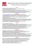 Suggested Chapter Activities and Reminders by Month 2016-2017 Without legislated regions, chapters should consider joint activities with nearby chapters. Adjust your local calendar accordingly if your chapter participates. August - Executive committee meets to update plan for the year. Review NBS calendar and deadlines in order to plan local, regional and national activities. Set goals and develop timetable for the coming year. Organize the first chapter meeting and promote it with posters, social media, class announcements, and word-of-mouth. Review a list of paid members and remind people with expired memberships to submit dues. Consider/promote purchasing “Chapter Block” memberships by November 1 (up to 20 memberships for $500). If you have questions, check out the NBS Website at www.nbs-aerho.org. Chapter webinars and conference calls will be scheduled to respond to demand. Additional questions can be referred to the National Office. - If your fall term is just beginning, complete the activities included in the August list of activities. Log on www.nbs-aerho.org check for updated information on competitions, national convention, and other activities. If not completed, your planning committee should layout a schedule of meetings for the academic year. Review a list of members. Identify potential members. Share your chapter plans and explain the benefits of organizational membership. A designated member should submit the summer report (online) to NBS Office by September 10. Continue recruiting activities to attract new members. Promote deadlines for national membership dues (November 1), National Undergraduate Student Electronic Media Competition submissions (Nov. 17/Dec. 2), Professional Competition (including grad students) (December 30), National Convention (September 30 $uper$aver registration & payment deadline), and AERho application (Nov. 10/Feb. 10) Plan and implement activities for fundraising and community service. Have at least one “fun” event so chapter members can bond and enjoy the social side of NBS. September - - October - Continue membership-recruiting activities. A designated member should submit the September monthly report (online) to NBS Office by Oct 10. Process dues for those whose memberships expire in the fall term. Submit dues by November 1 to the National Office. Remind members the National Undergraduate Student Electronic Media Competition deadlines are Nov. 17 & Dec. 2. Organize, remind and cajole those who need to renew student memberships that expire in the fall. Remind professionals that December 30 is the deadline submission of professional production entries, papers and panel proposals for the national convention. December 31 is the deadline for professional dues. - Remind members the National Convention Earlybird registration and payment deadline is November 30. - Have at least one “fun” event so chapter members can continue bonding. November - November 1 is the renewal deadline for student memberships that expire in the fall. A signed/dated, updated PDF copy of your local constitution should be e-mailed to the national office by Nov. 2. A designated member should submit the October monthly report (online) to NBS Office by Nov. 10. Remind chapter members the early AERho application deadline is Nov 10. Explore the national convention section of the NBS-AERho website. Begin planning travel and activity options. Remind members the Earlybird registration deadline is November 30 (online registration & payment). - Remind chapter members Nov. 17 & Dec. 2 are deadlines for the National Student Electronic Media Competitions. - When you are home for Thanksgiving break…drop a hint to the folks that attending the NBS National Convention would be an educational experience that would help launch your professional career and it would make a great holiday gift. - Remind professionals that Dec. 30 is deadline for competitions and Dec. 31 is the deadline for professional dues. December - By Dec. 1, submit a Graduation Report (online) to the national office for summer and December graduates. - Continue to formulate travel plans to attend the NBS National Convention in New York City, March 21-26, 2017. Remember, in previous years, airlines have had online sales for air travel during the first two weeks of January. - Dec. 2 is the final deadline for the National Undergraduate Student Electronic Media Competitions. - A designated member should submit the November monthly report (online) to NBS Office by December 10. - December 30 is the deadline for professional competitions and paper submissions. - December 31 is the deadline for professional membership dues. - Study hard for exams then have some fun and relax over your holiday break. January - If your chapter plans to fly to the convention, be prepared for early January airline flight sales. - A designated member should submit the December monthly report (online) to NBS Office by January 10. - Work on your chapter annual report, Model (or Motivated) Chapter Report, Community Service Report, and Society Award Nominations (various February deadlines) - Organize spring NBS student dues renewal (Feb. 1) and AERho late application deadline (Feb 10). - Prepare for national convention deadlines: Regular Rate Registration and Hotel Reservations (Feb. 14 and 28). February - - Feb. 1 is the renewal deadline for student NBS memberships that expire in the spring. Feb. 7 is the deadline to submit Society Award nominations. Feb. 10 is the late application deadline for AERho. By Feb 10, a designated member should submit the January monthly report (online) to NBS Office. Feb. 14 is the deadline for Earlybird Rate convention registration (online registration + payment). Feb. 16 in the deadline for chapter annual reports to be submitted electronically to the national office. Feb. 21 is the deadline for submission of Community Service and Model Chapter/Motivated Chapter reports. Feb. 28 is the deadline for convention Hotel Ro