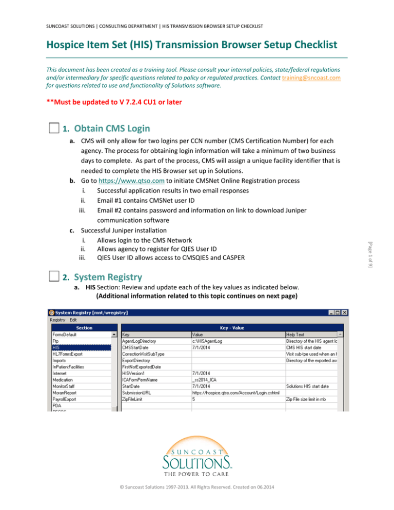 SUNCOAST SOLUTIONS | CONSULTING DEPARTMENT | HIS TRANSMISSION BROWSER SETUP CHECKLIST Hospice Item Set (HIS) Transmission Browser Setup Checklist This document has been created as a training tool. Please consult your internal policies, state/federal regulations and/or intermediary for specific questions related to policy or regulated practices. Contact training@sncoast.com for questions related to use and functionality of Solutions software. **Must be updated to V 7.2.4 CU1 or later 1. Obtain CMS Login [Page 1 of 9] a. CMS will only allow for two logins per CCN number (CMS Certification Number) for each agency. The process for obtaining login information will take a minimum of two business days to complete. As part of the process, CMS will assign a unique facility identifier that is needed to complete the HIS Browser set up in Solutions. b. Go to https://www.qtso.com to initiate CMSNet Online Registration process i. Successful application results in two email responses ii. Email #1 contains CMSNet user ID iii. Email #2 contains password and information on link to download Juniper communication software c. Successful Juniper installation i. Allows login to the CMS Network ii. Allows agency to register for QIES User ID iii. QIES User ID allows access to CMSQIES and CASPER 2. System Registry a. HIS Section: Review and update each of the key values as indicated below. (Additional information related to this topic continues on next page) © Suncoast Solutions 1997‐2013. All Rights Reserved. Created on 06.2014 SUNCOAST SOLUTIONS | CONSULTING DEPARTMENT | HIS TRANSMISSION BROWSER SETUP CHECKLIST Hospice Item Set (HIS) Transmission Browser Setup Checklist I. II. III. IV. V. VI. VII. IX. X. XI. Key Value Agent LogDirectory s:\HISAgentLog CMSStart Date 7/1/2014 CorrectionVisitSubType* enter the value for documentation addendum visit ExportDirectory* s:\HIS © Suncoast Solutions 1997‐2013. All Rights Reserved. Created on 06.2014 [Page 2 of 9] VIII. AgentLogDirectory: Suggested value is s:\HISAgent Log. Should be updated by the agency to reflect the exact place the data is being stored if different than this. Defines directory of the HIS agent log file. (if this path is changed then a hard refresh is required) CMSStartDate: Date should be 7/1/2014 or 07/01/2014. Either format should work, but the date is important. Do not change the date. CorrectionVisitSubType: This is the Time Sheet Client Contact subtype that you want to have associated with HIS completion. The agency does not need to create a new timesheet code. It is fine to use Documentation Addendum. Verify the subtype id by looking in Time Sheet Activity Types. That is the value that should be entered in this key. ExportDirectory: Agencies create their own Export Directory location. Suggested location is s:\HIS. Need to establish a “HIS” folder on this drive to display zip files created for transmission to CMS. FirstHistoryDate: Populated by the system. Defines date of oldest record exported. FirstNotExportedDate: Populated by the system. Will update as records are created and exported. Defines date of oldest active record that has not been exported. This will not show up until after the agencies first file is transmitted. HISVersion1: This date should be 07/01/2014. This key was added in anticipation of future changes that may be made by CMS. This is currently the only version. ICAFormPermName: Enter the perm name(s) for all admission assessments separated by a comma with no spaces that will be reviewed the questions related to the Date Initial Nursing Assessment A0245. E.g. an agency may have a pediatric and an adult admission assessment form. Enter both forms. StartDate: 07/01/2014. Defines date when agency began creating HIS records within Solutions. Agent uses this date to begin creating the HIS records for the HIS browser. SubmissionURL: https://hospice.qtso.com. Verify this is the correct URL. ZIPFileLimit: 5. Do Not exceed 5. 5 megabytes is the largest file size CMS accepts. SUNCOAST SOLUTIONS | CONSULTING DEPARTMENT | HIS TRANSMISSION BROWSER SETUP CHECKLIST Hospice Item Set (HIS) Transmission Browser Setup Checklist First HistoryDate 07/01/2014 FirstNot Exported Date 07/01/2014 HISVersion1 7/1/2014 ICAFormPermName* _ss2014_ICA StartDate 7/1/2014 SubmissionURL https://hospice.qtso.com/Account/Login.cshhtml ZipFileLimit 5 a. CCN I. Enter CCN (CMS Certification Number) ‐ six digit identification number that is assigned to a certified provider. This is the hospice’s Medicare provider number. II. Enter State code. Use standard 2 letter abbreviation. e.g. FL for Florida III. Enter Facility Id: (also known as Submission ID) – this is the CMS‐assigned unique facility identifier that must be entered into your software for HIS record submissions. This ID is used to identify submissions from each provider. The Hospice will receive this ID when they obtain the QIES user ID as described in 1a and 1b of this document. IV. The first CCN Number will display as “Active”. If the agency has multiple CCN numbers, verify and update to active as needed. V. Additional CCN codes may be entered if the agency has more than 6 CCN numbers. (Additional information related to this topic continues on next page) © Suncoast Solutions 1997‐2013. All Rights Reserved. Created on 06.2014 [Page 3 of 9] 3. Code Table Maintenance SUNCOAST SOLUTIONS | CONSULTING DEPARTMENT | HIS TRANSMISSION BROWSER SETUP CHECKLIST Hospice Item Set (HIS) Transmission Browser Setup Checklist © Suncoast Solutions 1997‐2013. All Rights Reserved. Created on 06.2014 [Page 4 of 9] b. DischargeReason I. Review all discharge reasons for Hospice Care (Care Program 9) Run the Code Table Report/ DischargeReason to view valid care program for each discharge reason. II. For each Hospice Discharge Reason there should be an entry with the appropriate HIS Code in the details section. III. Verify or enter the appropriate HIS Code in the details section for each Hospice discharge 