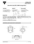 DG200A_MIL Vishay Siliconix Monolithic Dual SPST CMOS Analog Switch FEATURES BENEFITS APPLICATIONS D D D D D Wide Dynamic Range D Simple Interfacing D Reduced External Component Count D D D D "15 V Input Signal Range 44-V Maximum Supply Ranges On-Resistance: 45 W TTL and CMOS Compatibility Servo Control Switching Programmable Gain Amplifiers Audio Switching Programmable Filters DESCRIPTION The DG200A_MIL is a dual, single-pole, single-throw analog switch designed to provide general purpose switching of analog signals. This device is ideally suited for designs requiring a wide analog voltage range coupled with low on-resistance. Each switch conducts equally well in both directions when on, and blocks up to 30 V peak-to-peak when off. In the on condition, this bi-directional switch introduces no offset voltage of its own. The DG200A_MIL is designed on Vishay Siliconix’ improved PLUS-40 CMOS process. An epitaxial layer prevents latchup. FUNCTIONAL BLOCK DIAGRAM AND PIN CONFIGURATION Dual-In-Line Metal Can IN2 IN1 1 14 NC 2 13 NC V+ (Substrate and Case) IN1 GND 3 12 V+ Substrate NC 4 11 NC S2 5 10 S1 D2 6 9 D1 V– 8 7 1 IN2 GND S1 9 2 8 7 3 4 NC 10 S2 D1 NC 6 5 V– D2 Top View Top View TRUTH TABLE Logic Switch 0 ON 1 OFF Logic “0” v 0.8 V Logic “1” w 2.4 V Document Number: 70035 S-02314—Rev. E, 05-Oct-00 www.vishay.com 4-1 DG200A_MIL Vishay Siliconix ORDERING INFORMATION Temp Range Package Part Number DG200AAK 14-Pin CerDIP –55 to 125_C DG200AAK/883, JM38510/12301BCA, 5962-9562901QCA DG200AAA 10-Pin Metal Can 14-Pin Sidebraze DG200AAA/883, JM38510/12301BIC JM38510/12301BCC ABSOLUTE MAXIMUM RATINGS V+ to V– . . . . . . . . . . . . . . . . . . . . . . . . . . . . . . . . . . . . . . . . . . . . . . . . . . . . . . 44 V GND to V– . . . . . . . . . . . . . . . . . . . . . . . . . . . . . . . . . . . . . . . . . . . . . . . . . . . . 25 V Digital Inputsa, VS, VD . . . . . . . . . . . . . . . . . . . . . . . . (V–) –2 V to (V+) +2 V or 30 mA, whichever occurs first Current (Any Terminal) Continuous . . . . . . . . . . . . . . . . . . . . . . . . . . . . . 30 mA Current S or D (Pulsed at 1 ms, 10% Duty Cycle Max) . . . . . . . . . . . . . . . . . . . . . . . . . 100 mA Storage Temperature . . . . . . . . . . . . . . . . . . . . . . . . . . . . . . . . . . . –65 to 150_C Power Dissipation (Package)b 10-Pin Metal Canc . . . . . . . . . . . . . . . . . . . . . . . . . . . . . . . . . . . . . . . . . . 450 mW 14-Pin CerDIPd . . . . . . . . . . . . . . . . . . . . . . . . . . . . . . . . . . . . . . . . . . . . 825 mW Notes: a. Signals on SX, DX, or INX exceeding V+ or V– will be clamped by internal diodes. Limit forward diode current to maximum current ratings. b. All leads welded or soldered to PC Board. c. Derate 6 mW/_C above 75_C d. Derate 11 mW/_C above 75_C SCHEMATIC DIAGRAM (TYPICAL CHANNEL) V+ S V– – + V+ GND INX D V– FIGURE 1. www.vishay.com 4-2 Document Number: 70035 S-02314—Rev. E, 05-Oct-00 DG200A_MIL Vishay Siliconix SPECIFICATIONSa Limits Test Conditions Unless Otherwise Specified Parameter Symbol V+ = 15 V, V– = –15 V VIN = 2.4 V, 0.8 Vf –55 to 125_C Tempb Minc Full –15 Typd Maxc Unit 15 V 45 70 100 W Analog Switch Analog Signal Rangee Drain-Source On-Resistance VANALOG rDS(on) VD = "10 V, IS = –1 mA Room Full Source Off Leakage Current IS(off) VS = "14 V, VD = #14 V Room Full –2 –100 "0.01 2 100 Drain Off Leakage Current ID(off) VD = "14 V, VS = #14 V Room Full –2 –100 "0.01 2 100 Channel On Leakage Currentf ID(on) VS = VD = "14 V Room Full –2 –200 "0.1 2 200 VIN = 2.4 V Room Full –0.5 –1 0.0009 VIN = 15 V Room Full VIN = 0 V Room Full nA Digital Control Input Current with Input Voltage High IINH Input Current with Input Voltage Low IINL 0.005 –0.5 –1 0.5 1 mA –0.0015 Dynamic Characteristics Turn-On Time Turn-Off Time Charge Injection Source-Off Capacitance Drain-Off Capacitance Channel-On Capacitance Off Isolation Crosstalk (Channel-to-Channel) tON tOFF Q CS(off) CD(off) CD(on) + CS(On) Room 440 1000 Room 340 425 Room –10 VS = 0 V Room 9 VD = 0 V Room 9 Room 25 Room 75 Room 90 Room 0.8 See Switching Time Test Circuit CL = 1000 pF, Vg = 0 V Rg = 0 W f = 140 kHz VIN = 5 V VD = VS = 0 V, VIN = 0 V OIRR XTALK VIN = 5 V, RL = 75 W VS = 2 V, f = 1 MHz ns pC pF dB Power Supplies Positive Supply Current I+ Negative Supply Current I– Both Channels On or Off VIN = 0 V and 2.4 V 2 mA Room –1 –0.23 Notes: a. Refer to PROCESS OPTION FLOWCHART. b. Room = 25_C, Full = as determined by the operating temperature suffix. c. The algebraic convention whereby the most negative value is aminimum and the most positive a maximum, is used in this data sheet. d. Typical values are for DESIGN AID ONLY, not guaranteed nor subject to production testing. e. Guaranteed by design, not subject to production test. f. VIN = input voltage to perform proper function. Document Number: 70035 S-02314—Rev. E, 05-Oct-00 www.vishay.com 4-3 DG200A_MIL Vishay Siliconix TYPICAL CHARACTERISTICS (25_C UNLESS NOTED) rDS(on) vs. VD and Power Supply Voltage Leakage Currents vs. Analog Voltage +6 TA = 25_C ID(off) or IS(off) 0 A I S, I D (pA) 100 r DS(on) ( W ) "5 V "10 V "12 V "15 V "20 V A: B: C: D: E: 120 80 B 60 ID(on) –6 –12 C D 40 –18 E –24 20 –15 –12 –9 –6 –3 0 3 6 9 12 –15 –12 15 VD – Drain Voltage (V) V T (V) 1.5 1.0 0.5 0 0 "5 "10 "15 V+, V– Positive and Negative Supplies (V) www.vishay.com 4-4 –3 0 3 6 9 12 15 "20 Supply Currents vs. Toggle Frequency V+ = 15 V V– = –15 V Both logic inputs toggled simutaneously 6 5 I+, I– (mA) ÉÉÉÉÉÉÉÉÉ ÉÉÉÉÉÉÉÉÉ ÉÉÉÉÉÉÉÉÉ ÉÉÉÉÉÉÉÉÉ ÉÉÉÉÉÉÉÉÉ ÉÉÉÉÉÉÉÉÉ ÉÉÉÉÉÉÉÉÉ ÉÉÉÉÉÉÉÉÉ ÉÉÉÉÉÉÉÉÉ 2.0 –6 VANALOG – Analog Voltage (V) Input Switching Threshold vs. V+ and V– Supply Voltages 2.5 –9 4 3 2 I+ 1 I– 0 1k 10 k 100 k 1M Toggle Frequency (Hz) Document Number: 70035 S-02314—Rev. E, 05-Oct-00 DG200A_MIL 