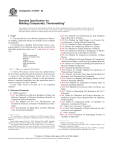 Designation: D 5948 – 05 Standard Specification for Molding Compounds, Thermosetting1 This standard is issued under the fixed designation D 5948; the number immediately following the designation indicates the year of original adoption or, in the case of revision, the year of last revision. A number in parentheses indicates the year of last reapproval. A superscript epsilon (e) indicates an editorial change since the last revision or reapproval. 1. Scope* 1.1 This specification covers the basic properties of thermoset molding compounds and the test methods used to establish the properties. 1.2 Classification—Molding thermosetting plastic compounds shall be of the following resins and are covered by the individual specification sheets (see 5.1 and Annex A1-Annex A8). D 256 Test Methods for Determining the Izod Pendulum Impact Resistance of Plastics D 495 Test Method for High-Voltage, Low-Current, Dry Arc Resistance of Solid Electrical Insulation D 570 Test Method for Water Absorption of Plastics D 618 Practice for Conditioning Plastics for Testing D 638 Test Method for Tensile Properties of Plastics D 648 Test Method for Deflection Temperature of Plastics Under Flexural Load in the Edgewise Position D 695 Test Method for Compressive Properties of Rigid Plastics D 790 Test Methods for Flexural Properties of Unreinforced and Reinforced Plastics and Electrical Insulating Materials D 796 Practice for Compression Molding Test Specimens of Phenolic Molding Compounds3 D 883 Terminology Relating to Plastics D 1896 Practice for Transfer Molding Test Specimens of Thermosetting Compounds D 3419 Practice for In-Line Screw-Injection Molding Test Specimens from Thermosetting Compounds D 3636 Practice for Sampling and Judging Quality of Solid Electrical Insulating Materials D 3638 Test Method for Comparative Tracking Index of Electrical Insulating Materials D 4350 Test Method for Corrosivity Index of Plastics and Fillers D 4697 Guide for Maintaining Test Methods in the User’s Laboratory E 994 Guide for Calibration and Testing Laboratory Accreditation Systems General Requirements for Operation and Recognition E 1224 Guide for Categorizing Fields of Capability for Laboratory Accreditation Purposes 2.2 Underwriters Laboratory Standard:4 UL 94 Tests for Flammability of Plastic Materials for Parts in Devices and Appliances 2.3 Other Standard: DDC AD 297457 Procedure for Determining Toxicity of Synthetic Compounds5 Resin Phenolic, cellulose filled Phenolic, mineral/glass filled Melamine Polyester Diallyl iso-phthalate Diallyl ortho-phthalate Silicone Epoxy NOTE 1—There is no equivalent ISO standard. 1.3 Order of Precedence—In the event of a conflict between the text of this specification and the references cited in Section 2 (except for related specification sheets), the text of this specification takes precedence. Nothing in this specification, however, supersedes applicable laws and regulations unless a specific exemption has been obtained. 1.4 The values stated in SI units are to be considered standard. 2. Referenced Documents 2.1 ASTM Standards: 2 D 149 Test Methods for Dielectric Breakdown Voltage and Dielectric Strength of Electrical Insulating Materials at Commercial Power Frequencies D 150 Test Methods for A-C Loss Characteristics and Permittivity (Dielectric Constant) of Solid Electrical Insulation D 229 Test Methods for Rigid Sheet and Plate Materials Used for Electrical Insulation 1 This specification is under the jurisdiction of ASTM Committee D20 on Plastics and is the direct responsibility of Subcommittee D20.16 on Thermosetting Materials. Current edition approved March 1, 2005. Published March 2005. Originally approved in 1996. Last previous edition approved in 2002 as D 5948 - 96(02)e1. 2 For referenced ASTM standards, visit the ASTM website, www.astm.org, or contact ASTM Customer Service at service@astm.org. For Annual Book of ASTM Standards volume information, refer to the standard’s Document Summary page on the ASTM website. 3 Withdrawn. Replaced by Practice D 5224. Available from Underwriters Laboratories (UL), Corporate Progress, 333 Pfingsten Rd., Northbrook, IL 60062. 5 Available from National Technical Information Service (NTIS), U.S. Department of Commerce, 5285 Port Royal Rd., Springfield, VA 22161. 4 *A Summary of Changes section appears at the end of this standard. Copyright © ASTM International, 100 Barr Harbor Drive, PO Box C700, West Conshohocken, PA 19428-2959, United States. 1 D 5948 – 05 and in the specified properties as determined by the batchacceptance inspection specified in 8.3. 5.5 Property Values—Standard specimens of the compounds shall conform to the property values shown in the individual specification sheets for qualification (see 8.2) and batch acceptance (see 8.3). 3. Terminology 3.1 For definitions of technical terms pertaining to plastics used in this specification, refer to Terminology D 883. 3.2 Definitions of Terms Specific to This Standard: 3.2.1 batch—a homogeneous unit of finished molding compound manufactured at one time. 3.2.2 heat resistance—the elevated temperature at which a particular material retains a minimum of 50 % of its original flexural strength measured at 23°C. 6. Conditioning 6.1 Standard test specimens shall be conditioned before testing, as specified in Tables 1-4. 6.1.1 Nomenclature—The following letters shall be used to indicate the respective general conditioning procedures: 6.1.1.1 Condition A—As received; no special conditioning. 6.1.1.2 Condition C—Humidity conditioning in accordance with Practice D 618. 6.1.1.3 Condition D—Immersion conditioning in distilled water in accordance with Practice D 618. 6.1.1.4 Condition E—Temperature conditioning in accordance with Practice D 618; Condition Desiccation–cooling over silica gel or calcium chloride in a desiccator at 23°C for 16 to 20 h after temperature conditioning in accordance with Practice D 618. 6.2 Designation—Conditioning procedures shall be de