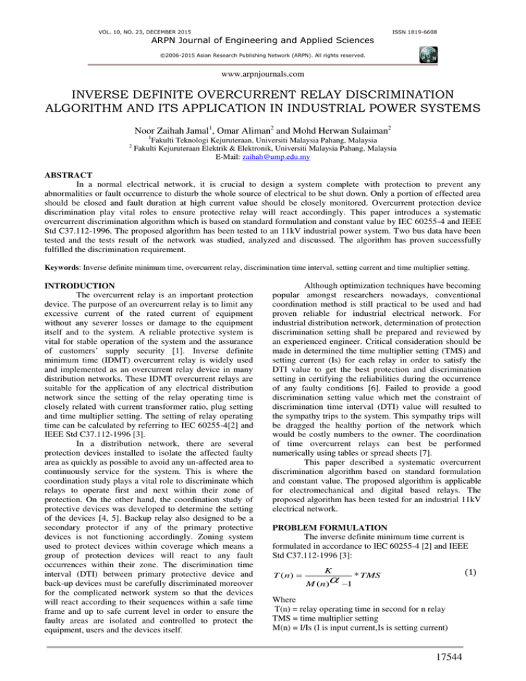 VOL. 10, NO. 23, DECEMBER 2015 ISSN 1819-6608 ARPN Journal of Engineering and Applied Sciences ©2006-2015 Asian Research Publishing Network (ARPN). All rights reserved. www.arpnjournals.com INVERSE DEFINITE OVERCURRENT RELAY DISCRIMINATION ALGORITHM AND ITS APPLICATION IN INDUSTRIAL POWER SYSTEMS Noor Zaihah Jamal1, Omar Aliman2 and Mohd Herwan Sulaiman2 2 1 Fakulti Teknologi Kejuruteraan, Universiti Malaysia Pahang, Malaysia Fakulti Kejuruteraan Elektrik & Elektronik, Universiti Malaysia Pahang, Malaysia E-Mail: zaihah@ump.edu.my ABSTRACT In a normal electrical network, it is crucial to design a system complete with protection to prevent any abnormalities or fault occurrence to disturb the whole source of electrical to be shut down. Only a portion of effected area should be closed and fault duration at high current value should be closely monitored. Overcurrent protection device discrimination play vital roles to ensure protective relay will react accordingly. This paper introduces a systematic overcurrent discrimination algorithm which is based on standard formulation and constant value by IEC 60255-4 and IEEE Std C37.112-1996. The proposed algorithm has been tested to an 11kV industrial power system. Two bus data have been tested and the tests result of the network was studied, analyzed and discussed. The algorithm has proven successfully fulfilled the discrimination requirement. Keywords: Inverse definite minimum time, overcurrent relay, discrimination time interval, setting current and time multiplier setting. INTRODUCTION The overcurrent relay is an important protection device. The purpose of an overcurrent relay is to limit any excessive current of the rated current of equipment without any severer losses or damage to the equipment itself and to the system. A reliable protective system is vital for stable operation of the system and the assurance of customers’ supply security [1]. Inverse definite minimum time (IDMT) overcurrent relay is widely used and implemented as an overcurrent relay device in many distribution networks. These IDMT overcurrent relays are suitable for the application of any electrical distribution network since the setting of the relay operating time is closely related with current transformer ratio, plug setting and time multiplier setting. The setting of relay operating time can be calculated by referring to IEC 60255-4[2] and IEEE Std C37.112-1996 [3]. In a distribution network, there are several protection devices installed to isolate the affected faulty area as quickly as possible to avoid any un-affected area to continuously service for the system. This is where the coordination study plays a vital role to discriminate which relays to operate first and next within their zone of protection. On the other hand, the coordination study of protective devices was developed to determine the setting of the devices [4, 5]. Backup relay also designed to be a secondary protector if any of the primary protective devices is not functioning accordingly. Zoning system used to protect devices within coverage which means a group of protection devices will react to any fault occurrences within their zone. The discrimination time interval (DTI) between primary protective device and back-up devices must be carefully discriminated moreover for the complicated network system so that the devices will react according to their sequences within a safe time frame and up to safe current level in order to ensure the faulty areas are isolated and controlled to protect the equipment, users and the devices itself. Although optimization techniques have becoming popular amongst researchers nowadays, conventional coordination method is still practical to be used and had proven reliable for industrial electrical network. For industrial distribution network, determination of protection discrimination setting shall be prepared and reviewed by an experienced engineer. Critical consideration should be made in determined the time multiplier setting (TMS) and setting current (Is) for each relay in order to satisfy the DTI value to get the best protection and discrimination setting in certifying the reliabilities during the occurrence of any faulty conditions [6]. Failed to provide a good discrimination setting value which met the constraint of discrimination time interval (DTI) value will resulted to the sympathy trips to the system. This sympathy trips will be dragged the healthy portion of the network which would be costly numbers to the owner. The coordination of time overcurrent relays can best be performed numerically using tables or spread sheets [7]. This paper described a systematic overcurrent discrimination algorithm based on standard formulation and constant value. The proposed algorithm is applicable for electromechanical and digital based relays. The proposed algorithm has been tested for an industrial 11kV electrical network. PROBLEM FORMULATION The inverse definite minimum time current is formulated in accordance to IEC 60255-4 [2] and IEEE Std C37.112-1996 [3]: T ( n) K (1) * TMS M (n) 1 Where T(n) = relay operating time in second for n relay TMS = time multiplier setting M(n) = I/Is (I is input current,Is is setting current) 17544 VOL. 10, NO. 23, DECEMBER 2015 ISSN 1819-6608 ARPN Journal of Engineering and Applied Sciences ©2006-2015 Asian Research Publishing Network (ARPN). All rights reserved. www.arpnjournals.com k and α = constant value for selected curved type Step 1: Determined maximum fault level STUDY CASE An 11kV electrical network has been used to test the proposed algorithm. The system is consisting of electromechanical relay and digital relay. The system was conducted with three-phase short circuit analysis to find out the near-end fault level at each busbar. Each level/ busbar fault value shall be determined by performing the short circuit study using per-unit system. Step 2: Determined the voltage level The voltage (132kV/33kV/11kV/0.415kV) used for each relay