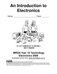 An Introduction to Electronics Name _____________________ Class _______ MRGS Year 10 Technology Electronics 2009 Available online from www.techideas.co.nz B. Collis Mt Roskill Grammar School 2002-2009 This work is licensed under the Creative Commons Attribution-Non-commercial-Share Alike 3.0 License. To view a copy of this license, visit http://creativecommons.org/licenses/by-nc-sa/3.0. The licensor permits others to copy, distribute and transmit the work. In return, licensees may not use the work for commercial purposes — unless they get the licensor's permission. The licensor permits others to distribute derivative works only under a license identical to the one that governs the licensor's work. Table of Contents Introduction to Year 10 Electronics..................................................................................... 3 Your learning this year ................................................................................................. 3 Your learning this year ................................................................................................. 4 Electronic Theory ............................................................................................................... 5 Darkness Detector ....................................................................................................... 6 Making Electricity ......................................................................................................... 7 ESD Electrostatic Discharge ........................................................................................ 9 Group Power Supply Assignment ............................................................................... 10 Circuit basics .............................................................................................................. 11 Conventional Current ................................................................................................. 11 Conductors................................................................................................................. 12 Insulators ................................................................................................................... 12 Making circuits on a Breadboard ................................................................................ 13 Semiconductors ......................................................................................................... 14 Wire Assignment ........................................................................................................ 14 Resistors .................................................................................................................... 15 Resistor Prefixes ........................................................................................................ 16 Resistor Values Exercises .......................................................................................... 17 Combining resistors in series ..................................................................................... 22 Combining resistors in parallel ................................................................................... 24 Ohms law ................................................................................................................... 26 Power Calculations .................................................................................................... 27 Resistor Combination Circuits .................................................................................... 28 Multimeters ................................................................................................................ 29 Multimeter controls ..................................................................................................... 30 Choosing correct meter settings ................................................................................. 31 Voltage & Current Measurements .............................................................................. 32 Measuring Resistance ................................................................................................ 33 Variable Resistors ...................................................................................................... 34 Capacitance ............................................................................................................... 35 Capacitor Codes and Values ...................................................................................... 36 Converting Capacitor Values uF, nF , pF.................................................................... 36 The Voltage Divider .................................................................................................... 37 Semiconductors ......................................................................................................... 38 Diodes ........................................................................................................................ 39 Diode Research Assignment ...................................................................................... 39 LED's ......................................................................................................................... 41 LED research assignment .......................................................................................... 42 Using LEDs in circuits ................................................................................................ 43 The LDR..................................................................................................................... 44 The Transistor ............................................................................................................ 45 Transistor Specifications ............................................................................................ 46 Transistor Case styles .................................................................................