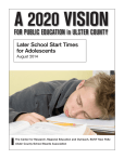 Later School Start Times for Adolescents August 2014 The Center for Research, Regional Education and Outreach, SUNY New Paltz Ulster County School Boards Association Later School Start Times for Adolescents The idea of later school start times for adolescents has become a front burner issue across the nation in recent months, in part as a result of the convergence of two streams of research (New York Times, 2014; Washington Post, 2014). First, biological scientists have shown that late-rising teenagers are not just lazy, as stereotypically assumed. Rather there is an emerging consensus among these researchers that sleep cycles change as children mature into adolescence, causing teenagers to fall asleep later in the evening and sleep later into the morning. Meanwhile a parallel body of research has identified multiple benefits of adequate sleep for adolescents. Recently, a study conducted by researchers at the Center for Applied Research and Educational Improvement at University of Minnesota, and funded by the Center for Disease Control (CDC) confirmed multiple academic, emotional, social, and health benefits that derive from additional sleep afforded by later school start times (Wahlstrom, 2014). Importantly, this study also shows that when school starts later—and is thus aligned with adolescent sleep cycles— adolescents actually get more sleep. It was in recognition of these findings that U.S. Secretary of Education Arnie Duncan endorsed the idea of starting high school later in the day (August, 2013). In the last 10 years, school districts in California, Oklahoma, Georgia, New York, Connecticut, North Carolina, Kentucky, and Minnesota have changed schedules to accommodate later start times for their adolescent students. Currently, countywide school districts in Virginia and Maryland are considering changing the times of their first school bell, as are urban districts in St. Paul, MS and Richmond, VA. In 2009, members of the U.S. House of Representatives introduced House 2 Concurrent Resolution 176 (also known as the Zzz’s to A’s Resolution) in support of later school start times, and in 2014, a landmark bill passed by the Maryland legislature requires state health officials to conduct a study on the sleep needs of students and the experiences of schools that have shifted to later start times. These actions have propelled what has been a local conversation to a national, and statewide, arena (Washington Post, 2014; Kelley & Lee, 2014). This policy brief summarizes the research on later school start times for adolescents and provides a framework for thinking about the implementation of this idea in Ulster County, New York. It is the work of the School and School District Structure study group, a subcommittee of A 2020 Vision for Public Education in Ulster County. A 2020 Vision for Public Education in Ulster County was a symposium convened in November, 2013 to begin the process of proactively shaping a vision for public education in the county’s communities. Stakeholders from eight Ulster County school districts gathered to use a regional lens to engage questions of teaching and learning, accountability, and school and school district structure. In doing so they self-consciously began the process of generating thoughts and ideas about ways to promote county-wide, regional thinking in the service of improving educational delivery. The School and School District Structure study group, with participation from numerous stakeholders with diverse perspectives, from multiple Ulster County school districts, continued this work through monthly meetings. Participants identified and researched issues for further consideration by the larger 2020 group. School start times for adolescents is one of these issues. A policy brief of the School and School District Structure Study Group by Tony Fletcher, President of the Board of Education in the Onteora Central School District, and Robin Jacobowitz, PhD, Education Projects Director at CRREO …there is an emerging consensus among these researchers that sleep cycles change as children mature into adolescence, causing teenagers to fall asleep later in the evening and sleep later into the morning. Sleep and adolescents Getting sufficient sleep is an important factor in the overall health for people of all ages, affecting memory and learning, attention capacity, and a range of emotional and physical health outcomes (Moller-Levet et al., 2013; Foster et al., 2013; Payne, 2011; Knutson, 2007). The amount of needed sleep, and the patterns and cycles of that sleep, differ for people of different ages. For youth, the circadian timing that drives sleep shifts as children develop into adolescence; wakefulnessinducing hormones (cortisol) persist longer throughout the day and sleep-inducing hormones (melatonin) are trigged later in the evening and last longer into the morning. This causes adolescents to fall asleep later at night and wake later in the morning than younger children or adults (Carskadon et al., 1997; Wolfson & Carskadon, 1998; Crowley et al., 2007). The presence in adolescents of sleep-inducing hormones (melatonin) further into the morning makes early morning functioning even more difficult for these youth (Carkasdon et al., 1998). The difference between adolescent circadian rhythms and those of younger children and adults is as wide as three hours. (Kelley & Lee, 2014). This does not mean that teenagers need less sleep. Researchers find that adolescents still require at least 9 hours of sleep each night (Hansen et al., 2005; National Sleep Foundation, 2000; Carskadon et al., 1998). It is physiologically natural for adolescents to fall asleep late at night and then sleep later into the following morning. Notwithstanding this reality, the school day for adolescents usually begins between 7:00—7:45am. Moreover, students are required to rise early enough to board the bus or pull out of their driveways up to an hour in advance of these start time