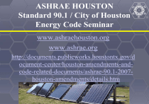 ASHRAE HOUSTON Standard 90.1 / City of Houston Energy Code Seminar www.ashraehouston.org www.ashrae.org http://documents.publicworks.houstontx.gov/d ocument-center/houston-amendments-andcode-related-documents/ashrae-90.1-2007houston-amendments/details.htm ASHRAE HOUSTON Standard 90.1 / City of Houston Energy Code Seminar 9:00 9:15 10:30 10:45 11:15 12:30 Introduction Keith Reihl 90.1 MEP Keith Reihl Break Appendix G David McClain Lunch City of Houston Forms and Implementation Lisa Brown ASHRAE HOUSTON Standard 90.1 / City of Houston Energy Code Seminar 1:00 2:30 3:00 90.1 Building Envelope Lisa Rosenow 90.1 2007 vs 90.1 2010 Keith Reihl Closing and questions SURVEY LINK http://67.225.150.43/survey.php ASHRAE HOUSTON Standard 90.1 / City of Houston Energy Code Seminar The Energy code allows you to follow: ASHRAE 90.1 2007 - Or IECC 2009 Since IECC 2009 is based upon ASHRAE 90.1 2007 we are only presenting 90.1 today. 90.1 Historical Timeline 90.1-1999 major rewrite 90.1-2001 minor revisions 90.1-1980 updated 1970 1980 1990 2000 2010 90.1-1989 updated 90.1-1975 first issued 90.1-2004 updates, reorganization 90.1-2007 updates ASHRAE Standard 90.1 Purpose “… Provide minimum requirements for the energy-efficient design of buildings except low-rise residential buildings” ASHRAE Standard 90.1 and Model Codes ASHRAE Standard 90.1 is adopted by: – National Fire Protection Association – International Code Council (International Energy Conservation Code) • IECC–Chapter 8 adopts 90.1-2007 by reference • IECC–Chapter 7 describes an alternate path for compliance ASHRAE Standard 90.1 and LEED®-NC Version 2.2 • EAp2: Minimum energy performance • Mandatory provisions of 90.1-2004 and • Prescriptive requirements of 90.1-2004 or Energy Cost Budget method of 90.1-2004 • EAc1: Optimize energy performance • Awards points for improving performance rating of the design building vs. baseline building per 90.12004 • Minimum 14% improvement (2 credit points) is required ASHRAE Standard 90.1 and LEED®-2009 • EAp2: Minimum energy performance • Mandatory provisions of 90.1-2007 and • Prescriptive requirements of 90.1-2007 or Energy Cost Budget method of 90.1-2007 and • 10% improvement over 90.1-2007 • EAc1: Optimize energy performance • 1 point for 12% savings • 3 points for 16% savings… • Up to 19 points (out of 100) ASHRAE Standard 90.1 Scope • New buildings and their systems • New portions of buildings and their systems • New systems and equipment in existing buildings ASHRAE Standard 90.1 Exclusions • Low-rise residential buildings – ASHRAE Standard 90.2 covers low-rise (3 stories or less) • Buildings that do not use either electricity or fossil fuel • Equipment and portions of building systems that use energy to primarily to provide for industrial, manufacturing, or commercial processes Standard 90.1 • Under continuous maintenance • Latest Published 90.1 2010 • 90.1-2007 plus addenda – Will highlight a few of the significant addenda 90.1 2010 is 30% stricter than 2004 Standard 90.1 Section 6 HVAC • Equipment - New equipment shall meet the minimum efficiency requirements • Cooling systems – New cooling systems installed to serve previously uncooled spaces shall comply with this section – Alterations to existing cooling systems shall not decrease economizer capacity (unless economizer tradeoff is used) • Ductwork - New and replacement ductwork shall comply with applicable requirements • Piping - New and replacement piping shall comply with applicable requirements Standard 90.1 Section 6 HVAC • Alterations to the building HVAC system shall comply with the requirements of Section 6 – Exceptions that are allowed: • Equipment being modified or repaired (not replaced) – provided such modifications will not result in an increase in the annual energy consumption • Equipment being replaced or altered which requires extensive revisions to other systems and such replaced or altered equipment is a like-for-like replacement • Refrigerant change of existing equipment • Relocation of existing equipment • Ducts and pipes where there is insufficient space or access to meet these requirements Standard 90.1 Section 6 HVAC • Section 6.2 • You have to follow Sections – 6.1 General, – 6.7 Submittals, and – 6.8 Minimum Equipment Efficiency, • And then you can follow either – Section 6.3 Simplified Approach OR – Sections 6.4 Mandatory Provisions and 6.5 Prescriptive Path Alternatively, you can follow Section 11 (ECB), in which case Section 6.4 is mandatory Standard 90.1 Section 6 HVAC • Simplified Approach is limited to… – – – – Buildings with 1 or 2 stories Buildings < 25,000 ft2 Single-zone systems (unitary or split) Air-cooled or evaporatively cooled Simplified Approach Option (cont’d) • For 2010 (not right now for climate zone 2a) The system shall have an economizer, unless the economizer Trade-off Option is used – Limited to unitary systems – Requires higher minimum cooling efficiency (EER) – Trade-off EER by • System size • Climate zone Table 6.3.2 Simplified Approach Option (cont’d) • Manual changeover or dual set-point thermostat • Heat pump supplementary control • No reheat or simultaneous heating and cooling for humidity control (RESERVED IN COH) • Time clocks (except hotel/motel guest rooms and systems requiring continuous operation) • Piping and ductwork insulated per Mech Code Simplified Approach Option (cont’d) • Balancing of ducted systems by NEBB, AABC or ASHRAE 111 • Interlocked t-stats for separate heating & cooling • Exhaust : gravity or motorized dampers unless operated continuously • System > 10,000 cfm: optimum start controls • Outside air intakes shall have motorized dampers with leakage rate not to exceed 4 cfm at 1.0 in. w.g. cfm per ft2 of damper area. Outside air dampers and exhaust fans shall be interlocked to close the damper and turn off the fa