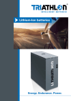 Lithium-Ion batteries Energy. Endurance. Power. – The Company As an assembly manufacturer and developer of Lead-Acid batteries and ­Lithium-Ion battery systems, TRIATHLON® produces batteries for a wide range of industrial motive power applications including ­electric forklifts and pallet trucks, mobile lifting platforms and cleaning ­machines. Decades of experience and technical ­expertise, combined with state-of-the-art production facilities ensure the highest quality of motive power batteries available. Our production facilities are ISO 9001 and 14001 certified. A solid network of sales and service partners in Germany, Europe and the United States provide competent solution based advice and both flexible and reliable ­onsite service. Reliable Flexible Powerful Competent The advantages 2 Lithium-Ion batteries Multi-shift operations, more hours of ­actual lift truck usage, and a never ending drive to increase productivity in all sectors of manufacturing and logistics requires full-time availability of electric lift trucks. TRIATHLON® Lithium-Ion battery systems can be opportunity and fast charged thus enabling multi-shift use without spare batteries and non-productive battery ­ change-outs. The market driven push to respond to greater availability of lift trucks has led to opportunity and fast charging of L ­ ead-Acid batteries. Lead-Acid battery technology simply cannot achieve some of today’s material handling demands without spare batteries and battery change-outs, especially in multi-shift 24/7 operations. The systems are exclusively designed with high performance Lithium-Ion cells which fulfill all requirements for heavy duty industrial motive power use. Find out more about the advantages of TRIATHLON® Lithium-Ion technology on the following pages. Due to years of research and development we can now offer new and innovative cost effective solutions for heavy-duty electric motive power operations. tell the story! Lithium-Ion batteries 3 Lithium-Ion battery systems a new way forward. A New Way Forward with TRIATHLON® Lithium-Ion Batteries! Compared to conventional Lead-Acid batteries, Lithium-Ion technology has significant advantages. Now you can fully charge a completely discharged industrial battery within 1 - 2 hours. Opportunity charging is not only allowed but encouraged at any time and will not harm the battery. Time consuming, unsafe and non-productive battery change-outs are no longer necessary. Lab results and real life field-testing of Lithium-Ion technology has found that ­ these batteries deliver a significantly longer life than that of Lead-Acid b ­ atteries. 4 Lithium-Ion batteries TRIATHLON® Lithium-Ion batteries are made up of Lithium-Ion cells that are assembled into modules which provide the required voltages and Ah capacities. We offer complete battery systems in all standard battery voltages. All cells are UN 38.3 tested. Each battery system has an integrated monitoring system with a display unit and an opportunity charger. TRIATHLON® Lithium-Ion battery systems are significantly more energy efficient than Lead-Acid batteries. The total efficiency of the system is up to 40 % greater than that of Lead-Acid batteries. It pays to consider “a new way forward.” We welcome the opportunity to consult with you in greater detail. Charge/discharge connectors LithiumIon battery The “Made in Germany” TRIATHLON® Lithium-Ion battery system consists of Lithium-Ion battery cells and modules, intelligent monitoring and control systems, extensive safety componentry, and a high-frequency opportunity/fast charger that communicates with the battery via CAN bus protocol. If battery discharge communication with the lift truck is not available based on the lift truck’s capabilities, an optional hardwired external multi-functional display called the ion Battery Guard is ­provided. The ion Battery Guard is attached ­directly in the lift truck dash board so that the battery’s state of charge can be d ­ isplayed and monitored by the operator. Fast/ Opportunity charger The battery system has active protection componentry which monitors the entire system and virtually eliminates any misuse. Optional: External multi-functional display Lithium-Ion batteries 5 Longer Operating Times TRIATHLON® LITHIUM-ION BATTERY TRIATHLON® LEAD-ACID BATTERY O perating time approx. 21 - 22 h. O perating time approx. 8 h. F ast/Opportunity charging times approx. 2 - 3 h. C harging time/rest periods approx. 16 h. The operating time of the lift truck increases due to flexible fast/opportunity charging of the battery system. Your lift truck can be used virtually “AROUND THE CLOCK” without a battery change. Endurance, Productivity and maximum performance 6 Lithium-Ion batteries SYSTEM FEATURES Flexible – the TRIATHLON® battery system can be used and charged anywhere and at any time. Example: Charging pillar ast Charge – full charging is possible F within one hour. pportunity Charge – opportunity O charging is possible and encouraged at any state of charge and will not reduce battery life. Zero Emissions – no gassing. fficiency – a high tech battery system E combined with an extremely efficient high-frequency charger with easy to read display. apacity – the available energy is much C greater than that of Lead-Acid batteries in the same box size. In most cases multishift use is possible without battery change-outs. erformance – the higher sustained P voltage properties of the TRIATHLON® Lithium-Ion battery result in faster more consistent lifting and driving performance, especially noticeable toward the end of the shift. Example: Swiveling jib nergy Recuperation – the TRIATHLON® E Lithium-Ion battery readily accepts any current fed back from the lift truck and uses it to increase run-time without any damage to the battery. afe – the TRIATHLON® battery system S is equipped with deep discharge and overcharge protection, individual cell temperature and voltage 
