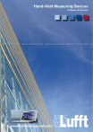 Hand-Held Measuring Devices A Passion for Precision a passion for precision · passion pour la précision · pasión por la precisión · passione per la precisione · a pa www.handmessgeraete.info Robust technology with a sophisticated design. Precision and reliabil­ ity all in one – engin­ eered by professionals for professionals. Move Measuring on the The highly demanding and complex measuring tasks of today can only be mastered with high-precision devices. The special requirements placed on hand-held measuring devices are the result of the spectrum of physical measurements that are to be measured, as well as the decisions that are based on this measured data. Architects, specialists and surveyors, engineers, climate experts and many other professionals bear the responsibility for people, technology, goods and processes. Whether investigating the temperature of a surface without contact, the dew point temperature of air or on walls, the moisture content of oil, air pressure or air flow, Lufft hand-held devices are easy to operate and – above all – precise! The compact E(conomy)-Series offers the most simple, intuitive handling and reliable measurement technology for small budgets. The thermo-hygrometer with its display and storage of threshold values, in addition to average values, operates with precision and is ideal for climate testing, as well as calculating absolute humi­dity and dew point. Optional accessories include filters for areas with high dirt levels – a metal grid filter for medium dirt protection or a stainless steel sinter filter for high dirt protection. The E200 IR can also be used as E-Series a laser pyrometer for contact-free measurement of surface tem­p­ eratures, including ­measurement position marking. It is ideally suit­able for detecting thermal bridges. The C(omfort)-Series with C-Series its large, illuminated display is the ideal hand-held measuring device for industry and air conditioning. Its robust housing and sensor technology stand for professional everyday use. The C-Series – with a total of 10 versions for varying measurement tasks – are regarded as, and rightly so, specialist devices for today’s specialists. The C-Series includes the digital thermom­ eter (C1XX), combined thermo-hygrometer (C2XX), precision air-/ differential pressure measuring device (C3XX), digital anemometer (C400) or the digital display device (C900) for analogue input signals. Unique in its class is the reference thermometer C101 with an accuracy of 0.02°C in the range -40°C…200°C! The A(dvanced)-Series is the multi-talent in the measuring technology sector and therefore the ideal allrounder. Hardly any other professional device on the market guarantees a flexibility comparable to that of the A1SDI. This is due to its digital interface and the fact that the PT100 input for high-precision sensors allows the user to apply a variety of sensors. Instead of needing a multitude of measuring devices the professional only needs one. The A1-SDI sensor library already offers a wide variety of sensors for temperature, hu­midity and air flow, and this library is conA-Series tinually being expanded. The new A-Series generation is also avail­ able with Bluetooth Techno­logy ­making the wireless transfer of measured data to a laptop child’s play. Software SmartGraph2-Software Package is, in conjunction The with the A-Series, a data record­ ing system for the professional. SmartGraph runs on Windows and enables you to flexibly man­ age several measuring devices, whereupon the measured data is automatically saved and filed into its respective calendar week. The user interface is clear and concise and offers a comprehensive monitoring of all acquired measured values – whether in a table format or graph. Zoom and print functions are obligatory and the software even documents in detail all violations of predefined threshold values. And best of all: the standard version of SmartGraph 2 is free of charge and can be downloaded from www.lufft.de. Z E R T I FI Z I E R T DIN EN ISO 9001 NR 70100F222 DKD-K-26701 C E R T I F I E 3 As tasks increase so do requirements. Lufft’s sophisticated measuring technology is more than a match for today’s high demands. Palm of your Hand Precision in the Lufft’s hand-held measuring device product range is comprehensive and can be imple­mented in a full spectrum of various application areas. By using the table below you will be able to get an overview of the most important device features. This will enable you to find the right device from the various series that best meets your needs. Take your time and compare the range of functions offered with those of competitors’ products and you will discover that Lufft is in a class of its own. Decisive for the various applications are first and foremost the physical measurements that need to be measured. For this purpose we have compiled a concise table to be used as a general overview. More detailed information regarding our measuring devices and connectable sensors can be found in the technical descriptions on the following pages. Functions Leistungenofvon Functions Lufft Lufft Measuring Messgeräten Devices Functions Daumenrad Thumb-wheel E200 x E200 IR x Beleuchtetes Illuminated display Display A1SDI x C1XX C2XX C3XX C400 x x x x x x x x x x x x x x x x x x x x x x x x Universelleanalogue Universal analoge inputs Eingänge 1-Punkt-Kalibrierung 1 point calibration x x x x x 1-and 1 und22-Punkt-Kalibrierung point calibration ° C / ° F-Umschaltung ° C / ° F switchable Akustische Acoustic alarms Alarmierung x Datum/Uhrzeit Date/time MIN/MAX/HOLD/Messwert MIN/MAX/HOLD/Measurement value C900 x x Bluetooth Datenübertragung data transfer x x x x x x x x x x x x C3XX C4XX C9XX x Messgrößen Physical Measurements Was Sie What youmit can Lufft measure Messgeräten with Lufft messen measuring können devices – heute – now und and in Zukunft in the future. E200 E200R A1 SDI C1XX C2XX
