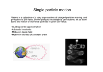 Single particle motion Plasma is a collection of a very large number of charged particles moving and giving rise to EM fields. Before going to the statistical descriptions, let us learn about the motion of individual particles in given EM-fields: • Guiding centre approximation • Adiabatic invariants • Motion in dipole field • Motion in the field of a current sheet Guiding centre approximation The motion in a magnetic field of a charged particle can be treated as the superposition of a relatively fast circular motion around a point called the guiding center and a relatively slow drift of this point. The task is to solve the equation of motion of a charged particle: Lorentz Force (assume, for the time being, nonrelativistic motion; = 1 and p = mv) macroscopic field: sum of the externally applied field and the fields generated by the plasma particles collectively Fnon-EM contains all non-electromagnetic forces acting on the particle. In practise, this usually means gravitation: F n o n -E M mg Plasma is a collection of charged particles Why to study single particle motion? • A large part of phenomena we shall meet later can be understood (even quantitatively) by the single particle motion • Single particle description valid under some conditions: - e.g. high energy particles in low density plasma where collisions are infrequent - also it is required that fields induced by motion of particles are neglible compared with the applied fields. It is impossible to solve the Eq. of motion analytically in a general case, where the fields depend on time and spatial coordinates For slow temporal changes and smooth spatial dependencies of the fields we can use perturbation theory, i.e. calculate the motion of particles starting from the solution with constant fields B, E and g This way the particle trajectory, as averaged over many gyro-periods, is obtained The case of E = const and B = 0 (neglect the non-EM forces) is trivial: Eq. of motion , i.e., linear acceleration in the direction of E Motion in a homogenous and static magnetic field Consider next the case E = 0 and B = const The equation of motion is now (static uniform magnetic field) (*) Since we chose electric field to be zero, Lorentz force is perpendicular to the velocity the particle. Consequently, it can change only direction of the velocity , but the kinetic energy and the speed remain constant. (*) The orbit can be found in several ways, let’s do it very simply starting from the components of the equation of motion (let B be in the z-direction) (*) Since v and vz are constants Write: vx v cos and v y v sin v v 2 vz2 vx2 v y2 is constant And calculate time derivative of vx: vx And inserting these to (*) gives: mv sin qv sin B qB m 0 cyclotron frequency gyro frequency Larmor frequency c c t The motion of the particle is gyromotion in the xy-plane! v sin The solution describes helical motion. In a homogeneous magnetic field the particle motion can, thus be divided in two components: - linear motion along the field lines at constant speed (v|| = vz = constant) - circular motion in the plane (xy plane) perpendicular to B The radius of the circle is (Larmor radius) rL B 1 ; The higher B, the smaller rL (i.e. particles bound more tightly to the magnetic field when B has large values) rL m rLe rLi For a given value of the magnetic field electrons are bound more tightly to B than ions The gyro period (cyclotron period, Larmor time) is: The centre of the gyro motion is called guiding centre (GS) The pitch angle ( ) of the helical path is defined as the angle between the velocity vector of the particle and the magnetic field B v 90 0 v v v v In a non-uniform magnetic field: - changes as the ratio between v and v|| changes - pitch angle is a frequently used concept when studying the magnetosphere e.g in determining whether a charged particle will be lost to the Earth's atmosphere or not. The frame of reference where v|| = 0 : Guiding centre system (GCS) Division of the motion of the guiding centre and to the gyro motion is called the guiding centre approximation • In the GCS we can formally address a microscopic current with the Larmour motion of a charged particle: I = q / L. • The magnetic field arising from this microcurrent is always opposite to the applied magnetic field (rL depends on the sign of q) and thus plasma can be considered a diamagnetic medium • Placing a large number of charged particles to external magnetic field reduces the field. The magnetic moment associated to the circular loop is rL Note: in vector form W average • For n particles per unit volume the magnetization M and the magnetization current JM Relation of applied and induced fields: (remember: we required that Bind << B) M 1 0 Bind B n Bind 0 n W B2 induced field E x B drift Let’s move on by introducing a constant, uniform electric field: E = const Eq. of motion is now: dp dt q (E v B) The electric field can be resolved into components: - in the direction of B: EII - perpendicular to B: E 1. Components parallel to B Only E can exert force along B. This force causes a constant acceleration of ions in the direction parallel to B and moves electrons in the opposite direction charge separation field that rapidly cancels out large-scale E|| in plasma! Eq. of motion along B becomes: m dv dt qE 0 2. Components perpendicular to B Let’s assume again that B || eˆ z and that B E || eˆ x This yields Solution same as for E=0, but modified by the term Ex/B Substitution leads again to gyro motion but now the GC drifts in the y-direction ( both to B and E) with speed Ex /B In vector form: The drift speed is consistent with the Lorentz transformation of the E to GCS: E ' E v E B by demanding E’=0, we can solve for vE +q accelerates when moving with E (rL increases) +q slows when moving opposite to E ( rL deccreases) vE independent of both m and q, W + ion electron - same for all particles - drift to the same direction ( E and B) no electric current! negative