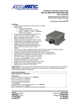 TECHNICAL DATASHEET #TDAX100100 25A DC MOTOR CONTROLLER P/N: AX100100 Variable Speed Control, Onboard I/O CAN SAE J1939, Rugged Packaging with Electronic Assistant® Features: Unidirectional or bi-directional DC motor control (up to 25A) Flexible control open loop speed control; closed loop speed control (on request); external feedback control (applicationspecific and on request). 2 inputs are user configurable from the following: 05V; 0-10V; 0-20 mA; 4-20 mA; or digital. Map the control input to either of the 2 command inputs or messages from a CAN bus. Enable function can be mapped to 2 inputs or CAN 4 configurable and independent ramps smooth motor rotation, protecting the controller and the system Additional 2 current outputs (2A proportional or hotshot digital) drive accessories such as hydraulic valves or relays for machine control or safety interlock. 1 0-5V output provides a configurable multi-functional feedback signal for monitoring purposes Outputs can be coded as feedback messages sent to the CAN bus A reference voltage is provided to power an external sensor or potentiometer. Highly efficient and robust design with isolation for drive and processing circuits Operational from 9 to 36VDC (12 or 24VDC nominal) CAN (SAE J1939) is provided (CANopen on request) for setpoint configuration Electronic Assistant® Compact size for easy mounting on a vehicle Suitable for moist, high shock and vibration environments Rugged IP67 corrosion resistant aluminum housing Operational from -40 to 85C (-40 to 185F) Applications: Motor variable speed, position and/or flow control in Lift Equipment, Electric Vehicles for Material Handling, Cranes and Hoists, Hydraulic Tail Lifts and Winches, Golf Carts, Military Equipment, Mobile Pumps and Hydraulic Powerpacks Ordering Part Numbers: Motor Controller P/N: AX100100 Accessories: Electronic Assistant® Configuration KIT: AX070502 Wire Harness KIT P/N: AX070100 Or you can order them individually. CAN and I/O wire harness assembly, 2m - P/N: AX070102 Power and Motor Control wire harness assembly, 2m - P/N: AX070103 RS-232 wire harness – P/N: AX070101 (Note: The AX070101 is not required if the EA is used for configuration.) Technical Specifications: Figure 1 - Block Diagram Input Specifications Power Supply Input - Nominal Surge Protection Under-voltage Protection Isolation Command Inputs Analog Ground 12 or 24VDC nominal; 9…36 VDC Provided Built-in All inputs are isolated from the power supply driving the motor and current outputs. 2 signal inputs (0-5V, 0-10V, 0-20 mA, 4-20 mA or digital) Input properties are user configurable. Refer to the block diagram and Table 1.0. Any input on the controller can be coded into a Proprietary B message that can be sent to the CAN network. 2 Provided NB. Do not connect Analog GND to BATTERY GND. Table 1.0 Inputs to AX100100 (Up to 2 user selectable inputs) Input Type Description Universal Analog Inputs Up to 2 analog inputs are available. 0…5VDC or 0…10VDC The offset is in millivolts and the resolution is mV/bit, when sending a CAN message. Input measurement setpoints are interpreted in volts. 4…20mA or 0…20mA The offset is in microamps and the resolution is μA/bit, when sending a CAN message. Input measurement setpoints are interpreted in milliamps. Digital Inputs Up to 2 digital inputs are available. These inputs can be used as an enable or direction command for the controller. The input accepted is active high (switch is connected to a +V signal when ON). TDAX100100 2 Output Specifications H-bridge 50A @ 24VDC nominal for 2 minutes at room temperature 37.5 @ 24VDC nominal for 30 minutes at room temperature 25A @ 24VDC nominal for 1 hour minimum Output to Motor Overcurrent protection is provided. Short circuit protection is provided. The maximum rated speed and motor rated current are configurable to suit individual motor specifications. Shut off with or without ramping Motor direction command can be mapped to any input or come from the CAN bus. Flexible control is provided by user configurable parameters for open loop speed control; closed loop speed control (on request); or external feedback control (on request). The control input to drive the motor can be mapped to either of the 2 universal inputs or the controller can respond to messages from a CAN bus. Thermal protection is built-in and configurable. 2 proportional (0…2A) or hotshot digital (2A) Ramp and dither setpoints are configurable. Hot Shot Coil Saver Outputs (Refer to Figure 2.): The outputs are on/off with a hotshot current which keeps the load ON with a holding current. This is used as an energy saving method of load control. Motor Stop Motor Direction Motor Control Mode Thermal Protection Current Outputs Each output is configurable to send a feedback message to the CAN bus. The feedback is always sent as a word with a resolution of 1 mA/bit, and 0 mA offset. 1 0-5V signal provides feedback of the duty cycle being applied to the motor or of another selected variable. The analog output is isolated from the power supply section of the circuit. This voltage output is configurable whether to send a feedback message to the CAN bus. The feedback is always sent as a word with a resolution of 1 mV/bit, and 0 mV offset. +5V, 10 mA is available to power a sensor or potentiometer. Signal Output Reference Voltage HOTSHOT DIGITAL ON INPUT OFF Hotshot Current [mA] OUTPUT Hold Current [mA] 0 [mA] Hotshot Time [ms] TIME Figure 2 – Proportional Output Hotshot Digital Profile TDAX100100 3 General Specifications Microprocessor DSP56F8346 Standard embedded software is provided. The following parameters are user configurable. Motor Direction: Unidirectional or bi-directional control from an input or the CAN bus. The direction is also configurable. Enable: A universal input can be configured to enable the motor when on. A CAN message can also be used as an enable input. Control Mode: Open loop speed or closed loop speed control (on request) or external feed