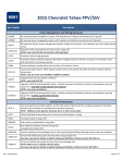 2015 Chevrolet Tahoe PPV/SSV Kerr Option Description Power Management and Wiring Harnesses KCP80F 80 amp front power management system, with 5 ignition and 6 battery connections and 12 ground KCP80R 80 amp rear power management system, with 5 ignition and 6 battery connections and 12 ground KPDIST 80 amp front and rear power management systems, includes 2 fuse panels, circuit breakers and color coded, labeled wiring KWIRE-EXT Extension of 6J7, 6J3 and 6J4 to the rear trunk or cargo area NOTE: must order SEO 6J7, 6J3 and 6J4 or SEO equivalent K72IP Dash panel pass through grommet KBATP Automatic battery protection detects when battery voltage is below 11.9V and cuts power to the vehicle, comes with reset button and manual override KZBM Equipment/battery minder allows time out from 15 minutes to 4 hours KLPD-12 Lap top shut down system. When laptop is wired to this circuit system will safely shut down computer without loosing data. NOTE: must also order one of KCP80-F, KCP80-R or KPDIST K6J7RF Separate front from rear flasher on SEO 6J7 NOTE: must order SEO 6J7 KT6BIS2 Upgrade to GM OE dual battery/6J1 system. Includes rewiring of aux battery to power only emergency warning equipment. Does NOT include upgrade of OE solenoid NOTE: must order dual battery KT6BIS2S Upgrade to GM OE dual battery/6J1 system. Includes rewiring of aux battery to power only emergency warning equipment. Includes upgrade of OE solenoid. NOTE: must order dual battery Vehicle Enhancements KPTT-P Two steering wheel mounted switches, one for radio push-to-talk and one for emergency equipment activation. Include noise cancelling mic and Motorola accessories connector NOTE: Additional costs apply for Kenwood, Harris or other brand radios KATS Vehicle anti-theft system allows you to remove key while engine is running KBAG Passenger disable air bag switch KBAGSID Side curtain air bag disable air bag switch KLOCK Rear hatch lock keyed to vehicles existing keys Available late October 2014 KEMGLOC Permits unlocking of rear passenger doors in the event of electrical failure allowing access to the rear occupants KTBDP-3A* NIJ Level 3A ballistic door panels for front driver and passenger only See www.ncjrs.gov for details on ballistic testing and definition of threat level for NIJ LEVEL 3A KTBDP-3* NIJ Level 3 ballistic door panels for front driver and passenger only NOTE: KHDG must be ordered with this option See www.ncjrs.gov for details on ballistic testing and definition of threat level for NIJ LEVEL 3 Rev. 16-Sept-2014 Page 1 of 5 2015 Chevrolet Tahoe PPV/SSV Kerr Option KHDG Description Heavy duty limiting strap option for NIJ Level 3 and 4 ballistic panels NOTE: required with KTBDP-3 option Console and Equipment Mounting KON18 Center console (includes floor plate & leg kit and equipment faceplates to match equipment) NOTE: recommend SEO 9U3 be ordered KON-AC2 Arm rest and cup holder (single option) NOTE: KON18 must be ordered with this option KON-CA Wire chase for console NOTE: KON18 must be ordered with this option KON-PWR 3-outlet power plug (12 volt) mounted in console NOTE: KON18 must be ordered with this option KUG13 OE USB/SDM socket for installation in console NOTE: KON18 must be ordered with this option K12VA 3-outlet power plug (12 volt) mounted outside the console KTIC Document holder for console NOTE: KON18 must be ordered with this option KMAP12 12" gooseneck map light - LED NOTE: KON18 must be ordered with this option KON-LAP Computer mount universal mounting NOTE: KON18 must be ordered with this option KON-LPWR Laptop power supply (inverter) KCPORT Computer port replicator Rear Cargo Options KTCOMC Custom built command center/storage box KTEDON Economy equipment storage box made of ABS plastic with three compartments and relocatable dividers Emergency Lighting and Equipment K7X6LED LH spot lamp with LED lamp NOTE: spotlight is included, do NOT order 7X6 K7X7LED LH & RH spot lamp with LED lamp NOTE: spotlight is included, do NOT order 7X7 KSPEAK 100 watt siren speaker NOTE: must order SEO 6J3 K010 Illumination for low or no light areas in the event visual inspection under the hood is required KCRN-LED** LED corner modules mounted in head and tail lamps Available in red, white, blue, amber Rev. 16-Sept-2014 Page 2 of 5 2015 Chevrolet Tahoe PPV/SSV Kerr Option Description KGRIL-LED** Front grille LED modules Available in red, white, blue, amber NOTE: must order SEO 6J3 KMMLED** Outside mirror LED modules Available in red, white, blue, amber KNVL55-LED Night vision dome light with red and white LED mounted between the driver and passenger KLTBAR Interior or exterior light bars from Sound Off, Whelen, Code 3, Federal Signal KSTPART** LED modules mounted to B pillar and are is side curtain air bag compatible Available in red, white, blue, amber KDCKLED** Two single rear deck or cargo area LED modules Available in red, white, blue, amber KLFTLED** Two single LED modules mounted on underside of liftgate visible only when liftgate is open, with ON/OFF switch Available in red, white, blue, amber KTRAF91 Interior mounted low profile traffic director, does not include controller KTRMT-LED Exterior roof mounted traffic director, includes controller KUNDER Undercover lighting to include front and rear LED inserts in the head and tail lamps, front grille LEDs, visor light and siren speaker with a concealed siren/light controller NOTE: must order SEO 6J3, 6J4 and 6J7 KCLIG Lighting equipment controllers from Sound Off, Whelen, Code 3, Federal Signal Prisoner Containment and Accessories KHORS Horizontal shot gun rack mounted on upper portion of partition NOTE: not compatible with side curtain air bags, must order KBAGSID KVETS Single vertical shot gun rack mounted between driver and passenger bucket seats on partition with or without recess panel KVETD Dual vertical shot gun rack mounted between driver and passenger bucket seats on partition with or without recess panel NOTE: recommended with a recess panel within the partiti