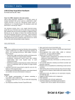 P R O D U C T D ATA LAN‐XI Data Acquisition Hardware for PULSE and Test for I‐deas From 2 to 1000+ channels in the same system LAN‐XI Data Acquisition Hardware is a versatile system of modular hardware that can be used as a stand‐alone, single‐ module front‐end, as part of a distributed module setup, or collected in 5‐ or 11‐module frames. The hardware works with both PULSE™ and Test for I‐deas™. The individual modules have a very rugged industrial design, perfect for use in the field, and, at the same time, are plug and play modules that you can easily reconfigure in different setups. Running on AC, DC, battery or Power over Ethernet (PoE) and with interchangeable front‐panel connectors, LAN‐XI hardware provides an extremely flexible system: scalable from 2 to more than 1000 channels with a frequency range of 25.6, 51.2, 102.4 or 204.8 kHz and unlimited data transfer capacity. Uses and Features Uses • Real‐time, multichannel sound and vibration data acquisition system: scalable from 2 to 1000+ measurement channels, all phase‐ and sampling‐synchronous (IEEE 1588v2 Precision Time Protocol): – Stand‐alone, single‐module front end for small setups: up to 12 input channels or 4 input/2 output channels – Distributed, multichannel system setups with multiple single‐module front ends located close to each measurement point – Multichannel systems comprising any number of front‐end frames in combination with any number of single‐module front ends • Laboratory and field measurements using the same AC, DC, battery or PoE powered system • Multipurpose conditioning of transducers: same input channel can condition all sound and vibration transducers Features • GPS sample synchronization of systems containing a Type 3660‐C‐100 or 3660‐D‐100 • Frequency range of 25.6, 51.2, 102.4 or 204.8 kHz depending on module • Low‐frequency auxiliary channels (Type 3056 only) • High‐speed tacho inputs (Type 3056 only) • Dyn‐X® technology input channels, 160 dB input range (except Type 3053) • Interchangeable front panels (BNC, LEMO or multi‐pin connectors) – use your preferred cabling • Display on each module’s front panel: – Simplifies system configuration and reduces the time for setting up a measurement system – Provides module status information on self‐test and error conditions • Full overload detection including out‐of‐band overload and generator overload • Indication of incorrect/defective conditioning on each channel connector • LAN interface allows the front end to be close to the test object and reduces the number of signal cables and transducer cable length • Powered by mains, DC, battery or, for stand‐alone modules, PoE (IEEE 802.3af) • Rugged and light modules cast in magnesium • Silent operation • Fully compatible with all PULSE applications • Automatic detection of hardware and transducers: – Supports IEEE 1451.4‐capable TEDS transducers System Overview LAN‐XI data acquisition hardware covers a range of input/output modules that can be used stand‐alone, in a distributed network or in frames holding up to 11‐modules. LAN‐XI hardware is extremely flexible and can be easily reconfigured, as requirements demand, into 2‐ to more than 1000‐channel systems. Applications include: • Noise source identification using an acoustic array • Operating deflection shape • Modal analysis • Satellite qualification tests • High‐frequency beamforming • Other high‐channel‐count measurements in sound and vibration The modules work equally well as single‐module systems, or as part of a large LAN‐XI measurement system, making them some of the most flexible data acquisitions modules on the market. In addition, interchangeable front panels give you the flexibility to use a wide range of transducers. 4/6‐ch. Input Module LAN‐XI 51.2 kHz Type 3050 Type 3050 comes in two basic variants, offering the choice between four and six high‐precision input channels with an input range from DC to 51.2 kHz. The core of the LAN‐XI range, these modules are designed to cover as many sound and vibration measurement applications as possible. 3‐ch. Input Module LAN‐XI 102.4 kHz Type 3052 Specifically designed to measure high‐frequency (> 50 kHz) sound and vibration signals, Type 3052 has three input channels with a frequency range from DC to 102.4 kHz. Combined with a dynamic range of 160 dB, this ensures that demanding measurement needs can be met. 12‐ch. Input Module LAN‐XI 25.6 kHz Type 3053 A 12‐channel input module that delivers a compact and cost‐efficient solution for high‐channel‐count applications. Standing alone, Type 3053 is the world’s smallest 12‐channel sound and vibration analyzer. 2 4‐ch. Input/HS‐Tacho + 8‐ch. Aux. Module LAN‐XI 51.2 kHz Type 3056 This module is aimed at applications where monitoring low‐frequency voltage signals along with the sound and vibration signals is required. The module offers a combination of four 51.2 kHz input channels with eight simultaneously sampled, low‐frequency auxiliary channels. Unique to Type 3056 is the support of high‐speed tacho signals on input channels 1 – 4, which lets you record the signals needed to perform angle domain analysis using PULSE Reflex™ Angle Domain Analysis Type 8740. Type 3056 features four DC outputs that can be controlled as functions of tolerance‐curve and level‐meter results. This is used for simple On/Off control of third‐party equipment in production test Pass/Fail, etc. 3‐ch. Bridge Input Module LAN‐XI 102.4 kHz Type 3057 Bridge Input Module Type 3057‐B‐030 is a three‐channel 102.4 kHz LAN‐XI module intended primarily for dynamic measurements using PULSE Reflex™, piezoresistive and variable‐capacitance accelerometers and pressure sensors. The module also supports strain gauges – full, half and quarter‐bridge – as well as strain‐gauge‐