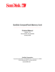 SanDisk CompactFlash Memory Card Product Manual Version 11.0 Document No. 20-10-00038 January 2006 SanDisk Corporation Corporate Headquarters • 140 Caspian Court • Sunnyvale, CA 94089 Phone (408) 542-0500 • Fax (408) 542-0503 www.sandisk.com SanDisk® Corporation general policy does not recommend the use of its products in life support applications where in a failure or malfunction of the product may directly threaten life or injury. Per SanDisk Terms and Conditions of Sale, the user of SanDisk products in life support applications assumes all risk of such use and indemnifies SanDisk against all damages. See “Limited Warranty” and “Disclaimer of Liability.” This document is for information use only and is subject to change without prior notice. SanDisk Corporation assumes no responsibility for any errors that may appear in this document, nor for incidental or consequential damages resulting from the furnishing, performance or use of this material. No part of this document may be reproduced, transmitted, transcribed, stored in a retrievable manner or translated into any language or computer language, in any form or by any means, electronic, mechanical, magnetic, optical, chemical, manual or otherwise, without the prior written consent of an officer of SanDisk Corporation. All parts of the SanDisk documentation are protected by copyright law and all rights are reserved. SanDisk and the SanDisk logo are registered trademarks of SanDisk Corporation. CompactFlash is a U.S. registered trademark of SanDisk Corporation. Product names mentioned herein are for identification purposes only and may be trademarks and/or registered trademarks of their respective companies. © 2006 SanDisk Corporation. All rights reserved. SanDisk products are covered or licensed under one or more of the following U.S. Patent Nos. 5,070,032; 5,095,344; 5,168,465; 5,172,338; 5,198,380; 5,200,959; 5,268,318; 5,268,870; 5,272,669; 5,418,752; 5,602,987. Other U.S. and foreign patents awarded and pending. Lit. No. 20-10-00038 Rev. 11.0BA 01/2006 ii Printed in U.S.A. ® CompactFlash Memory Card Product Manual, Rev. 11.0 ©2006 SanDisk Corporation Revision History • Revisions before Rev. 5—initial release and general changes. • Revision 5—general editorial changes, CF Type II information added, new higher capacities products added, some lower capacities removed, new card reader/writer vendor added. • Revision 6—added new 256 Mbit technology products, general and editorial changes. • Revision 7—changes to Translate Sector command (page 73) and Device Control Register Enable bit (page 53) • Revision 8—removed CF Type II information, added new higher capacity products, removed some lower capacity products, broadened temperature ranges for 3.3V and 5V operation, modified read & write timing specifications. • Revision 9—manual format and minor technical and editorial changes. • Revision 9.1—minor technical and editorial changes. • Revision 10.0—technical and editorial changes • Revision 10.1—technical and editorial changes • • • • • • Revision 10.2—revisions in power requirements and general text edits Revision 10.3—revisions in power requirements Revision 10.4—revisions in table 5-8 and table 6-1 Revision 10.5—revisions to Section 2.2, 2.6, and Appendix A Revision 10.6—updated part numbers Revision 10.7—updated to include DMA mode if supported; revised I/O write timing diagram & pwrup/dwn & other minor editorial changes; updated App C • Revision 10.8—updated part numbers; appendices; Table 5-8; feature bullet • Revision 10.9—updated values • Revision 11.0—updated capacity model; Identify Device Table; minor edits; added MB/GB calculation footnotes ® CompactFlash Memory Card Product Manual, Rev. 11.0 ©2006 SanDisk Corporation iii Table of Contents 1. Introduction to the CompactFlash Memory Card ............................................................................................... 1-1 1.1. Scope ................................................................................................................................................. 1-1 1.2. System Features................................................................................................................................. 1-2 1.3. PCMCIA Standard ............................................................................................................................ 1-2 1.4. CompactFlash Specification.............................................................................................................. 1-3 1.5. Related Documentation ..................................................................................................................... 1-3 1.6. Functional Description ...................................................................................................................... 1-3 1.6.1. Technology Independence....................................................................................................... 1-4 1.6.2. Defect and Error Management ................................................................................................ 1-4 1.6.3. Wear Leveling......................................................................................................................... 1-4 1.6.4. Using the Erase Sector and Write without Erase Commands.................................................. 1-4 1.6.5. Automatic Sleep Mode............................................................................................................ 1-5 1.6.6. Dynamic Adjustment of Performance versus Power Consumption ........................................ 1-5 1.6.7. Power Supply Requirements ................................................................................................... 1-5 2. Product Specifications ................................................................................................................................