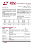 DEMO MANUAL DC1281A LTC2209 16-Bit, 160Msps/180Msps/ 185Msps ADCs DESCRIPTION Demonstration circuit 1281A supports a family of 16bit 160Msps/180Msps/185Msps ADCs. Each assembly features one of the following devices: LTC®2209, LTC2209#3BC, or LTC2209#3CD high speed, high dynamic range ADC. Other members of this family include the LTC2208 which is a 130Msps 16-bit version of this device. The LTC2208 is supported on the DC854 (CMOS) and the DC996 (LVDS). Lower speed, single-ended clock versions are also supported on the DC918 and DC919. Several versions of the 1281A demo board supporting the LTC2209 16-bit series of A/D converters are listed in Table 1. Depending on the required resolution, sample rate and input frequency, the DC1281A is supplied with the appropriate ADC and with an optimized input circuit. The circuitry on the analog inputs is optimized for analog input frequencies below 80MHz or from 80MHz to 160MHz. For higher input frequencies, contact the factory for support. Design files for this circuit board are available at http://www.linear.com/demo L, LT, LTC, LTM, Linear Technology and the Linear logo are registered trademarks; QuikEval and PScope are trademarks of Linear Technology Corporation. All other trademarks are the property of their respective owners. Table 1. DC1281A Variants DC1281A VARIANTS ADC PART NUMBER RESOLUTION MAXIMUM SAMPLE RATE INPUT FREQUENCY SUPPLY VOLTAGE 1281A-A LTC2209 16-Bit 1281A-B LTC2209 16-Bit 160Msps 1MHz to 80MHz 3.3V 160Msps 80MHz to 160MHz 3.3V 1281A-E LTC2209#3BCPBF 16-Bit 1281A-F LTC2209#3BCPBF 16-Bit 180Msps 1MHz to 80MHz 3.6V 180Msps 80MHz to 160MHz 3.6V 1281A-G LTC2209#3CDPBF 16-Bit 185Msps 1MHz to 80MHz 3.6V 1281A-H LTC2209#3CDPBF 16-Bit 185Msps 80MHz to 160MHz 3.6V PERFORMANCE SUMMARY (TA = 25°C) PARAMETER Supply Voltage – LTC2209 CONDITION Depending on Sampling Rate and the A/D Converter Provided, This Supply Must Provide Up to 700mA. Supply Voltage – LTC2209#3BC Depending on Sampling Rate and the A/D Converter Provided, This Supply Must and LTC2209#3CD Provide Up to 700mA. Analog Input Range Depending on PGA Pin Voltage Logic Input Voltages Minimum Logic High Maximum Logic Low Logic Output Voltages (Differential) Nominal Logic Levels (100Ω Load) Minimum Logic Levels (100Ω Load) Sampling Frequency (Convert See Table 1 Clock Frequency) Convert Clock Level 50Ω Source Impedance, AC-Coupled or Ground Referenced (Convert Clock Input Is Capacitor Coupled on Board and Terminated with 50Ω). Resolution Input Frequency Range SFDR SNR VALUE Optimized for 3.3V [3.15V⇔3.45V min/max] Optimized for 3.6V [3.5V⇔3.78V min/max] 1.5VP-P to 2.25VP-P 2V 0.8V 350mV/2.1V Common Mode 247mV/2.1V Common Mode 2VP-P⇔2.5VP-P Sine Wave or Square wave See Table 1 See Table 1 See Applicable Data Sheet See Applicable Data Sheet dc1281af 1 DEMO MANUAL DC1281A QUICK START PROCEDURE Demonstration circuit 1281A is easy to set up to evaluate the performance of the LTC2209 A/D converters. Refer to Figure 1 for proper measurement equipment setup and follow the procedure below: DC1281A Demonstration Circuit Board Jumpers The DC1281A demonstration circuit board should have the following jumper settings as default: (as per Figure 1): J2: Mode (VCC) 2’s Complement DCS Off Setup J3: SHDN: (Run) Dither (Off) If a DC890 QuikEval™ II Data Acquisition and Collection System was supplied with the DC1281A demonstration circuit, follow the DC890 Quick Start Guide to install the required software and for connecting the DC890 to the DC1281A and to a PC. J4: RAND (Off) PGA 1x J9: Unused Power Connector 3.6V OR 3.3V RAND MODE PGA ANALOG INPUT DITHER SHDN ENCODE CLOCK Figure 1. DC1281A Setup (Zoom for Detail) dc1281af 2 DEMO MANUAL DC1281A QUICK START PROCEDURE Applying Power and Signals to the DC996 Demonstration Circuit If a DC890 is used to acquire data from the DC1281A, the DC890 must first be connected to a powered USB port or provided an external 6V to 9V before applying 3.3V or 3.6V across the pins marked +3.3V and PWR GND on the DC1281A. The LTC2209#3BC and LTC2209#3CD require 3.6V for proper operation. The DC1281A demonstration circuit requires up to 700mA depending on the sampling rate and the A/D converter supplied. The DC890 data collection board is powered by the USB cable and does not require an external power supply unless it must be connected to the PC through an unpowered hub in which case it must be supplied an external 6V to 9V on turrets G7(+) and G1(–) or the adjacent 2.1mm power jack. Analog Input Network For optimal distortion and noise performance the RC network on the analog inputs may need to be optimized for different analog input frequencies. For input frequencies above 160MHz use demonstration circuit 1281A. Other input networks may be more appropriate for input frequencies less that 5MHz. In almost all cases, filters will be required on both analog input and encode clock to provide data sheet SNR. The filters should be located close to the inputs to avoid reflections from impedance discontinuities at the driven end of a long transmission line. Most filters do not present 50Ω outside the passband. In some cases, 3dB to 10dB pads may be required to obtain low distortion. If your generator cannot deliver full-scale signals without distortion, you may benefit from a medium power amplifier based on a Gallium Arsenide Gain block prior to the final filter. This is particularly true at higher frequencies where IC-based operational amplifiers may be unable to deliver the combination of low noise figure and High IP3 point required. A high order filter can be used prior to this final amplifier, and a relatively lower Q filter used between the amplifier and the demo circuit. Encode Clock Note: This is not a logic-compatible input. It is terminated with 50Ω. Apply an encode clock to the SMA connector on the DC1281A demonstration circuit board marked J7 ENCODE INPUT. This is a transformer-coupled input, terminated on the secondary side in two steps, 100Ω