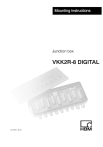 Mounting instructions Junction box VKK2R-8 DIGITAL A1145-1.0 en 3 VKK2R-8 DIGITAL Contents Page Safety instructions . . . . . . . . . . . . . . . . . . . . . . . . . . . . . . . . . . . . . . . . . . . . 4 1 Introduction and appropriate use . . . . . . . . . . . . . . . . . . . . . 7 2 2.1 Mechanical construction . . . . . . . . . . . . . . . . . . . . . . . . . . . . . 8 Mounting . . . . . . . . . . . . . . . . . . . . . . . . . . . . . . . . . . . . . . . . . . . . 9 3 3.1 3.2 3.3 3.5 3.5 3.6 Electrical connection . . . . . . . . . . . . . . . . . . . . . . . . . . . . . . . Cable connection . . . . . . . . . . . . . . . . . . . . . . . . . . . . . . . . . . . Clamp connection . . . . . . . . . . . . . . . . . . . . . . . . . . . . . . . . . . . Power supply . . . . . . . . . . . . . . . . . . . . . . . . . . . . . . . . . . . . . . . Connection to a computer . . . . . . . . . . . . . . . . . . . . . . . . . . . . RS-485-4-wire bus . . . . . . . . . . . . . . . . . . . . . . . . . . . . . . . . . . RS-485-2-wire bus . . . . . . . . . . . . . . . . . . . . . . . . . . . . . . . . . . 4 VKK2R-8 DIGITAL specifications A1145-1.0 en 10 10 11 12 12 14 15 . . . . . . . . . . . . . . . . . . . 17 HBM 4 VKK2R-8 DIGITAL Safety instructions Appropriate use The junction box is to be used exclusively for interconnecting the interfaces, the power supply and the bus termination. Use for any purpose other than the above shall be deemed to be not in accordance with the regulations. In the interests of safety, the junction box should only be used as described in the Mounting Instructions. It is also essential to comply with the legal and safety requirements for the application concerned during use. The same applies to the use of accessories. The junction box is not a safety element as defined under Appropriate use. For safe and trouble-free operation, this junction box must not only be correctly transported, stored, sited and installed, but must also be carefully operated and maintained. General dangers of failing to follow the safety instructions The junction box is a state of the art unit and as such is fail-safe. The junction box may give rise to further dangers if it is inappropriately installed and operated by untrained personnel. Any person instructed to carry out installation, commissioning, maintenance or repair of a junction box must have read and understood the Mounting Instructions and in particular the technical safety instructions. Remaining dangers The scope of supply and list of components provided with the junction box cover only part of the scope of connection technique. In addition, equipment planners, installers and operators should plan, implement and respond to the safety engineering considerations of connection technique in such a way as to minimize remaining dangers. Prevailing regulations must be complied with at all times. There must be reference to the remaining dangers connected with connection technique. Symbol: NOTE Refers to the fact that important information is being given about the product or its use. HBM A1145-1.0 en 5 VKK2R-8 DIGITAL Unauthorized conversions and modifications are prohibited The junction box must not be modified from the design or safety engineering point of view except with our express agreement. Any modification shall exclude all liability on our part for any resulting damage. Qualified personnel The junction box is only to be installed by qualified personnel strictly in accordance with the technical data and with the rules and safety regulations which follow. It is also essential to comply with the legal and safety requirements for the application concerned. The same applies to the use of accessories. Qualified personnel means persons entrusted with the installation, assembly, commissioning and operation of the product who possess the appropriate qualifications for their function. Conditions on site Do not allow the junction box to become dirty or damp. Maintenance The junction box is designed to provide degree of protection IP65 (dust protection, protection against water jets). You must make regular checks to ensure that the rubber seal in the cover and the screw connections is not leaking. Accident prevention The relevant accident prevention regulations must be taken into consideration. A1145-1.0 en HBM 6 VKK2R-8 DIGITAL NOTE Neither the design of the device nor any technical safety aspects may be modified without the express permission of Hottinger Baldwin Messtechnik GmbH. Any modification excludes Hottinger Baldwin Messtechnik GmbH from any and all liability for any damage resulting therefrom. It is strictly forbidden to carry out any repairs and soldering work on the motherboards or to replace any components. Repairs may only be carried out by persons authorized thereto by Hottinger Baldwin Messtechnik GmbH. • During installation and when connecting the cables, take action to prevent electrostatic discharge as this may damage the electronics. • The required power supply is an extra-low voltage (6...30 V) with safe disconnection from the mains. • When connecting additional devices, comply with the safety requirements for electrical measurement, control, regulatory and laboratory equipment (EN61010). • All the interconnecting cables must be screened cables. The screen must be connected extensively to ground on both sides. HBM A1145-1.0 en 7 VKK2R-8 DIGITAL 1 Introduction and appropriate use The VKK2R-8 DIGITAL junction box is used to interconnect the serial interfaces (RS-485), the power supply and the RS-485 bus termination. It is preferable for the following HBM products to be wired in the RS-485 bus: • Digital transducers: C16i, RTNi, FIT • Digital transducer electronics: AED9101A, AED9201A • Digital measurement chains with transducer electronics: AD104-R5, AD105 • Weighing electronics: WE2108, WE2110 The RS-485 bus can be wired as a 2-wire- or a 4-wire bus. The form of connection to be used will depend on the particular type o