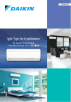 Contents 3 Product Lineup 5 Inverter Technology 7 Special Features 9 Airflow 11 Cleanliness and Durability 13 Function Dictionary 15 Function List 17 Specifications 21 Controller 22 Options 1 2 Lineup Cooling Only FTKS series Cooling Only FTKD series Model Cooling Capacity FTKS25/35G Cooling Capacity Model Cooling Capacity Model RKS50/60G FTKS50/60/71G RKS71G Cooling Capacity Model Cooling Capacity Cooling Capacity 2.5 (1.2-3.3) 8,500 (4,100-11,300) kW Btu/h FTKS35GVMV / RKS35GVMV Model RKS25/35G Model FTKS25GVMV / RKS25GVMV RKD25/35H FTKD25/35H 3.3 (1.3-4.2) 11,300 (4,400-14,300) kW Btu/h FTKS50GVMV / RKS50GVMV Model 5.2 (1.9-6.3) 17,700 (6,500-21,500) kW Btu/h FTKS60GVMV / RKS60GVMV Cooling Capacity RKD42H FTKD42/50/60/71H RKD50/60/71H 6.0 (1.9-7.1) 20,500 (6,500-24,200) kW Btu/h Model Cooling Capacity FTKS71GVMV / RKS71GVMV Model 7.1 (2.5-8.7) 24,200 (8,500-29,700) kW Btu/h Model Cooling Capacity Cooling Capacity Model Cooling Capacity Heat Pump FTXS series 2.5 (1.2-3.2) 8,500 (4,050-10,900) FTKD35HVMV / RKD35HVMV 3.2 (1.4-4.0) 10,900 (4,750-13,650) kW Btu/h FTKD42HVMV / RKD42HVMV 4.2 (2.0-5.0) 14,300 (6,800-17,100) kW Btu/h FTKD50HVMV / RKD50HVMV 5.2 (1.5-5.9) 17,700 (5,100-20,100) kW Btu/h FTKD60HVMV / RKD60HVMV 6.2 (1.5-6.5) 21,200 (5,100-22,200) kW Btu/h FTKD71HVMV / RKD71HVMV 7.1 (2.1-7.6) 24,200 (7,200-25,900) kW Btu/h Heat Pump FTXD series FTXS25GVMV / RXS25GVMV Model Cooling Capacity FTXS25/35G RXS25/35G Heating Capacity Model 2.5 (1.2-3.0) 8,500 (4,100-10,200) 3.4 (1.2-4.5) 11,600 (4,100-15,350) kW Btu/h kW Btu/h Cooling Capacity Heating Capacity Cooling Capacity Heating Capacity RXS71G Cooling Capacity Heating Capacity FTXS50GVMV / RXS50GVMV Model Cooling Capacity RXS50/60G Model 3.5 (1.2-3.8) 11,900 (4,100-12,950) 4.0 (1.2-5.0) 13,600 (4,100-17,050) kW Btu/h kW Btu/h Heating Capacity 5.0 (1.7-6.0) 17,100 (5,800-20,500) 5.8 (1.7-7.7) 19,800 (5,800-26,300) kW Btu/h kW Btu/h Model Cooling Capacity FTXD50/60/71H Heating Capacity Cooling Capacity Heating Capacity Heating Capacity Model 7.1 (2.3-8.5) 24,200 (7,800-29,000) 8.2 (2.3-10.0) 28,000 (7,900-34,100) kW Btu/h kW Btu/h Cooling Capacity Heating Capacity Capacity range 25 35 42 50 60 Model name 71 Cooling only FTKS Cooling only FTKD Heat pump FTXS Heat pump FTXD 3 Heating Capacity Model 6.0 (1.7-6.7) 20,500 (5,800-22,900) 7.0 (1.7-8.0) 23,900 (5,800-27,300) kW Btu/h kW Btu/h FTXS71GVMV / RXS71GVMV Model Cooling Capacity Model name RXD50/60/71H FTXS60GVMV / RXS60GVMV Model Cooling Capacity FTXD25HVMV / RXD25HVMV 2.5 (1.3-3.0) 8,500 (4,400-10,200) 3.4 (1.3-4.0) 11,600 (4,400-13,650) kW Btu/h kW Btu/h RXD25/35H FTXD25/35H FTXS35GVMV / RXS35GVMV Model FTXS50/60/71G FTKD25HVMV / RKD25HVMV kW Btu/h 4 FTXD35HVMV / RXD35HVMV 3.5 (1.4-3.8) 11,900 (4,750-12,950) 4.2 (1.4-5.0) 14,300 (4,750-17,050) kW Btu/h kW Btu/h FTXD50HVMV / RXD50HVMV 5.2 (1.5-5.9) 17,700 (5,100-20,100) 6.5 (1.5-8.0) 22,200 (5,100-27,300) kW Btu/h kW Btu/h FTXD60HVMV / RXD60HVMV 6.2 (2.2-7.6) 21,200 (7,500-25,900) 7.2 (2.2-9.0) 24,600 (7,500-30,700) kW Btu/h kW Btu/h FTXD71HVMV / RXD71HVMV 7.1 (2.9-8.0) 24,200 (9,900-27,300) 8.5 (2.9-9.7) 29,000 (9,900-33,100) kW Btu/h kW Btu/h Capacity range 25 35 42 50 60 71 Inverter Technology Energy-Saving Technological Features Inverter Advantages Compared to Non-Inverter Swing Compressor Features of Inverter Technology An inverter is a device for converting frequency. The technology is used in many home appliances and controls the electric voltage, current and frequency. Inverter air conditioners can vary their cooling/heating capacity by adjusting the power supply frequency of their compressors. In contrast, non-inverter air conditioners have a fixed cooling/heating capacity and can only control the indoor temperature by starting or stopping their compressors. As a result, inverter air conditioners are more energy-saving and comfortable than non-inverter air conditioners. Swing compressor Thanks to its smooth rotation, the swing compressor decreases friction and vibration. It also prevents the leakage of refrigerant gas during compression. These advantages provide quiet and efficient operation. Swing bush Integral piston of blade and roller The swing compressor can reduce operational vibration and sound because its piston moves smoothly inside the compressor. Reluctance DC motor Compressor Inverter Power Control Power source Raise frequency High-speed rotation High capacity Lower frequency Low-speed rotation Low capacity Non-inverter type air conditioner Energy Saving After the indoor temperature approaches the set temperature, Inverter Control adjusts to low capacity operation to maintain this temperature. This makes inverter models more energy-saving than non-inverter models, which must repeatedly start or stop their compressors to maintain the room temperature. Power source Reluctance DC Motor for Compressors Compressor Constant speed rotation Fixed capacity Neodymium magnets are used in the pink-coloured area. Inverter air conditioners are able to vary their operating capacity. Non-inverter air conditioners can only operate at a fixed capacity. Daikin DC Inverter models are equipped with the Reluctance DC motor for compressors. The Reluctance DC motor uses 2 different types of torque, neodymium magnet*1 and reluctance torque*2. This motor saves energy by generating more power with a smaller electric current than AC or conventional DC motors. It is more efficient at the low frequencies most commonly used by air conditioners,*3 improving efficiency by approximately 20%. Efficiency of Reluctance DC motor *4 Reluctance DC motor Motor efficiency (%) Inverter air conditioners operate at maximum capacity as soon as they start up. As a result, the set temperature can be reached more quickly. Variable Capacity Operation 90 80 Conventional DC motor More than 20% 70 AC motor 60 50 0 30 60 90 120 Rotational speed (rps) Small load Low capacity *1. A neodymium magnet is approximately 10 times stronger than a standard ferrite magnet. *