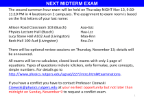 The second common hour exam will be held on Thursday NIGHT Nov 13, 9:5011:10 PM in 4 locations on 2 campuses. The assignment to exam room is based
