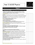 Physics 2 1 Forces and their effects Forces can cause changes to the shape or motion of an object. Objects can move in a straight line at a constant speed. They can also change their speed and / or direction (accelerate or decelerate). Graphs can help us to describe the movement of an object. These may be distance–time graphs or velocity–time graphs. 1 Resultant forces a) Whenever two objects interact, the forces they exert on each other are equal and opposite. b) A number of forces acting at a point may be replaced by a single force that has the same effect on the motion as the original forces all acting together. This single force is called the resultant force. c) A resultant force acting on an object may cause a change in its state of rest or motion. d) If the resultant force acting on a stationary object is: ■ zero, the object will remain stationary ■ not zero, the object will accelerate in the direction of the resultant force. e) If the resultant force acting on a moving object is: ■ zero, the object will continue to move at the same speed and in the same direction ■ not zero, the object will accelerate in the direction of the resultant force. P2.1.2 Forces and motion a) The acceleration of an object is determined by the resultant force acting on the object and the mass of the object. F= m * a b) The gradient of a distance–time graph represents speed. c) Calculation of the speed of an object from the gradient of a distance–time graph. d) The velocity of an object is its speed in a given direction. e) The acceleration of an object is given by the equation: a=v – u t f) The gradient of a velocity–time graph represents acceleration. g) Calculation of the acceleration of an object from the gradient of a velocity–time graph. h) Calculation of the distance travelled by an object from a velocity–time graph. P2.1.3 Forces and braking a) When a vehicle travels at a steady speed the resistive forces balance the driving force. b) The greater the speed of a vehicle the greater the braking force needed to stop it in a certain distance. c) The stopping distance of a vehicle is the sum of the distance the vehicle travels during the driver’s reaction time (thinking distance) and the distance it travels under the braking force (braking distance). d) A driver’s reaction time can be affected by tiredness, drugs and alcohol. e) When the brakes of a vehicle are applied, work done by the friction force between the brakes and the wheel reduces the kinetic energy of the vehicle and the temperature of the brakes increases. f) A vehicle’s braking distance can be affected by adverse road and weather conditions and poor condition of the vehicle. P2.1.4 Forces and terminal velocity g r e e n Revision Notes and topic sheet Year 11 GCSE Physics a r m e b d e r a) The faster an object moves through a fluid the greater the frictional force that acts on it. b) An object falling through a fluid will initially accelerate due to the force of gravity. Eventually the resultant force will be zero and the object will move at its terminal velocity (steady speed). c) Draw and interpret velocity-time graphs for objects that reach terminal velocity, including a consideration of the forces acting on the object. d) Calculate the weight of an object using the force exerted on it by a gravitational force: W_m_g P2.1.5 Forces and elasticity a) A force acting on an object may cause a change in shape of the object. b) A force applied to an elastic object such as a spring will result in the object stretching and storing elastic potential energy. Candidates should use their skills, knowledge and understanding to: ■ interpret data from tables and graphs relating to speed, velocity and acceleration ■ evaluate the effects of alcohol and drugs on stopping distances ■ evaluate how the shape and power of a vehicle can be altered to increase the vehicle’s top speed ■ draw and interpret velocity–time graphs for objects that reach terminal velocity, including a consideration of the forces acting on the object. 2 The kinetic energy of objects speeding up or slowing down When an object speeds up or slows down, its kinetic energy increases or decreases. The forces which cause the change in speed do so by doing work. The momentum of an object is the product of the object’s mass and velocity. Forces and energy a) When a force causes an object to move through a distance work is done. b) Work done, force and distance, are related by the equation: W = F * dC guidance: W is the work done in joules, J F is the force applied in newtons, N d is the distance moved in the direction of the force in metres, m c) Energy is transferred when work is done. d) Work done against frictional forces. e) Power is the work done or energy transferred in a given time. P=E*t P is the power in watts, W E is the energy transferred in joules, J t is the time taken in seconds, s f) Gravitational potential energy is the energy that an object has by virtue of its position in a gravitational field. Ep = m* g* h Ep is the change in gravitational potential energy in joules, J m is the mass in kilograms, kg g is the gravitational field strength in newtons per kilogram, N/kg h is the change in height in metres, m g) The kinetic energy of an object depends on its mass and its speed. Ek =1mv2 2 Ek is the kinetic energy in joules, J m is the mass in kilograms, kg v is the speed in metres per second, m/s P2.2.2 Momentum a) Momentum is a property of moving objects. p_m_v p is momentum in kilograms metres per second, kg m/s m is the mass in kilograms, kg v is the velocity in metres per second, m/s Examples of events are collisions and explosions. b) In a closed system the total momentum before an event is equal to the total momentum after the event. This is called conservation of momentum. 3 Currents in electrical circuits The current in an electric circuit depends on the resistance of the components and the supply. P2.3.1 Static electricity a) Wh