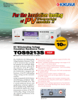 DC Withstanding Voltage/Insulation Resistance Tester TOS9213S For the insulation testing of PV module !! DC OUTPUT 10kV DC Withstanding Voltage / Insulation Resistance Tester TOS9213S NEW ■ Equipped with GPIB and RS-232C as standard The TOS9213S, DC Withstanding Voltage/Insulation Resistance Tester, is the test instrument that can handle the insuration test with high voltage and high resolution required for the evaluation of the PV module, Cable, Connector, and Junction Box. The TOS9213S is equipped with functions of the DC withstanding voltage testing and the insulation resistance testing accompanied with the features and performance of Kikusui's highend model TOS9200 series, and it extends additional features and specifications exclusively applied to the PV module testing. Furthermore, the TOS9213S improves the current measurement accuracy of the DC withstanding voltage testing from the original specification of the TOS9000 series. ■ Up to 10 kV/5 mA with a maximum output of 50 W in DC withstanding voltage test ■ Perform insulation resistance testing in the range of -25 V to -1000 V / 0.01 M to 9.99 G ■ Applies for the testing of IEC61730-2 standard ■ High-precision current measurement, 1 µA of the setting resolution for judgement ■ Low output ripple of 100V p-p at 10 kV with consideration of capacitive load ■ Rise-time control function makes a voltage to be increased slowly and it will not give effect of the stress to the PV module ■ The judgement method of the insulation resistance test can be selected by using the current value in addition to the resistance value ■ The phenomena of voltage appearance by the dielectric absorption, the forcible discharge timer function can be set up to 300 seconds ▲ Rear Panel Specifications *The highlighted text in red indicates the improved specification exclusively applied to the PV module testing. ■ Withstanding Voltage Test Mode ■ Insulation Resistance Testing Mode Output section(DC) Output section Output-voltage range 0.05V to 10.0kV Output-voltage range 10V Resolution 1V Accuracy ±(1.5% of setting +20V) Accuracy ±(1.5% of setting+2V) Maximum rated load *1 50W(10kV/5mA) Maximum rated load Maximum rated current 5mA Maximum rated current Ripple -25V to -1000V Resolution No load at 10kV 100Vp-p Typ. Maximum rated load 100Vp-p Typ. Ripple 1W(-1000V/1mA) 1mA 1 kV no-load 2 Vp-p or less Maximum rated load 10 Vp-p or less Voltage regulation 1% or less [maximum rated load → no load] Voltage regulation 1% or less [ Maximum rated load no load ] Short-circuit current 40mA Typ. Short-circuit current 12 mA or less Discharge function Forced discharge at the end of test (discharge resistance: 500 k) The discharge time can be set to a value from 0.5 s to 300 s. (*2) Discharge function Forced discharge at the end of test (discharge resistance: 25 k)The discharge time can be set to a value from 0.5s to 300 s.(*2) The voltage at the start of the test can be set as the start voltage. Start voltage Setting range 0% to 99% of the test voltage (resolution of 1%) If the output voltage exceeds ±(10% of setting + 50V), output is cut off and the protection function activates. Output-voltage monitoring function Voltmeter Analog Digital *1: If the output voltage exceeds ±(10% of the setting + 50 V), Output-voltage monitoring function output is cut off and the protection function activates. Voltmeter Analog Scale 10kV DC F.S Accuracy ±5% F.S Scale 10kV DC F.S Indicator Mean-value responsive Accuracy ±5% F.S Measurement range 0 to -1200V Indicator Mean-value responsive Resolution 1V Measurement range 0.00 to 10.5kV DC Accuracy ±(1.0% of reading +1V) Resolution 10V Resistance meter Accuracy ±(1.0% of reading + 20 V) Measurement range Response Mean-value responsive (response time of 200 ms) Accuracy HOLD function The voltage measured at the end of test is held during the PASS and FAIL period. Digital Limitation on output The tester’s withstanding voltage generator is designed to radiate half as much heat as the rated output, in consideration of the size, weight, cost, and other factors of the tester. It is therefore necessary to use the tester within the ranges specified below. Operations deviating from these ranges may heat the output section excessively, thereby activating the protective circuit. In such a case, suspend the test and wait until the temperature falls to the normal level. 0.01 M - 9.99 G (Within the maximum rated current range of 1 mA to 50 mA) 50nA ≤ i ≤ 100nA 100nA < i ≤ 200nA 200nA < i ≤ 1μA 1μA < i ≤ 1mA ±(20% of reading.) ±(10% of reading.) ±(5% of reading.) ±(2% of reading.) [i=measured current] [In the humidity range of 20 % to 70 % R.H (no condensation), with no disturbance such as swinging of the test leadwire] Judgement function The UPPER/LOWER judgement can be switched between the resistance value-based judgement and current valuebased judgement. The action for the judgement method by the current valuedbased judgement, Display, Buzzer, SIGNAL I/O can be referred to the action in Withstanding Voltage Test Mode. Output limitation in withstanding voltage testing Ambient temperature t ≤ 40℃ DC Judgement method Upper reference Pause Output time 2.5mA < i At least as long as the output time Maximum of 1 minute i ≤ 2.5 mA At least as long as the judgement wait time (WAIT TIME) Continuous output possible [Output time = voltage rise time + test time + voltage fall time] *2: About the discharge time settingIf you set the discharge time to 0.0 s or if the voltage between the output terminals exceeds approximately 30 V even after the specified discharge time has passed, the TOS9213S will continue discharging until the voltage between the output terminals falls below approximately 30 V. Display *3 Accuracy Hold function Setting range for Resistance value-based judgment 0.01 M to 9.99 G [Below the maximum rated current] the lower reference Current value-based judgment 0.1 µA to 1.00 mA (LOWER) Time Ammeter
