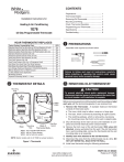 CONTENTS Preparations................................................... 1 Thermostat Details......................................... 1 Removing Old Thermostat.............................. 1 Mounting and Wiring....................................... 2 Check Thermostat Operation.......................... 3 Programming your Thermostat....................... 4 Specifications................................................. 6 Troubleshooting.............................................. 6 Installation Instructions for Heating & Air Conditioning 1E78 5/2 Day Programmable Thermostat YOUR THERMOSTAT REPLACES Typical System Compatibility Chart Standard Heat Only Two Wire Gas or Oil Fired Systems (24 volt) Electronic Ignition Heat Only Two Wire Systems (24 volt) Electronic Ignition Heat Only Gas or Oil Fired Systems (24 volt) Standard Heat/Cool Systems (24 volt) Heat/Cool Systems Electric Heat (24 volt) Heat Only Electric Heat Systems (24 volt) Cool Only Systems (24 volt) Heat Pump Systems (No Aux. or Emergency Heat) Hot Water Zone Heat Only (Two Wire) Systems Hot Water Zone Heat Only (Three Wire) Systems Line Voltage Heating or Baseboard 110/240 Volt Systems Millivolt Systems Floor or Wall Furnaces 12 VDC Mobile Home Application Multistage Systems Systems Exceeding 30VAC, 1.5 Amp 1E78 Yes Yes Yes Yes Yes Yes Yes Yes Yes No No Yes Yes No No 2 THERMOSTAT DETAILS 1 PREPARATIONS Assemble tools required as shown below. FLAT BLADE SCREWDRIVER HAND OR POWER DRILL WITH 3/16 INCH DRILL BIT, IF NEEDED WIRE CUTTER/STRIPPER Failure to follow and read all instructions carefully before installing or operating this control could cause personal injury and/or property damage 3 REMOVING OLD THERMOSTAT ! CAUTION Mounting Hole To prevent electrical shock and/or equipment damage, disconnect electrical power to the system at the main fuse or circuit breaker until installation is complete. W903 W904 RC G RH Y O B W W905 ELEC Base Mounting Hole GAS Back of Thermostat Body Elec/Gas Switch W903 - clip to disable EMR feature W904 - clip for Celcius display W905 - clip for hydronic system NOTE: Earlier models refer to 37-7006 for jumper locations. Figure 1. Thermostat Before removing wires from old thermostat’s switching subbase, label each wire with the terminal designation it was removed from. 1. Remove Old Thermostat: A standard heat/cool thermostat consists of three basic parts: a. The cover, which may be either a snap-on or hinge type. b. The base, which is removed by loosening all captive screws. c. The switching subbase, which is removed by unscrewing the mounting screws that hold it on the wall or adaptor plate. 2. Shut off electricity at the main fuse box until installation is complete. Ensure that electrical power is disconnected. 3. Remove the front cover of the old thermostat. With wires still attached, remove wall plate from the wall. If the old thermostat has a wall mounting plate, remove the thermostat and the wall mounting plate as an assembly. 4. Identify each wire attached to the old thermostat. 5. Disconnect the wires from the old thermostat one at a time. DO NOT LET WIRES FALL BACK INTO THE WALL. 6. Install new thermostat using the following procedures. PART NO. 37-6542C www.white-rodgers.com www.emersonclimate.com Replaces 37-6542B 1026 3 REMOVING OLD THERMOSTAT CONTINUED FROM FIRST PAGE ATTENTION! This product does not contain mercury. However, this product may replace a unit which contains mercury. Do not open mercury cells. If a cell becomes damaged, do not touch any spilled mercury. Wearing non-absorbent gloves, take up the spilled mercury and place into a container which can be sealed. If a cell becomes damaged, the unit should be discarded. Mercury must not be discarded in household trash. When the unit this product is replacing is to be discarded, place in a suitable container. Refer to www.white-rodgers.com for location to send product containing mercury. 4 MOUNTING AND WIRING ! Take care when securing and routing wires so they do not short to adjacent terminals or rear of thermostat. Personal injury and/or property damage may occur. TERMINAL CROSS REFERENCE CHART New Thermostat Terminal Designation RH Other Manufacturers’ Terminal Designation * * 4 RH M R5 R RC R R V - - G G G F G G W W W H 4 W Y Y Y C Y6 Y * These are four-wire, single-transformer systems. Factory installed jumper wire between the RH and RC terminals must remain in place. WARNING Do not use on circuits exceeding specified voltage. Higher voltage will damage control and could cause shock or fire hazard. Do not short out terminals on gas valve or primary control to test. Short or incorrect wiring will damage thermostat and could cause personal injury and/or property damage. Thermostat installation and all components of the system shall conform to Class II circuits per the NEC code. ! CAUTION Energy Management Recovery (EMR) This thermostat is set to operate with EMR. This causes the thermostat to start the heating or cooling system early to have the room temperature reach the program setpoint at the time the period is to start. To disable EMR, clip jumper W903 (see Fig. 1). Attach Thermostat Base to Wall Electric Heat or Single-Stage Heat Pump Systems This thermostat is configured from the factory to operate a heat/cool, fossil fuel (gas, oil, etc.), forced air system. It is configured correctly for any system that DOES NOT require the thermostat to energize the fan on a call for heat. If your system is an electric or heat-pump system that REQUIRES the thermostat to turn on the fan on a call for heat, locate the GAS/ELECTRIC switch (see fig. 1) and switch it to the ELECTRIC position. This will allow the thermostat to energize the fan immediately on a call for heat. If you are unsure if the heating/ cooling system requires the thermostat to control the fan, contact a qualified heating and air conditioning service person. Hydronic (Hot Water or Steam) Heating Systems This thermostat is set to operate properly with a forced-