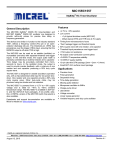 MIC1555/1557 IttyBitty® RC Timer/Oscillator General Description ® The MIC1555 IttyBitty CMOS RC timer/oscillator and ® MIC1557 IttyBitty CMOS RC oscillator are designed to provide rail-to-rail pulses for precise time delay or frequency generation. The devices are similar in function to the industry standard “555”, without a frequency control (FC) pin or an opencollector discharge (D) pin. The threshold pin (THR) has precedence over the trigger (TRG) input, ensuring that the BiCMOS output is off when TRG is high. The MIC1555 can be used as an astable (oscillator) or monostable (one-shot) with separate threshold and trigger inputs. In the one-shot mode, the output pulse width is precisely controlled by an external resistor and a capacitor. Time delays may be accurately controlled from microseconds to hours. In the oscillator mode, the output is used to provide precise feedback, with a minimum of one resistor and one capacitor producing a 50% duty cycle square wave. The MIC1557 is designed for astable (oscillator) operation only, with a chip select/reset (CS) input for low power shutdown. One resistor and one capacitor provide a 50% duty cycle square wave. Other duty-cycle ratios may be produced using two diodes and two resistors. The MIC1555/7 is powered from a +2.7V to +18V supply voltage and is rated for –40°C to +85°C ambient temperature range. The MIC1555/7 is available in SOT-235, and thin SOT23-5 5-pin packages. A low profile, ultrathin, (UTDFN), version of the MIC1555 (with chip select) is also available. Datasheets and support documentation are available on Micrel’s website at: www.micrel.com. Features • +2.7V to +18V operation • Low current − <1µA typical shutdown mode (MIC1557) − 200µA typical (TRG and THR low) at 3V supply • Timing from microseconds to hours • “Zero” leakage trigger and threshold inputs • 50% square wave with one resistor, one capacitor • Threshold input precedence over trigger input • <15Ω output on resistance • No output cross-conduction current spikes • <0.005%/°C temperature stability • <0.055%/V supply stability • 10-pin ultra-thin DFN package (2mm × 2mm × 0.4mm) • Small SOT-23-5 surface mount package Applications • • • • • • • • • • • Precision timer Pulse generation Sequential timing Time-delay generation Missing pulse detector Micropower oscillator to 5MHz Charge-pump driver LED blinker Voltage converter Linear sweep generator Variable frequency and duty cycle oscillator IttyBitty is a registered trademark of Micrel, Inc. Micrel Inc. • 2180 Fortune Drive • San Jose, CA 95131 • USA • tel +1 (408) 944-0800 • fax + 1 (408) 474-1000 • http://www.micrel.com August 12, 2015 Revision 6.1 Micrel, Inc. MIC1555/1557 Typical Applications Monostable (One-Shot) Monostable (with Enable) Astable (Oscillator) August 12, 2015 2 Revision 6.1 Micrel, Inc. MIC1555/1557 Ordering Information Part Number Top Marking (1, 2) Temperature Range Package Package Height (mm) MIC1555YD5 T12 –40°C to +85°C 5-Pin Thin SOT-23 1.0 (maximum) MIC1555YMU T14 –40°C to +85°C 10-Pin 2mm × 2mm UTDFN 0.4 (maximum) MIC1555YM5 T10 –40°C to +85°C 5-Pin SOT-23 0.9 – 1.45 MIC1557YD5 T13 –40°C to +85°C 5-Pin Thin SOT-23 1.0 (maximum) MIC1557YM5 T11 –40°C to +85°C 5-Pin SOT-23 0.9 – 1.45 Note: 1. Underbars ( ) shown for the top marking may not be to scale. 2. The top marking in the YMU package does not have an underbar. Pin Configuration (MIC1555 SOT-23 and TSOT-23) 5-Pin SOT-23 (M5) (Top View) 5-Pin TSOT-23 (D5) (Top View) Pin Description (MIC1555 SOT-23 and TSOT-23) Pin Number Pin Name 1 VS 2 GND Ground: Supply return. 3 OUT Output: CMOS totem-pole output. 4 TRG Trigger (Input): Sets output high. Active low (at ≤2/3VS nominal). 5 THR Threshold (Dominant Input): Sets output low. Active high (at ≥2/3VS nominal). August 12, 2015 Pin Function Supply (Input): +2.7V to +18V supply. 3 Revision 6.1 Micrel, Inc. MIC1555/1557 Pin Configuration (MIC1555 UTDFN) 10-Pin UTDFN (MU) (Top View) Pin Description (MIC1555 UTDFN) Pin Number Pin Name Pin Function 1 VS Supply (Input): +2.7 to +18V supply. 2 CS Chip Select/Reset (Input): Active high at >2/3VS. Output off when low at <1/3VS. If chip select functionality is not desired, CS may be connected directly to VS. 3, 4, 7, 9 NC No Connect. This pin is not internally connected. 5 THR Threshold (Dominant Input): Sets output low. Active high (at ≥ 2/3VS nominal). 6 TRG Trigger (Input): Sets output high. Active low (at ≤2/3VS nominal). 8 GND Ground: Supply return. 10 OUT Output: CMOS totem-pole output. Pin Configuration (MIC1557 SOT-23 and TSOT-23) 5-Pin SOT-23 (M5) (Top View) 5-Pin TSOT-23 (D5) (Top View) Pin Description (MIC1557 SOT-23 and TSOT-23) Pin Number Pin Name 1 T/T 2 GND Pin Function Trigger/Threshold (Input): Internally connected to both threshold and trigger functions. When the voltage at this pin is ≤2/3VS it will set the output high. When the voltage at this pin is ≥2/3VS it will set the output low. Ground: Supply return. CS Chip Select/Reset (Input): Active high at >2/3VS. Output off when low at <1/3VS. If chip select functionality is not desired, CS may be connected directly to VS. 4 VS Supply (Input): +2.7 to +18V supply. 5 OUT 3 August 12, 2015 Output: CMOS totem-pole output. 4 Revision 6.1 Micrel, Inc. MIC1555/1557 Absolute Maximum Ratings(3) Operating Ratings(4) Supply Voltage (VS) ...................................................... +22V Threshold Voltage (VTHR, VT/T). .................................... +22V Trigger Voltage (VTGR, VT/T) .......................................... +22V Lead Temperature (soldering, 10s) ............................ 300°C Ambient Storage Temperature .................. –65°C to +150°C (5) ESD HBM Rating ......................................................... 2kV ESD MM Rating............................................................ 200V Supply voltage (VS) .................................