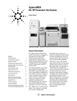 Agilent 4083A DC/RF Parametric Test System Data Sheet General Description Contents General Description 1 Switching Matrix Subsystem 3 Optional Pulse Switch 5 DC Measurement Subsystem SMU 6 Capacitance Measurement Subsystem High-Speed CMU 10 Agilent E4980A LCR Meter 11 Optional Pulse Force Unit 12 RF Measurement Subsystems 12 Linux System Controller 13 System Software 13 Agilent Semiconductor Process Evaluation Core Software (SPECS) 13 Agilent SPECS-FA 13 Parallel Test Capability 13 General Specifications 14 Recommended Conditions for Ultra LowCurrent and Low-Voltage Measurements 15 The Agilent 4083A DC/RF Parametric Test System is designed to perform fast and precise DC measurements, capacitance measurements, Flash cell test, high frequency applications such as ring oscillator measurement, and RF S-parameter and RFCV measurement. The system supports up to eight Source Monitor Units (SMUs). Each SMU is self-calibrating, and can be individually configured to force either current or voltage, as well as simultaneously measure either current or voltage. The system also supports a fully guarded switching matrix customizable from 12 to 48 pins. One special additional pin is dedicated as a chuck connection. The 4083A can be constructed in either a low-current or an ultra low-current configuration, depending upon the type of matrix card specified. Only 4083A models containing the ultra lowcurrent matrix cards can use the high-resolution SMU (HRSMU). The 4083A comes with two RF input ports and the test head has an RF docking interface with 10 RF output ports. An optional 8 x 10 RF matrix is available and measurements from DC to 20 GHz are also possible. The system hardware and software support an Agilent PNA network analyzer for making S-parameter and RFCV measurements. The system software supplies an automatic and interactive calibration tool that enables full two-port SOLT and one-port SOL, and open/ short de-embedding for RF measurement. General Description (continued) An optional High-Speed Capacitance Measurement Unit (HS-CMU) is available for the 4083A, which enables the measurement of capacitance and impedance with unprecedented speed. External instruments can be integrated into the system via six auxiliary input ports or forty-eight extended path inputs. The extended path inputs allow the user to connect external signals directly to the DUT pins. Capacitance/Conductance Measurement Using Optional HS-CMU Another 4083A option is a highfrequency switching matrix with optional integrated semiconductor pulse generator unit control. The high-frequency matrix is organized as two 3 x 24 matrices (six inputs total), and 1 TO 2 furnished cables may be used on each matrix pair to create one 3 x 48 matrix (three inputs in total). The system also has one 1.6 A ground unit. Z/θ and Z/θ - f Measurement unit: HS-CMU Measurement Frequencies: 1 kHz - 2 MHz, 34 points DC Bias Voltage: ±10 V Measurement Functions DC Current, DC Voltage, Capacitance and Conductance, Impedance and Differential voltage and Pulse force. DC Measurements Spot, Sweep, Pulse Bias, and Pulse Sweep. Measurement unit: HRSMU (High Resolution SMU),1 MPSMU (Medium Power SMU and HPSMU (High Power SMU) Measurement range: 1 fA2 to 100 mA, 2 µV to 100 V (using the two low current SMU ports) 10 fA to 1 A3, 2 µV to 200 V 3 (using the 6 standard SMU ports) 1 Can be used only with ultra-low current matrix cards 2 Using HRSMU. Using MPSMU, 10 fA to 100 mA, 2 µV to 100 V 3 Using optional HPSMU. Using MPSMU, 10 fA to 100 mA, 2 µV to 100 V 2 C/G, C/G -V, C/G -V/f Measurement unit: High Speed Capacitance Measurement Unit (HS-CMU) Measurement Frequencies: 1 kHz - 2 MHz, 34 points Measurement range: 1 fF to 100 nF, 0.1 nS to 7.5 mS DC Bias Voltage: ±10 V Impedance Measurements Using Optional HS-CMU Pulse Level (at open load): ±40 V (at 2-level and 3-level) Pulse Period (at 50 Ω load): 350 ns to 10 s with 10 ns resolution Pulse Width (at 50 Ω load): 50 ns to [Period − 50 ns] with 2.5 ns1 or 10 ns2 resolution Pulse Delay (at 50 Ω load): 0 s to [Period − 75 ns] with 2.5 ns1 or 10 ns2 resolution Transition Time Setting Range (at 50 Ω load): 20 ns to 400 ms with 2 ns1 or 8 ns2 resolution Transition Time Minimum (at 50 Ω load): 20 ns3, 30 ns4 1 2 3 4 Capacitance/Conductance Measurements Using Optional Agilent E4980A LCR Meter Measurements: C/G and C/G-V Measurement unit: Agilent E4980A LCR Meter Measurement Frequency: 1 kHz, 10 kHz, 100 kHz, and 1 MHz Measurement range: 1 fF to 100 nF, 0.1 nS to 7.5 mS DC Bias Voltage: ±40 V Two Terminal Differential Voltage Measurements Measurement Unit: Agilent 3458A Measurement range: 0.1 µV to 100 V (only when using ultralow-current matirx cards), or 1 μV to 100 V High-Frequency Pulse Force Option The 4083A cabinet supports an optional high-voltage semiconductor pulse generator unit (HVSPGU) mainframe that contains the SPGU modules. Maximum number of installable HV-SPGU modules: 5 Number of channels per HV-SPGU: 2 Pulse level support: Each HV-SPGU channel supports 2level and 3-level pulses Transition time setting ≤10 μs Transition time setting >10 μs |Vamp| ≤10 V (to 50 Ω) 10 V <|Vamp| ≤20 V (to 50 Ω) Switching Matrix Measurement Pins Between 12 and 48 pins Note: One additional pin is dedicated for the prober chuck connection. Switching Matrix Instrument Ports Up to eight SMUs One ground unit (GNDU) Eight auxiliary (AUX) ports (Two ports are used for HS-CMU) 48 extended paths Six optional high-frequency (HF) ports and pulse switch input/ output ports Test Head RF Measurement Ports Up to 10 RF 20 GHz S-Parameter Measurements Supported network analyzer: Agilent E8362B PNA Series Network Analyzer Test Frequencies: 10 MHz to 20 GHz (E8362B) RF Matrix Option Number of Input Ports: 8 Number of Output Ports: 10 Frequency Range: DC to 20 GHz Switching Matrix Subsystem Maximum DUT Pins 48 output pins plus one pin for the prober chuck connection (triaxial connector). Two types of DC switching matrix ca